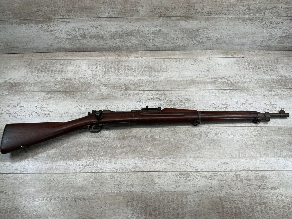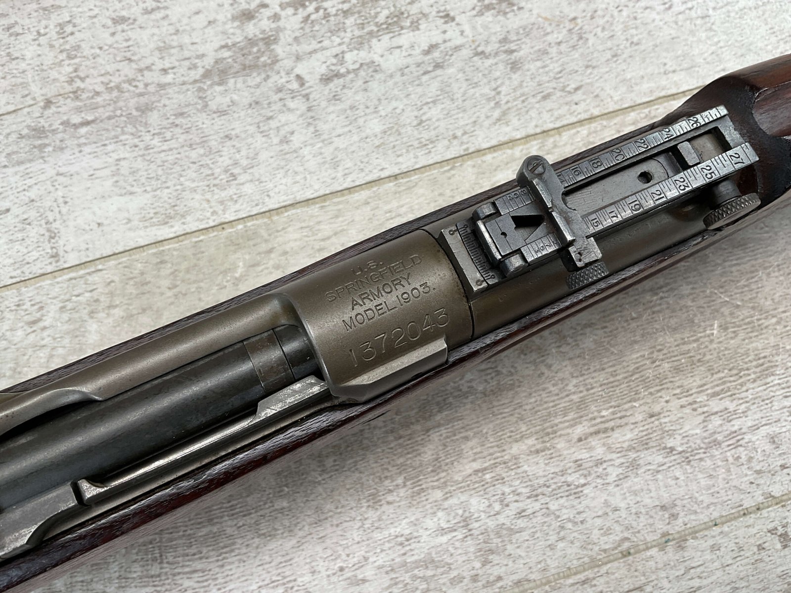 SPRINGFIELD ARMORY 1903 30-06 BOLT ACTION RIFLE #1372043, H.S. (HIGH STANDARD) 1931 MFR ACCORDING TO SERIAL NUMBER, ARSENAL REBARRELED IN WWII, 24″ BBL, GOOD BORE W/FROSTING IN GROOVES & GOOD RIFLING, SCANT STOCK W/NORMAL DINGS/WEAR & ARSENAL REBUILD STAMP, ME- 1.5, VERY NICE OVERALL