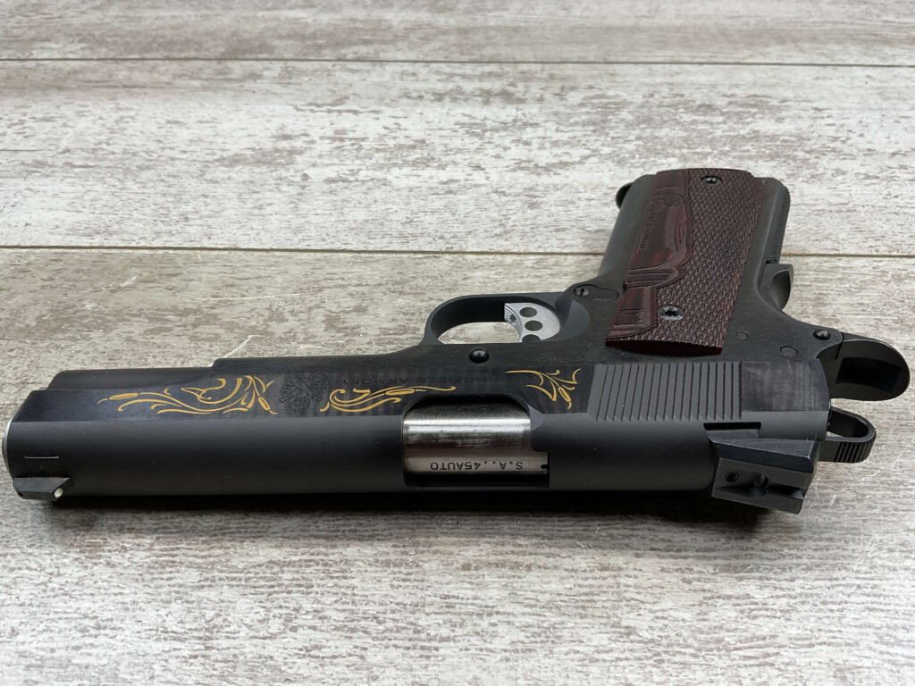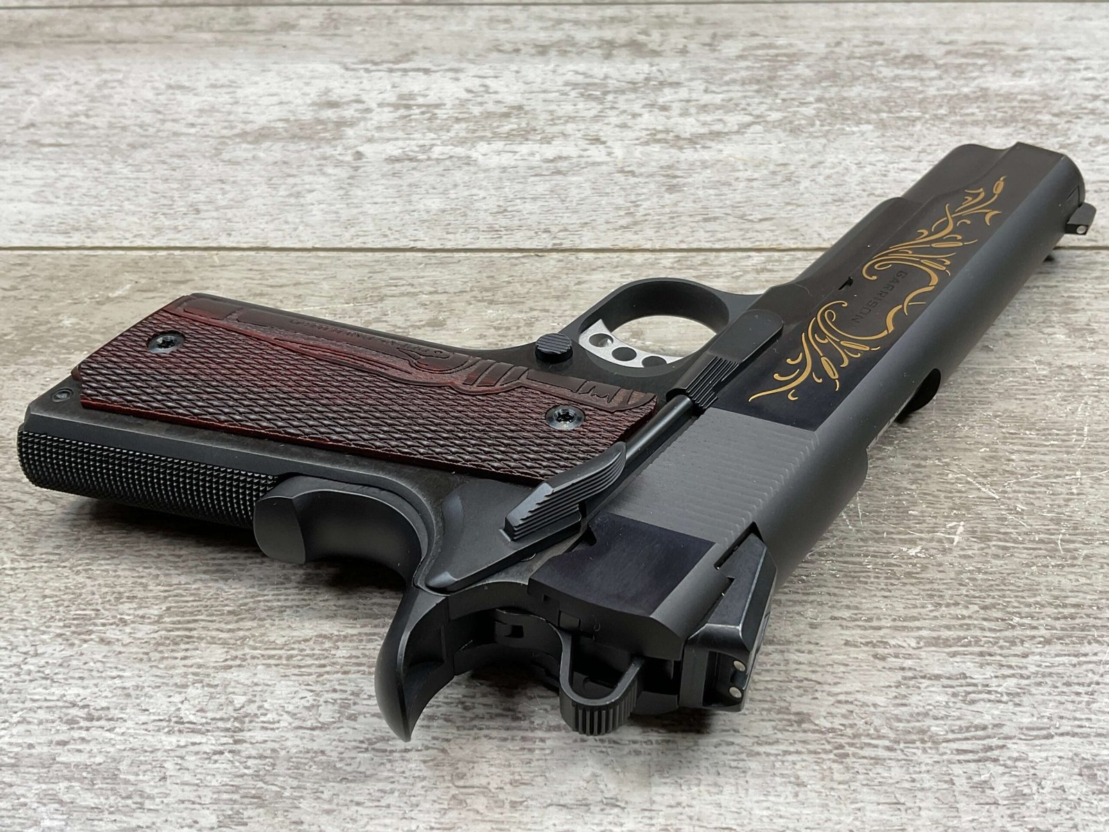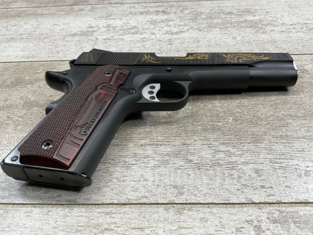 SPRINGFIELD ARMORY 1911 GARRISON DUCKS UNLIMITED .45 AUTO PISTOL, NEVER FIRED, #782552, COMES WITH LOCK, SOFT CASE, ONE MAG, AND MANUALS. HAS BEAUTIFUL MARKINGS ON GUN INCLUDING DUCK, DUCKS UNLIMITED WOODEN & ENGRAVED GRIPS, LEFT SLIDE MARKED “GARRISON”, RIGHT SLIDE MARKED “SPRINGFIELD ARMORY” W/ LOGO, UNDER RIGHT SLIDE MARKED “SI GENESEO IL. USA / NM 782552”, ONE MAG MARKED “.45 ACP”, TRULY A VERY NEAT AND COLLECTIBLE FIND!