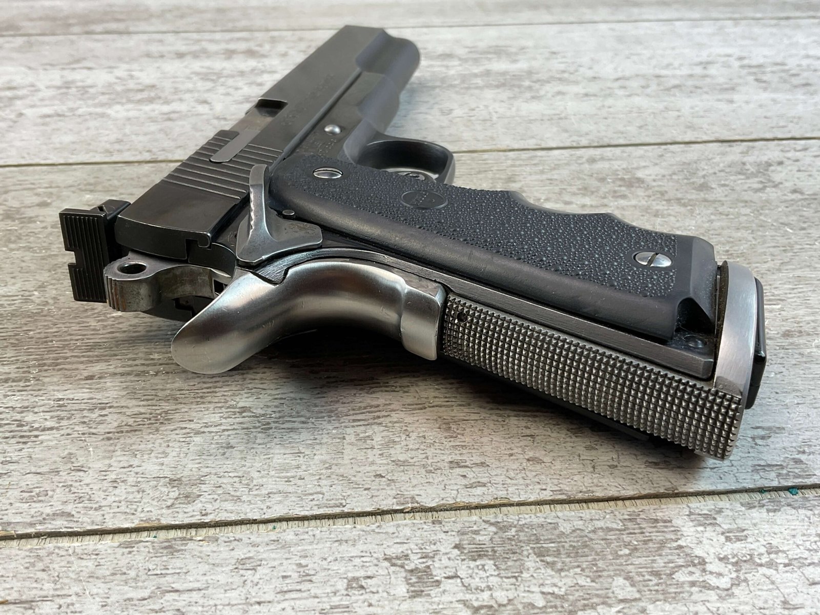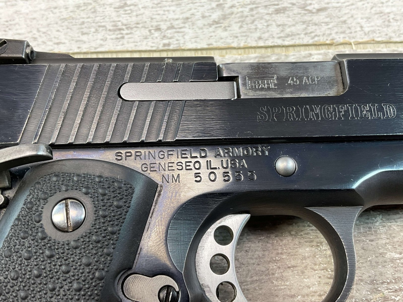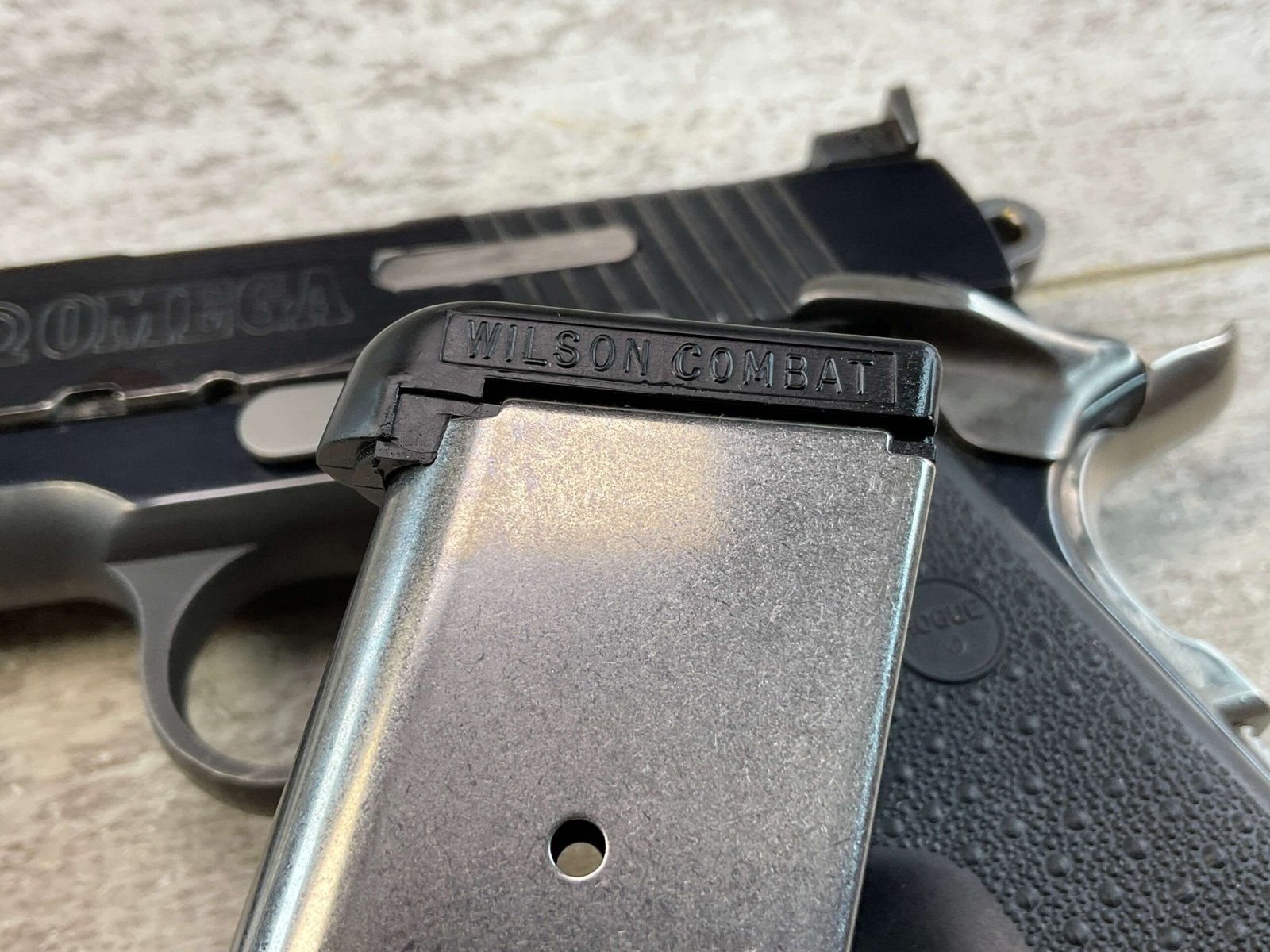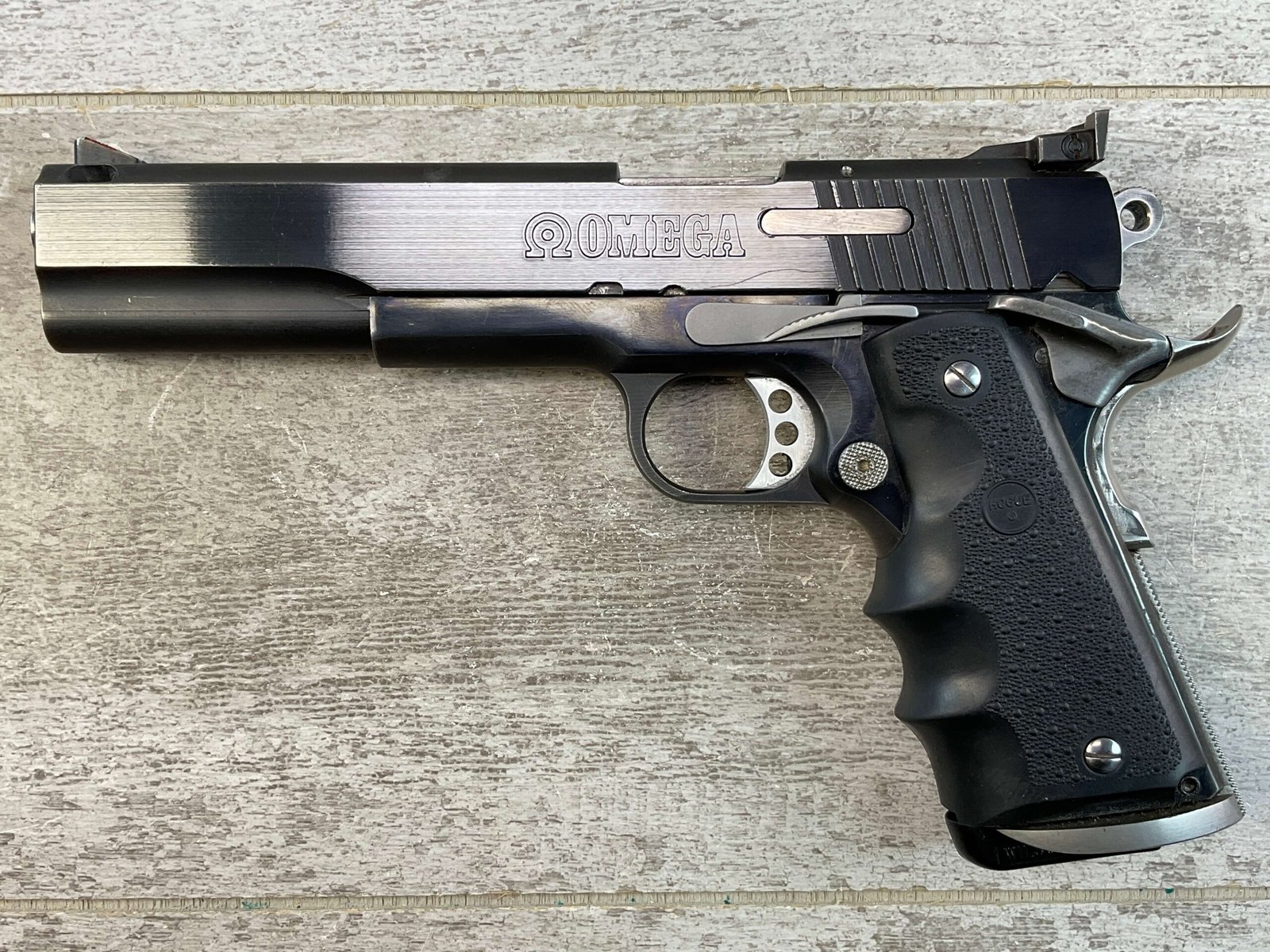 SPRINGFIELD ARMORY OMEGA LS .45 ACP SEMI AUTO PISTOL, JAMES EARL JONES COLLECTION #NM50555, 6″ PORTED BARREL W/ POLYGONAL RIFLING, EXC MIRROR BORE & RIFLING, VG BLUE FINISH ON SLIDE & FRAME W/ 1 SCRATCH FROM TAKEDOWN, EXC HOGUE RUBBER GRIPS, 1 WILSON COMBAT 7 ROUND MAGAZINE, PETERS STAHL ADJ REAR SIGHT & BLADE FRONT, DUAL EXTRACTORS, TUNED & POLISHED, CRISP 3 HOLE TRIGGER, OVERSIZED MAG WELL, GREAT TARGET GUN, CONDITION AS SHOWN IN PICTURES, FROM THE JAMES EARL JONES “FAVORITES” COLLECTION W/ CERTIFICATE OF AUTHENTICITY.