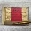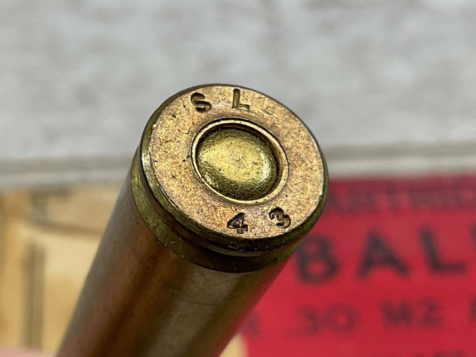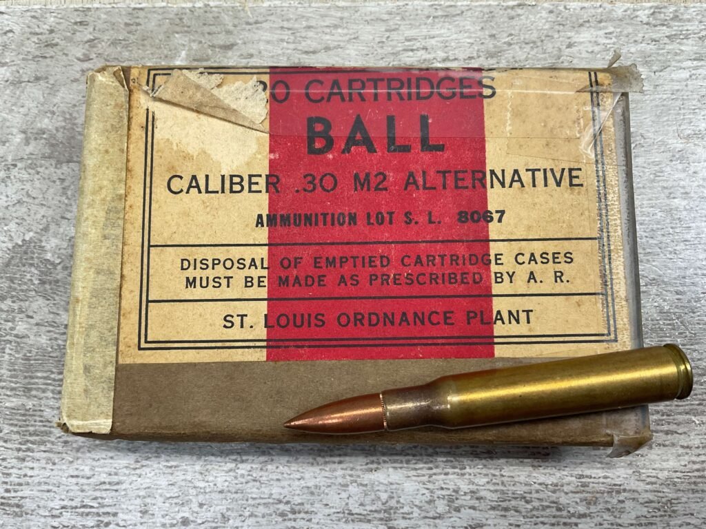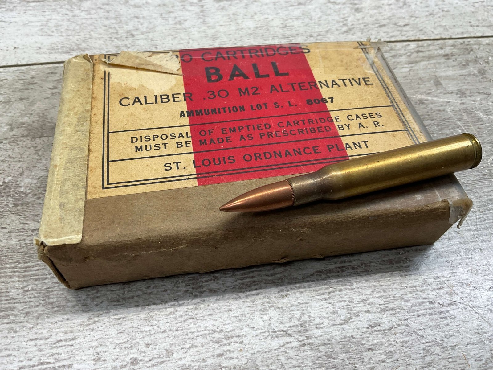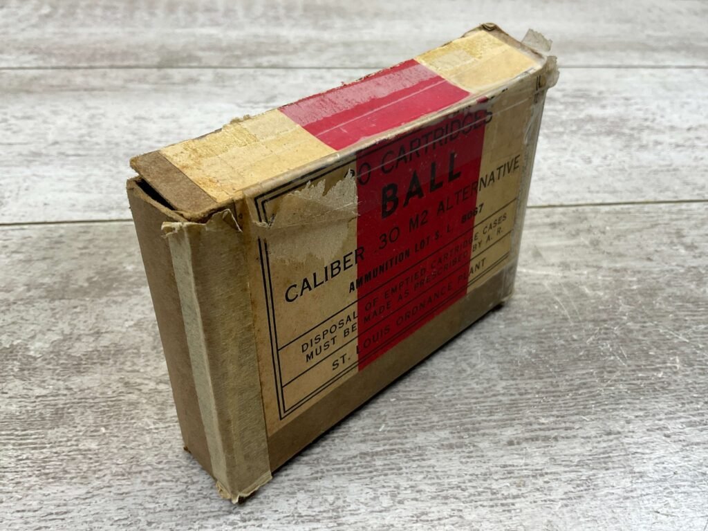 ST. LOUIS ORDNANCE PLANT WWII .30 CAL M2 ALTERNATIVE BALL AMMO, BOX IS OPENED AND IN NOT GREAT CONDITION WITH TAPE OVER SIDES (CLEAR AND YELLOW TAPE), TOP FLAP IS INTACT BUT TAPED ON, AMMO INSIDE CONTAINS HEADSTAMP “SL / 43”, QUANTITY OF 13 LIVE ROUNDS AND 3 EMPTY/USED.