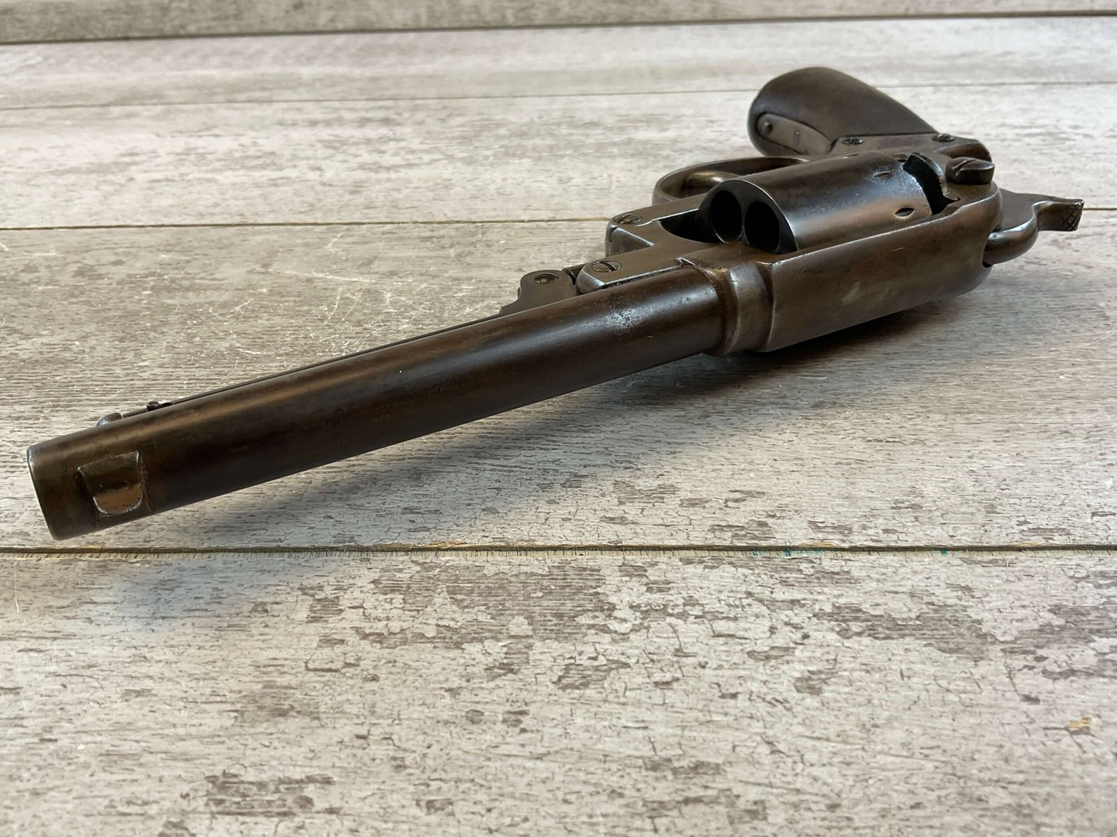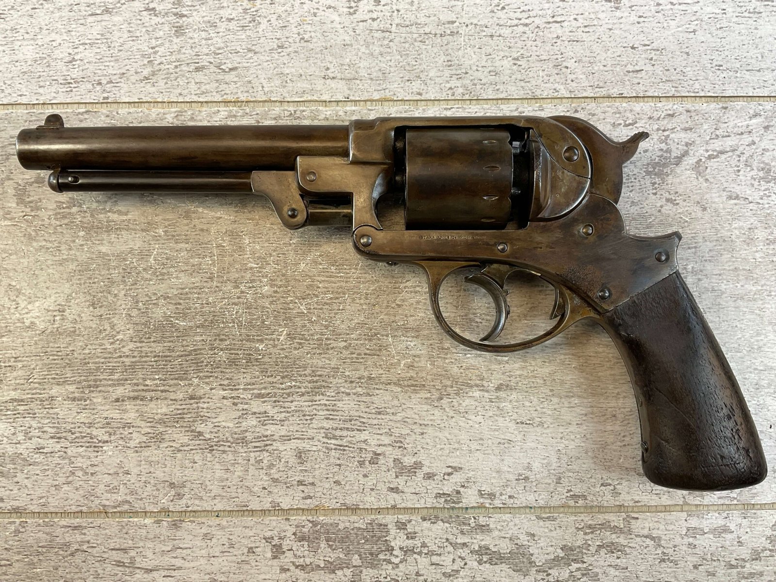 STARR MODEL 1858 DOUBLE ACTION .44 CAL REVOLVER #11813, ALL MATCHING, 6″ BARREL, 6 SHOT .44 CAL CYLINDER, FAIR BORE & RIFLING W/ FROSTING THROUGHOUT, FINISH TURNING PLU/BROWN PATINA, GOOD 1 PIECE SMOOTH WALNUT GRIPS W/ NO CRACKS, CONDITION AS SHOWN IN PICTURES, FROM THE JAMES EARL JONES “FAVORITES” COLLECTION W/ CERTIFICATE OF AUTHENTICITY.