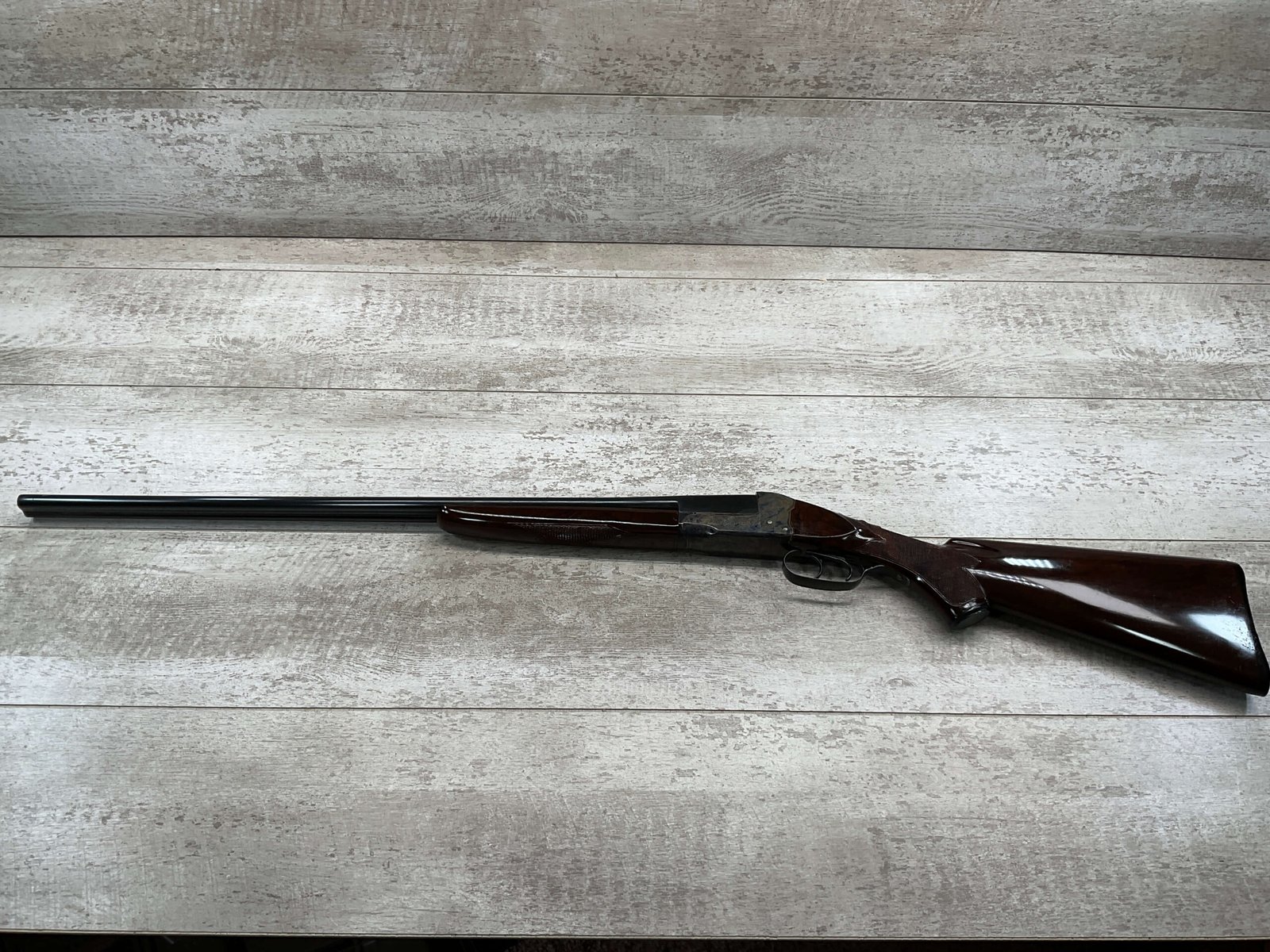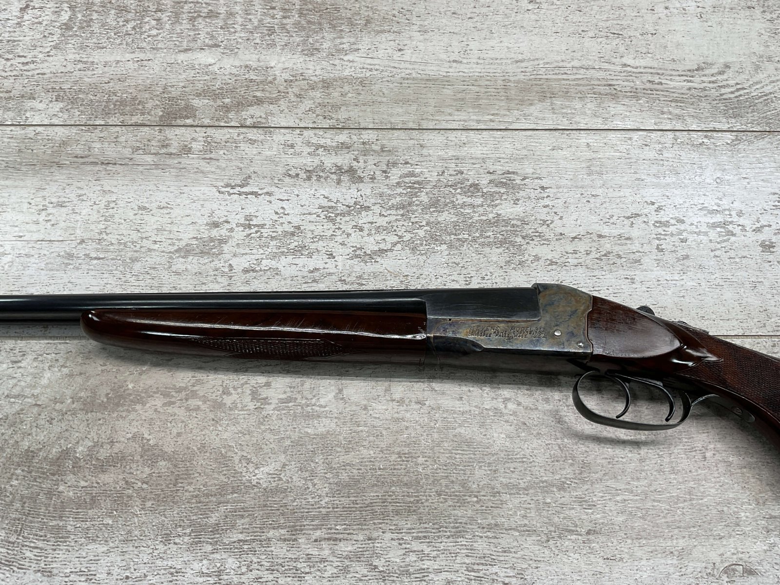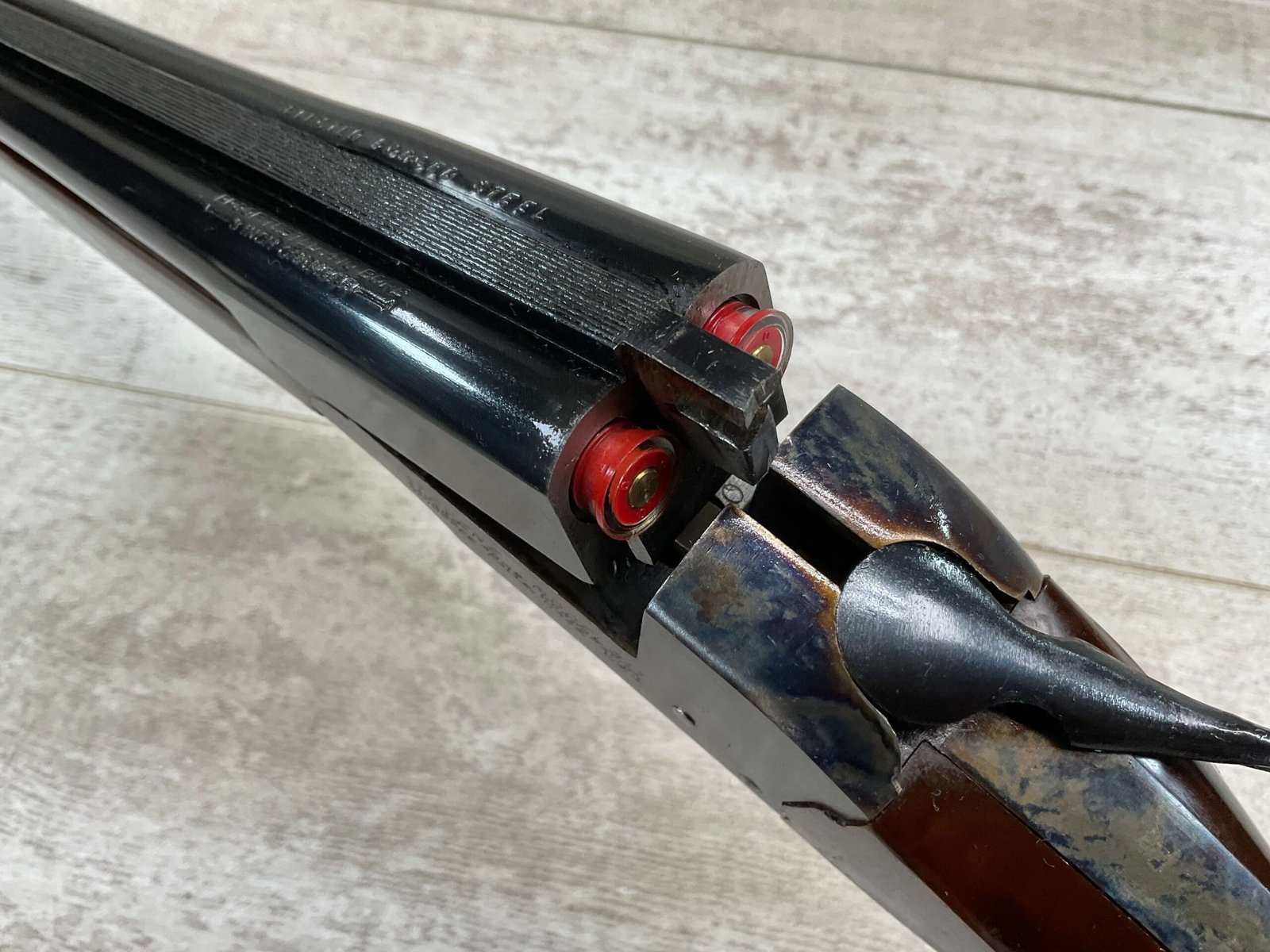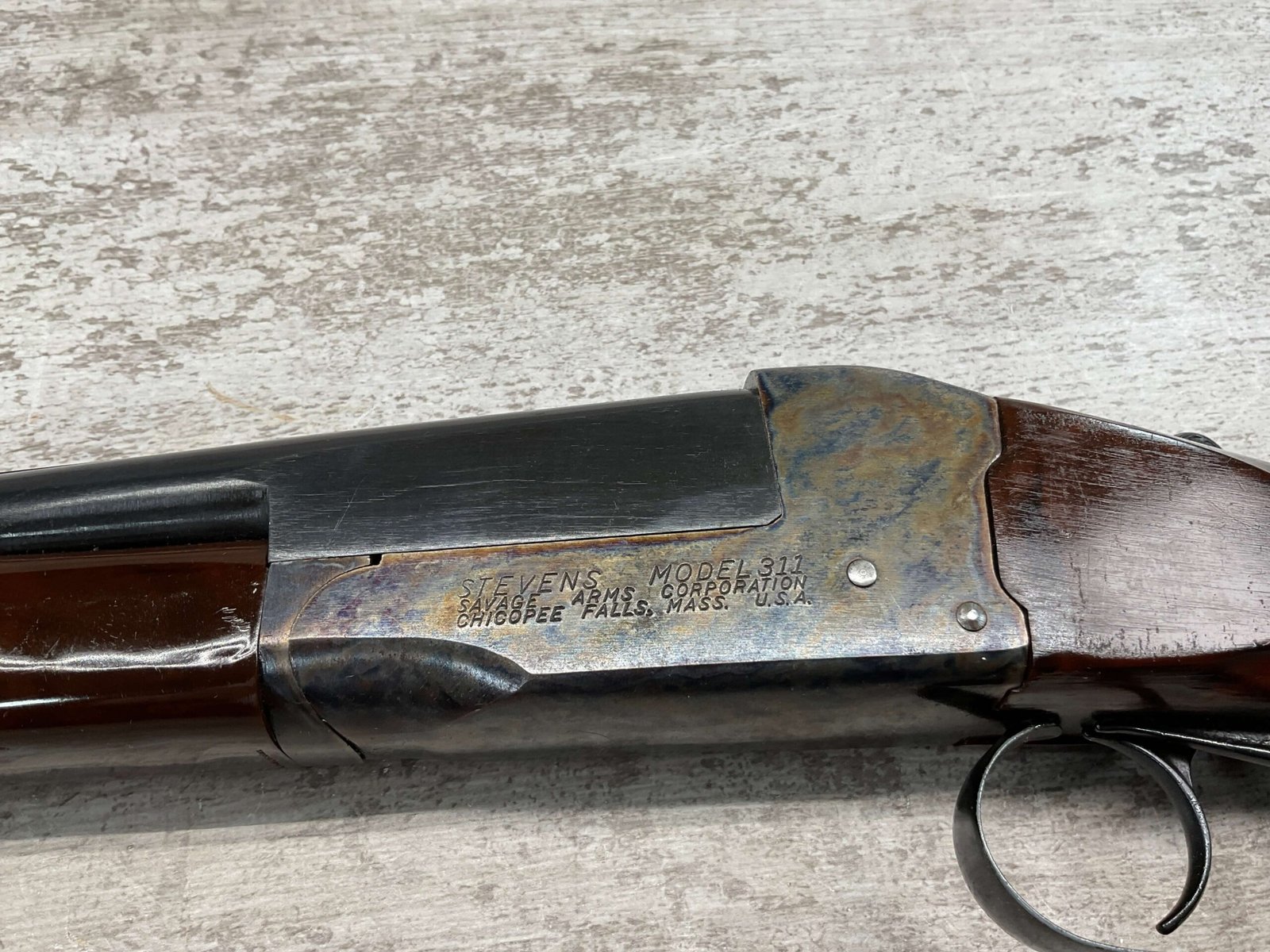 STEVENS MODEL 311 410GA SXS BREAK ACTION SHOTGUN #NSN, 3″ CHAMBER, 26″ ROUND BARREL, BRIGHT MINTY SMOOTH BORE 10/10, EXC BLUE FINISH 10/10, RECEIVER & BREAK IS CASE HARDENED, FRONT FIXED BEAD, TRIGGER GUARD SHOWS HIGH EDGE WEAR, STOCK & FOREARM ARE IN EXC CONDITION, MANUFACTURED OUT OF TENITE, A COMPOSITE PLASTIC W/MINOR SCUFFS FROM NORMAL WEAR AND USE, LOP 14″, MANUFACTURED IN CHICOPEE MASS. OVERALL 95%+ GUN.
