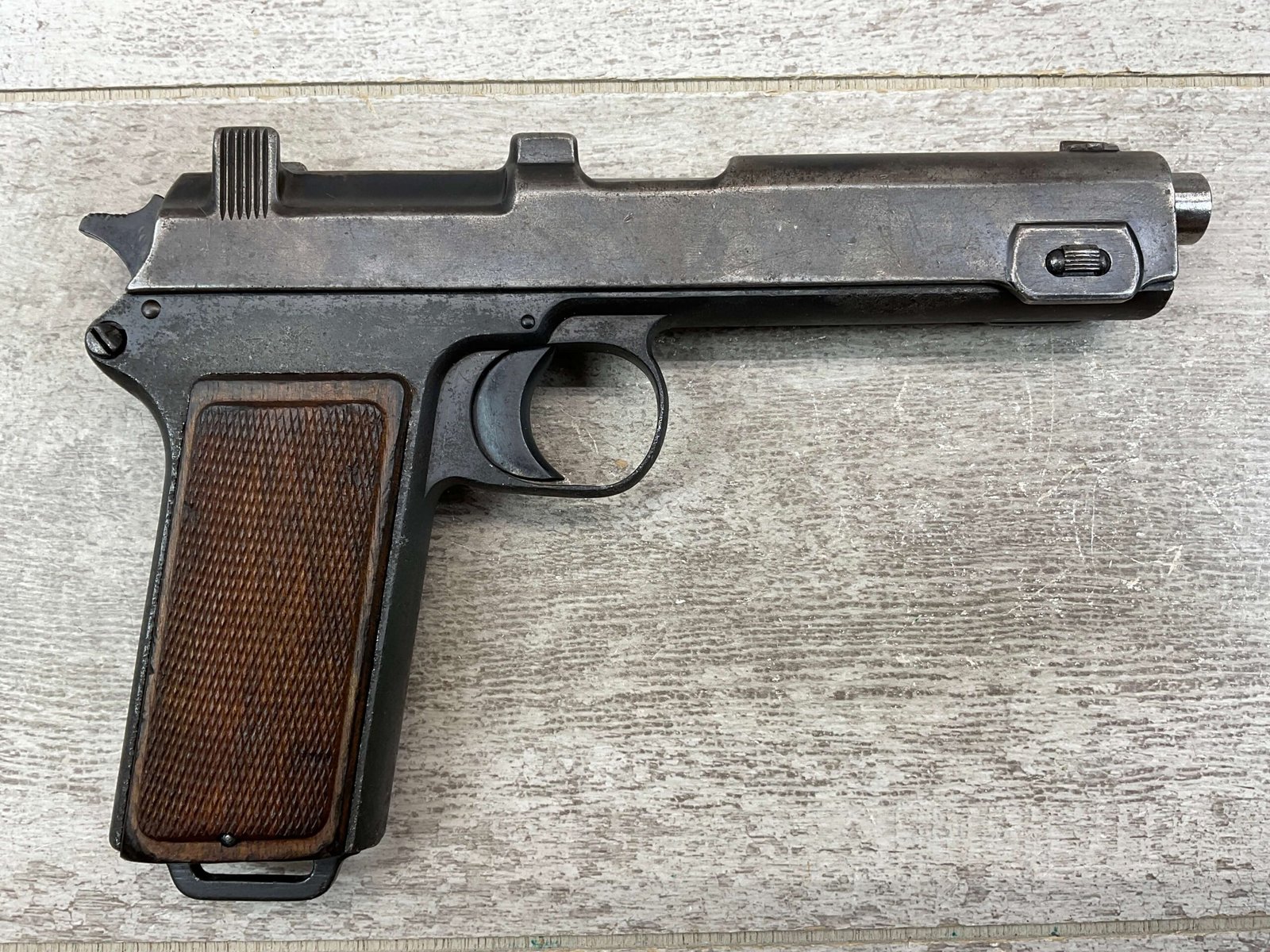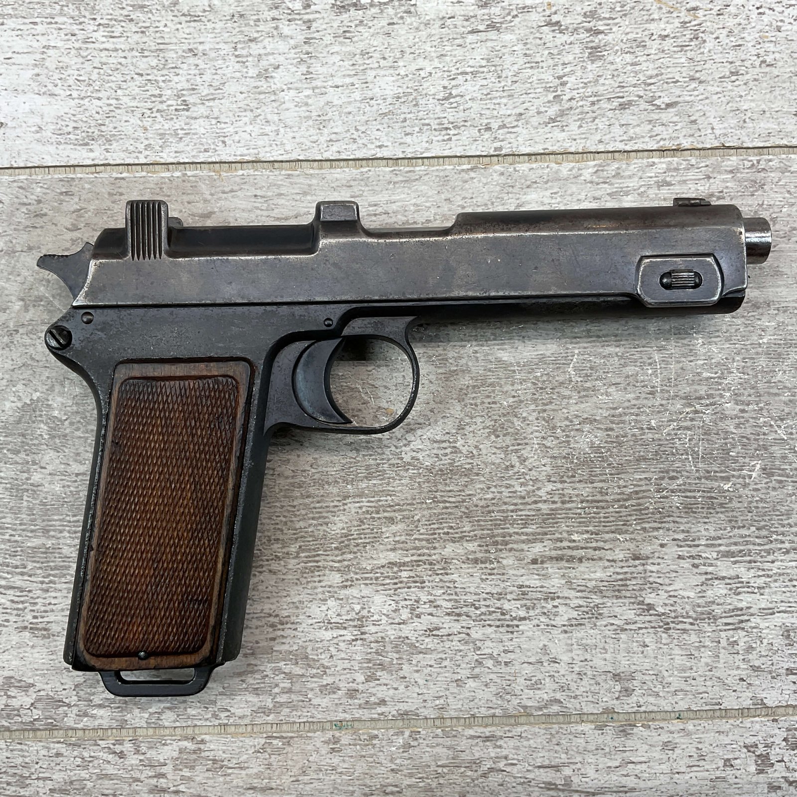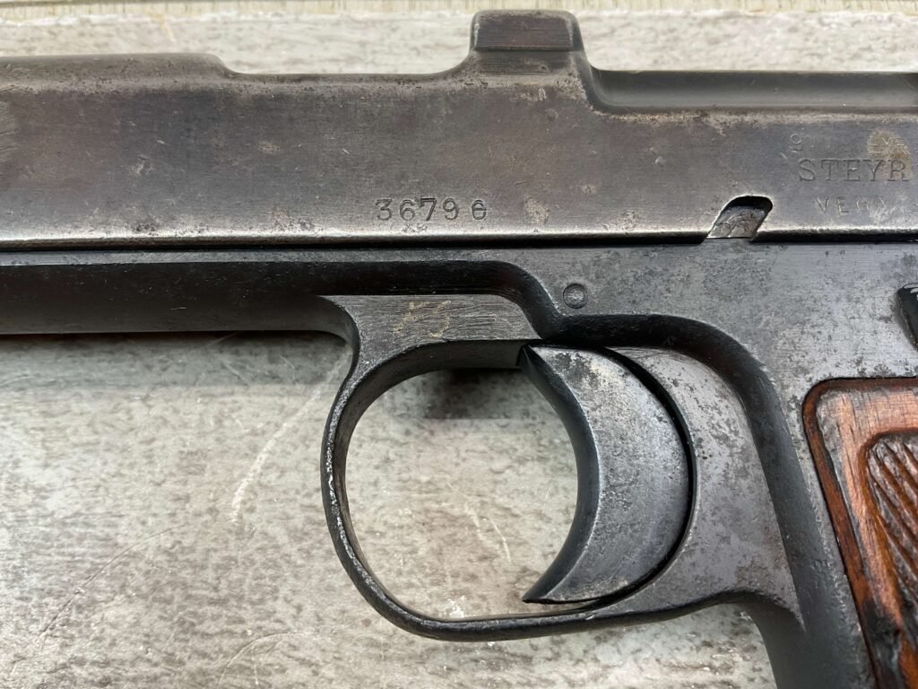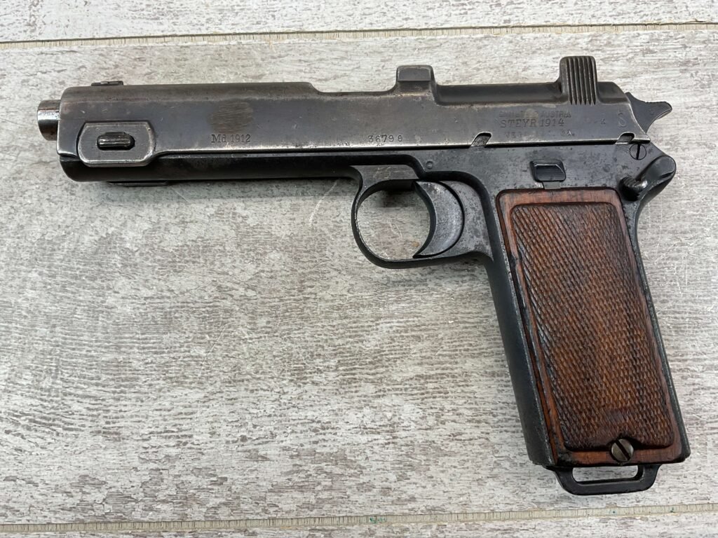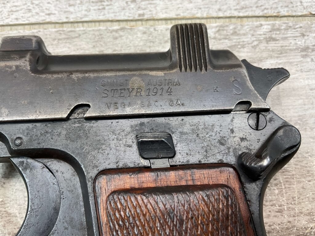 STEYR 1912 9X23MM SEMI AUTO PISTOL, 1914 MFR, #3679e, ORIGINAL BLUE FINISH W/ FINISH LOSS & PITTING AROUND THE GRIPS, GOOD CHECKERED WALNUT GRIPS W/ WEAR, DARK POOR BORE & FAIR RIFLING, NON MATCHING BARREL, LEFT SLIDE MARKED & IMPORT MARKED “9MM STEYR AUSTRIA / STEYR 1914 / VEGA, SAC. CA.”, ABOVE LEFT TRIGGER MARKED “FS”, TOP OF LEFT SIDE MARKED “Md 1912” WITH ETCHED OUT CROWN MARKING, GREAT SHOOTER!