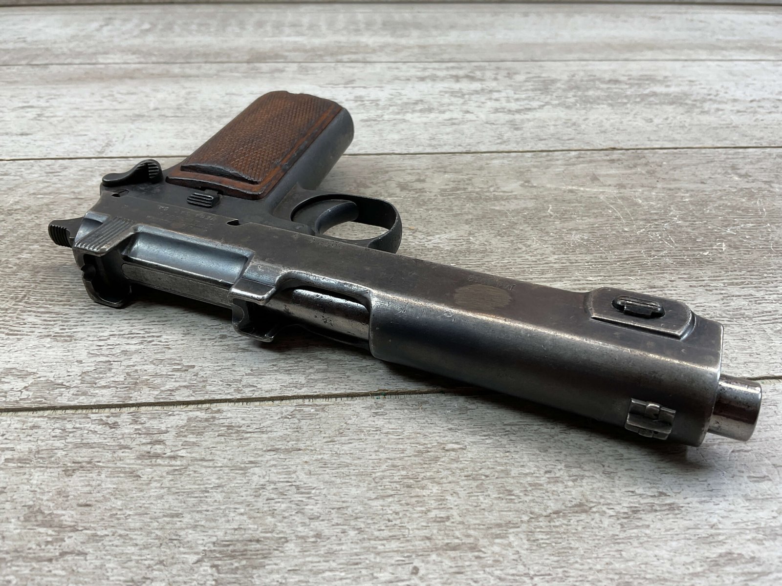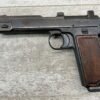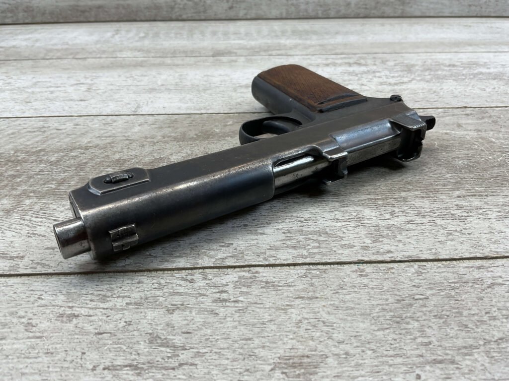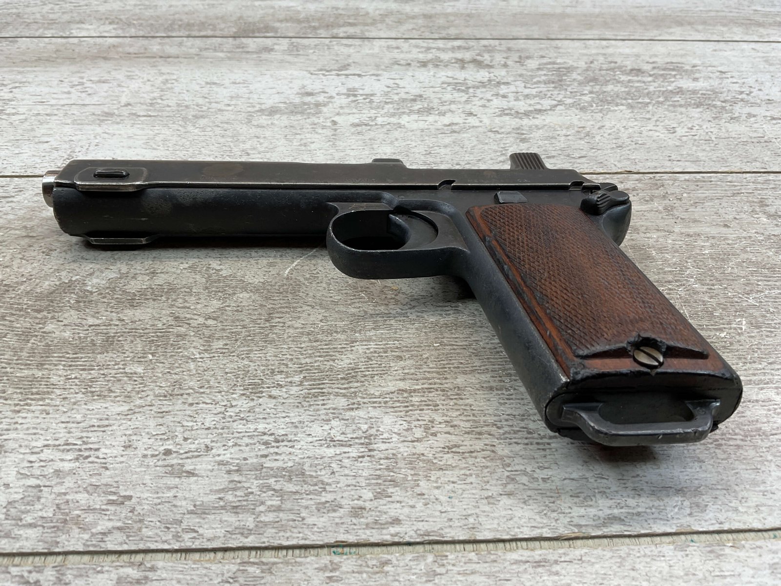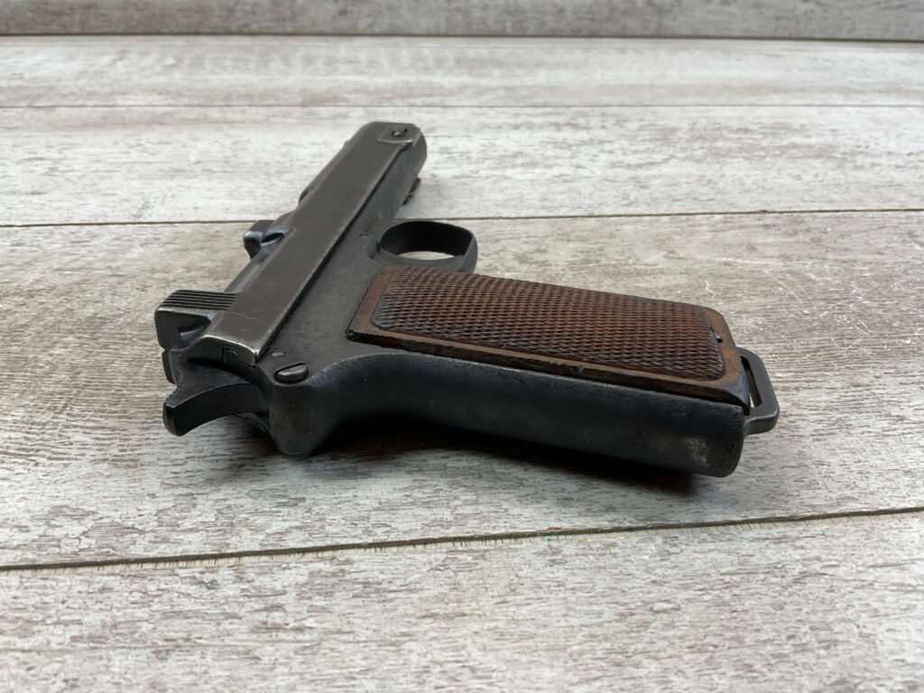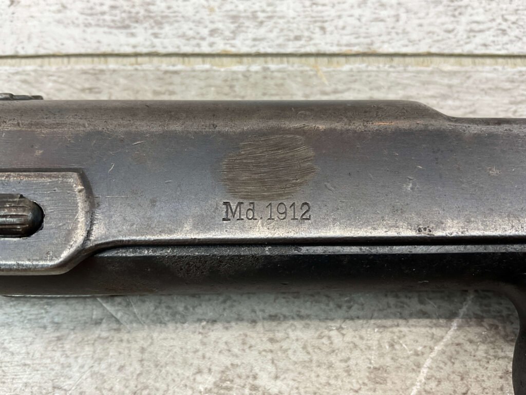 STEYR 1912 9X23MM SEMI AUTO PISTOL, 1914 MFR, #3679e, ORIGINAL BLUE FINISH W/ FINISH LOSS & PITTING AROUND THE GRIPS, GOOD CHECKERED WALNUT GRIPS W/ WEAR, DARK POOR BORE & FAIR RIFLING, NON MATCHING BARREL, LEFT SLIDE MARKED & IMPORT MARKED “9MM STEYR AUSTRIA / STEYR 1914 / VEGA, SAC. CA.”, ABOVE LEFT TRIGGER MARKED “FS”, TOP OF LEFT SIDE MARKED “Md 1912” WITH ETCHED OUT CROWN MARKING, GREAT SHOOTER!