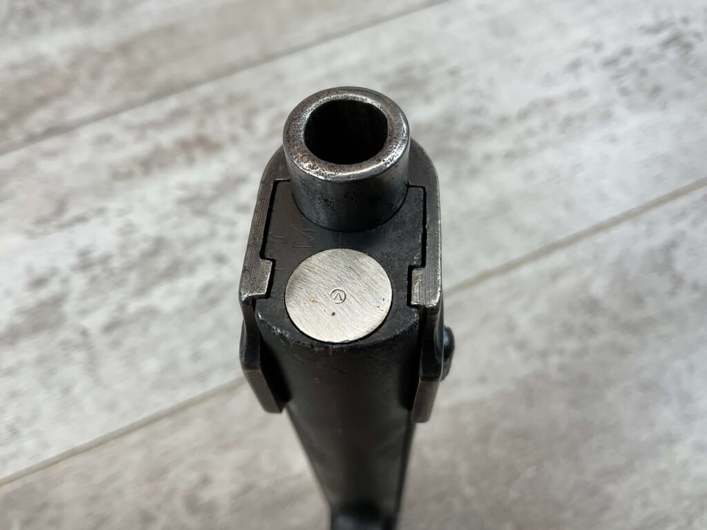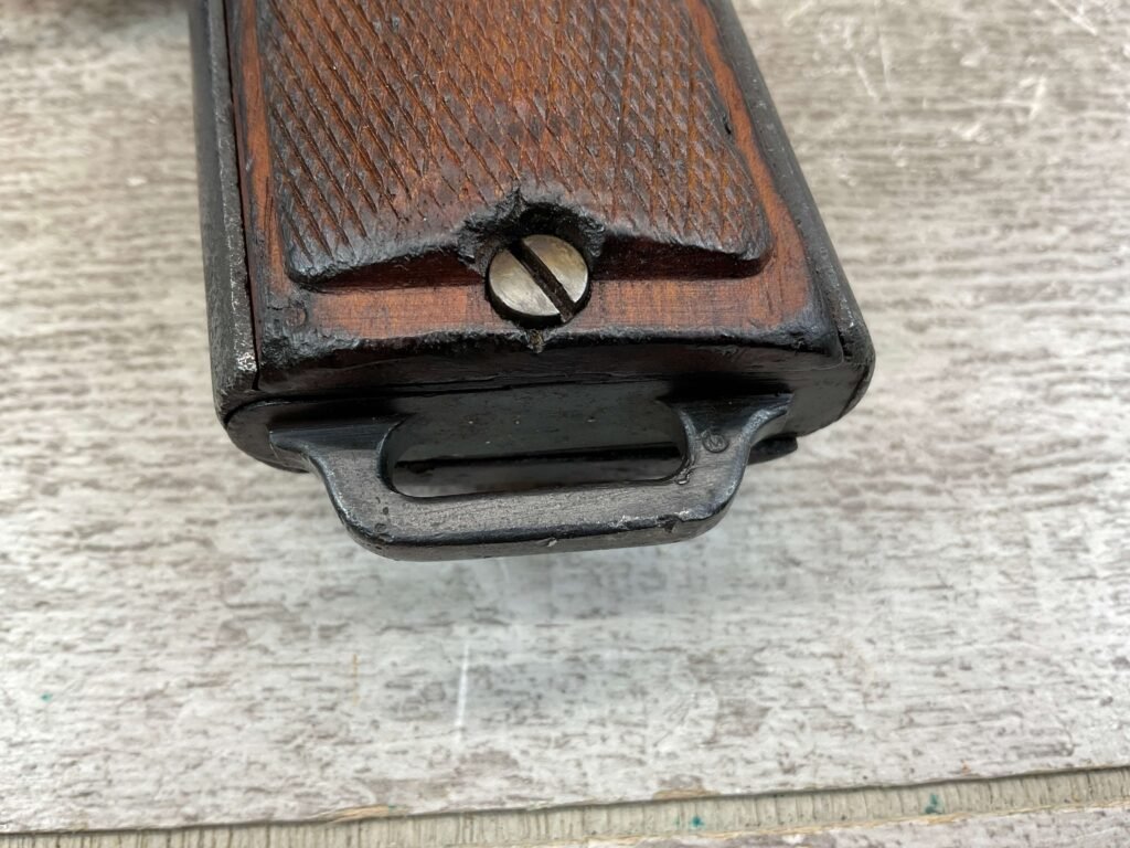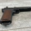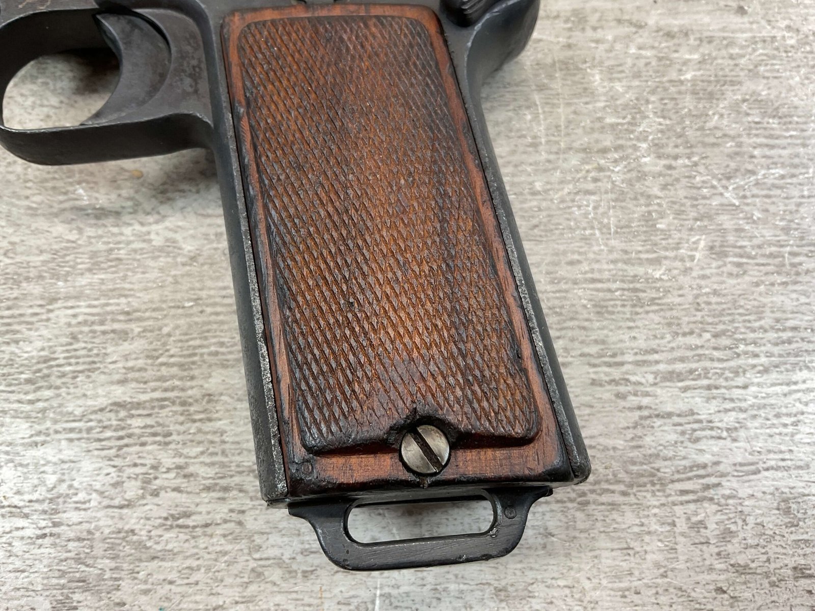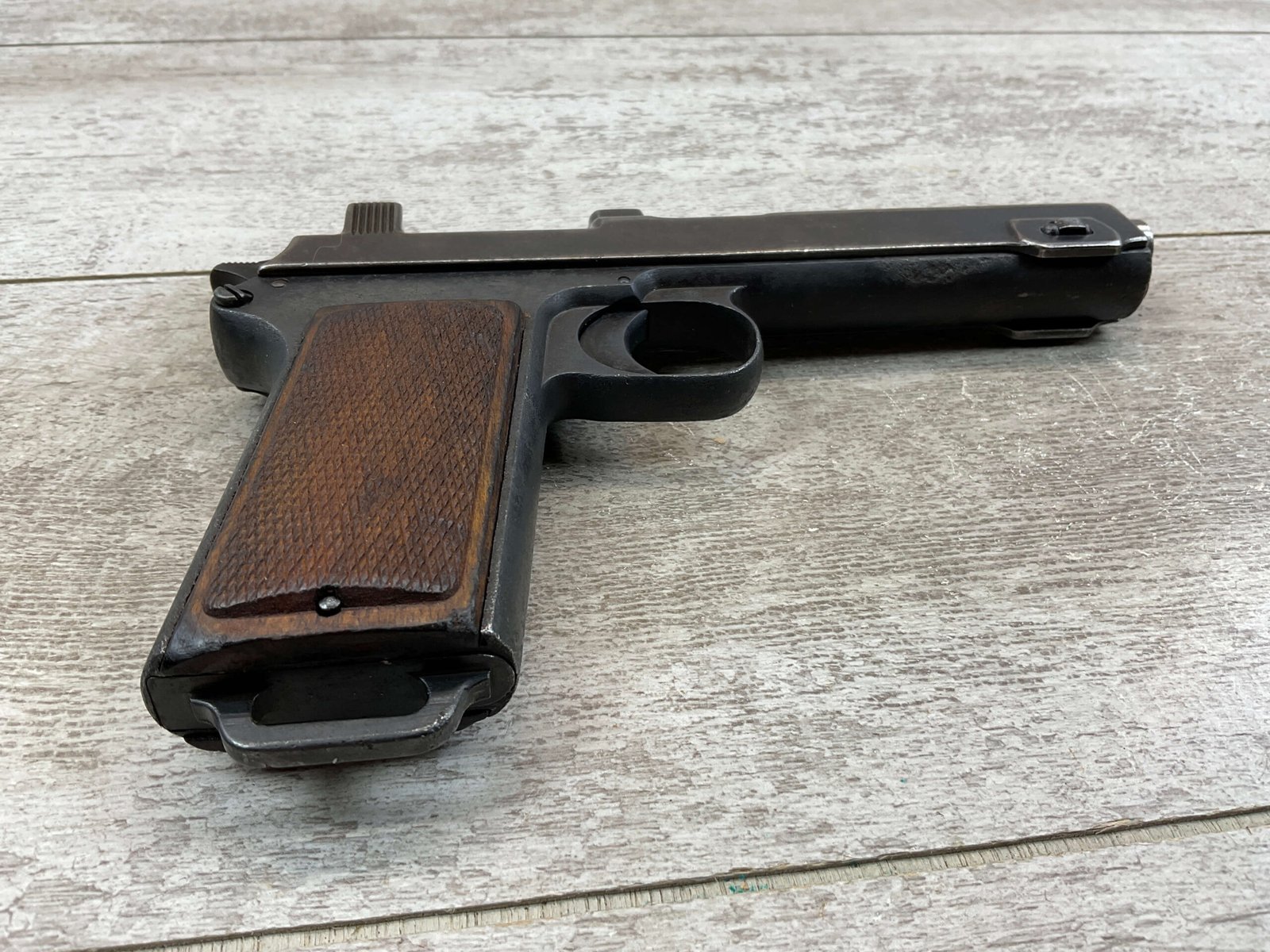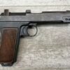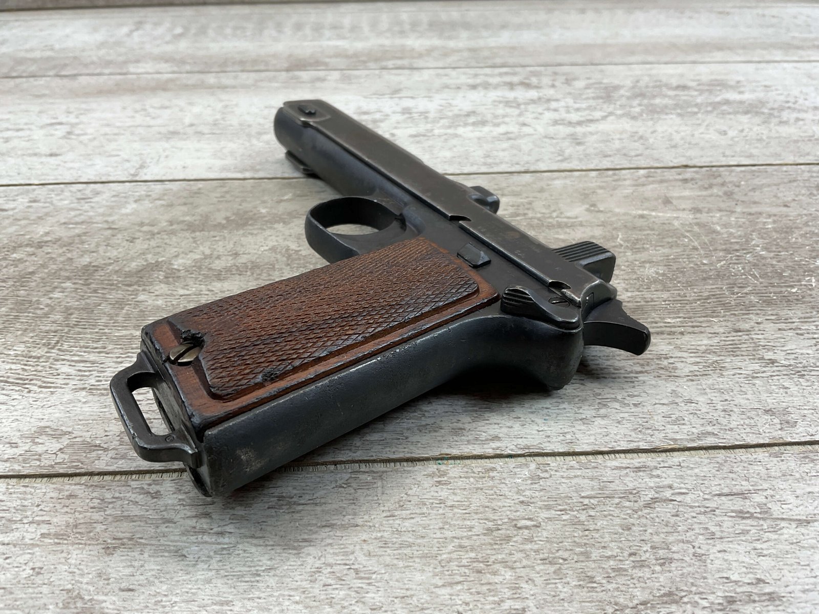 STEYR 1912 9X23MM SEMI AUTO PISTOL, 1914 MFR, #3679e, ORIGINAL BLUE FINISH W/ FINISH LOSS & PITTING AROUND THE GRIPS, GOOD CHECKERED WALNUT GRIPS W/ WEAR, DARK POOR BORE & FAIR RIFLING, NON MATCHING BARREL, LEFT SLIDE MARKED & IMPORT MARKED “9MM STEYR AUSTRIA / STEYR 1914 / VEGA, SAC. CA.”, ABOVE LEFT TRIGGER MARKED “FS”, TOP OF LEFT SIDE MARKED “Md 1912” WITH ETCHED OUT CROWN MARKING, GREAT SHOOTER!