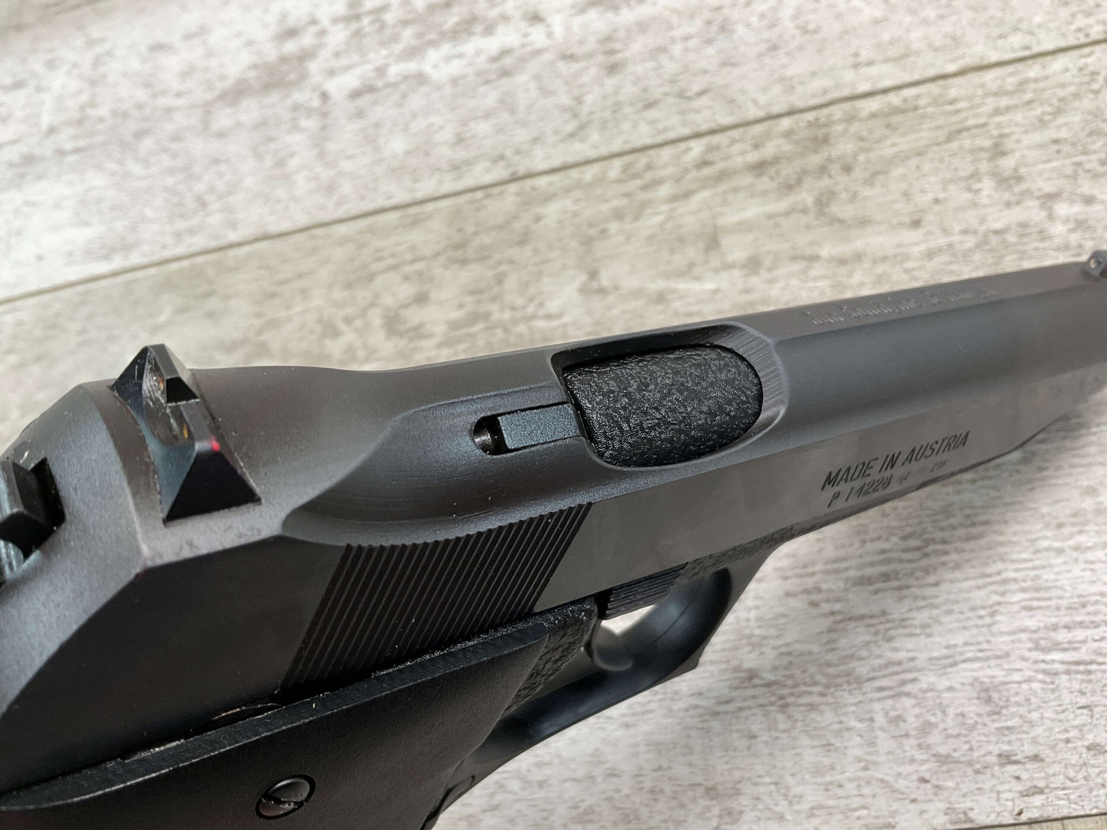 The Steyr GB is known for its ergonomic grip design, which fits comfortably in the hand and helps mitigate recoil. It also features a low bore axis, which contributes to reduced muzzle flip and improved control during rapid fire.