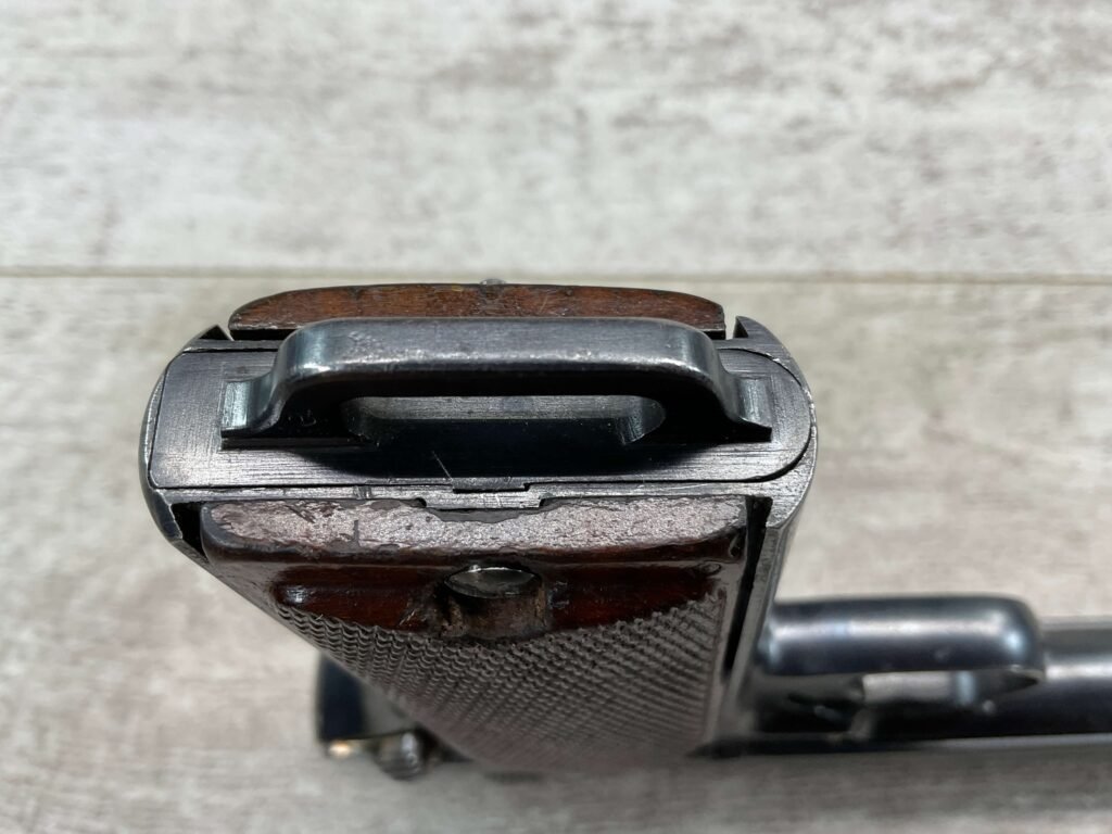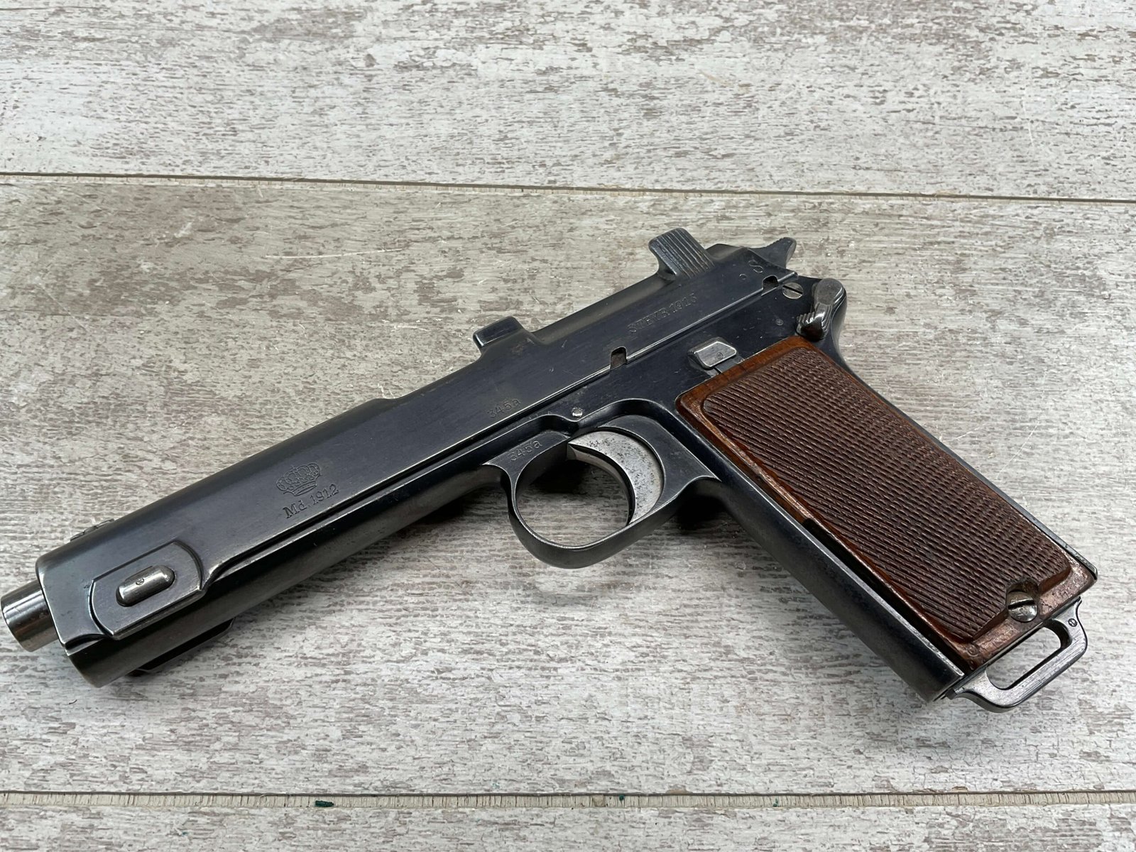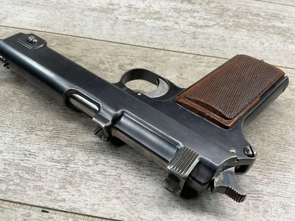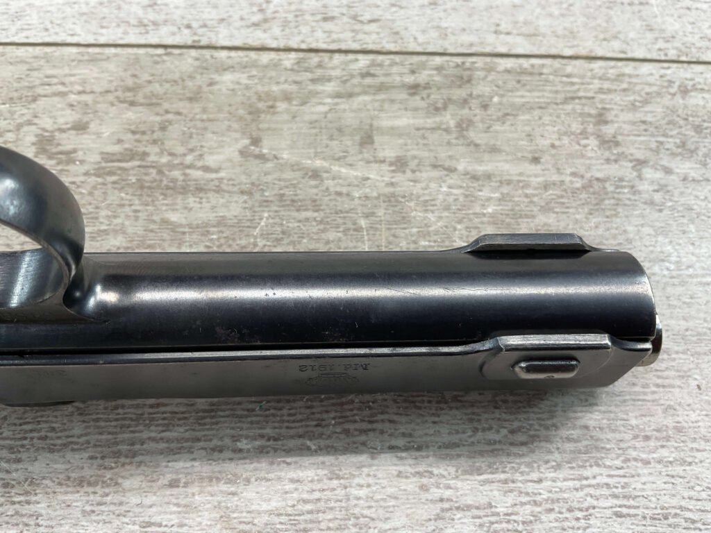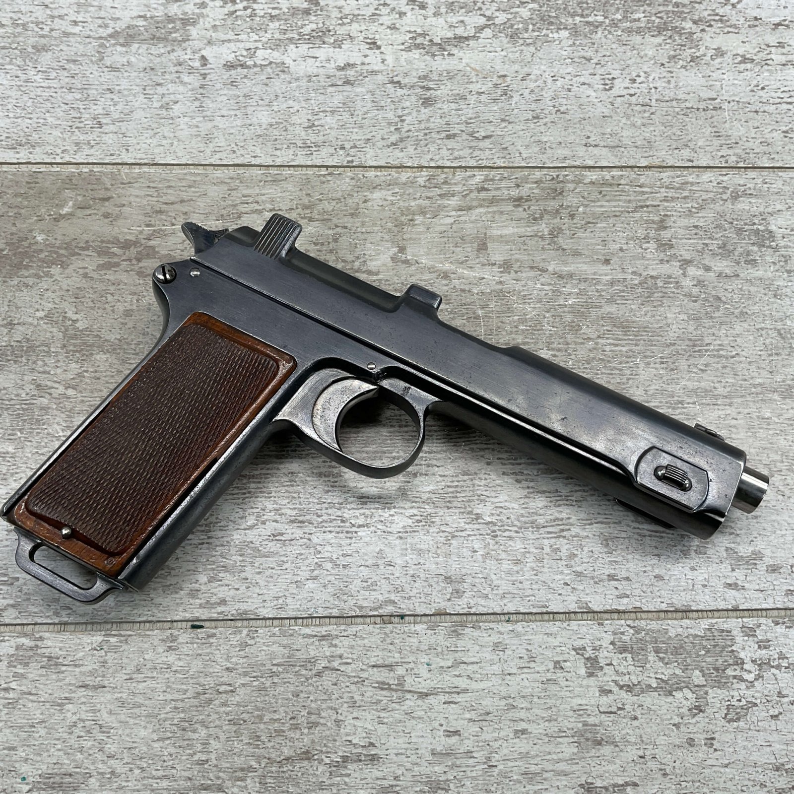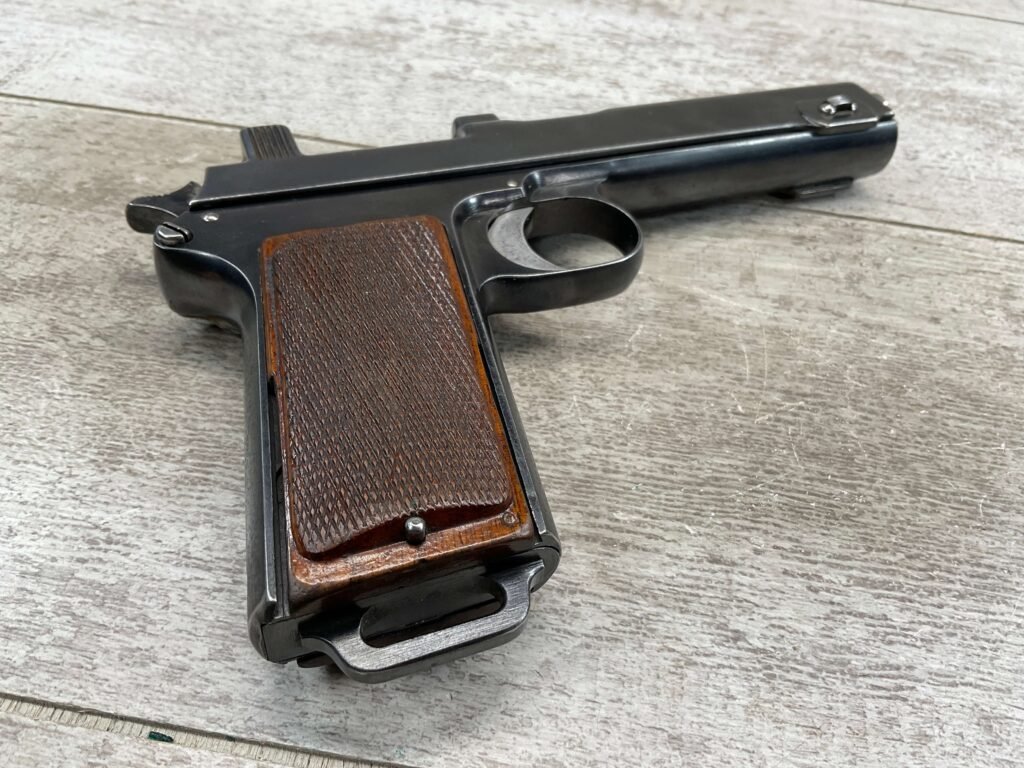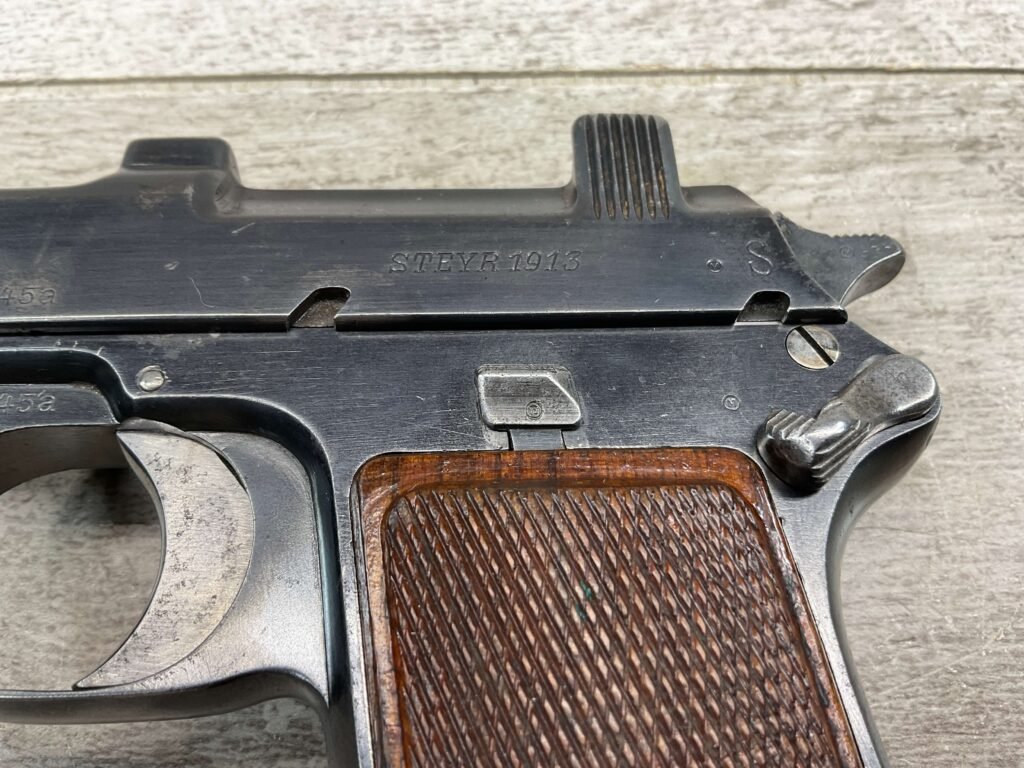 STEYR M1912 9MM STEYR SEMI AUTO PISTOL #345a, STEYR HAHN, MODEL 1912, 9MM STEYR, 1913 DATE, 5″ BARREL W/FROSTING IN GROOVES & GOOD RIFLING, ALL MATCHING, ROMANIAN CONTRACT “CROWN/MD.1912” ON LEFT SIDE OF SLIDE, NO “08” ON LEFT SIDE OF SLIDE INDICATING THAT THIS ONE HAS NOT BEEN CONVERTED TO 9MM LUGER, LIGHT FRECKLING IN AREAS ON SLIDE AND RECIEVER, CORRECT “K” PROOFS, EXC ORIGINAL CHECKERED WOOD GRIPS W/ LIGHT WEAR