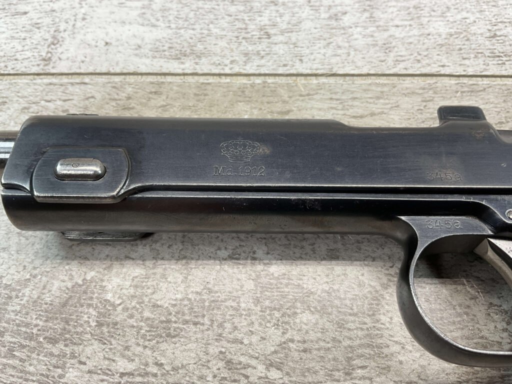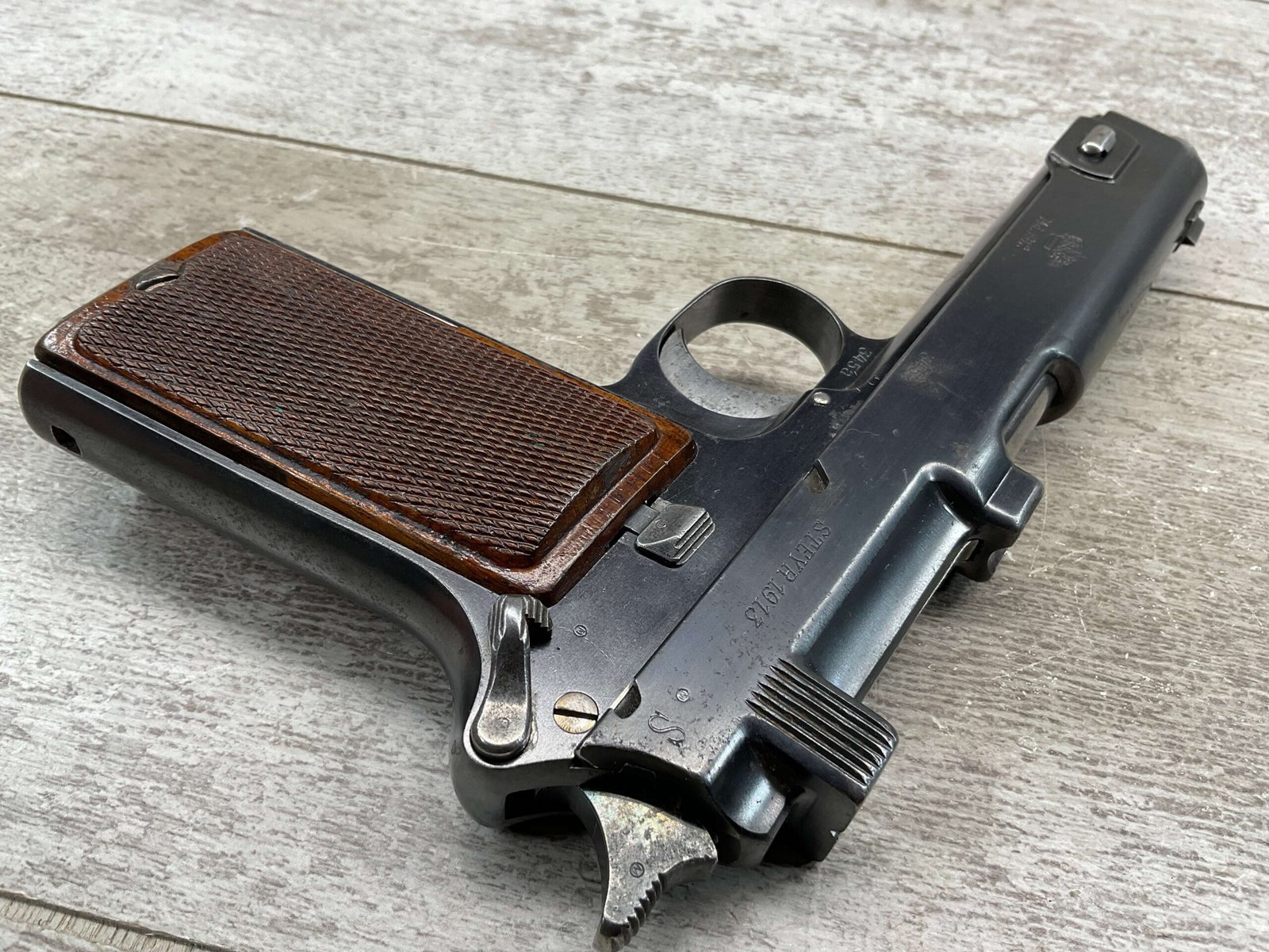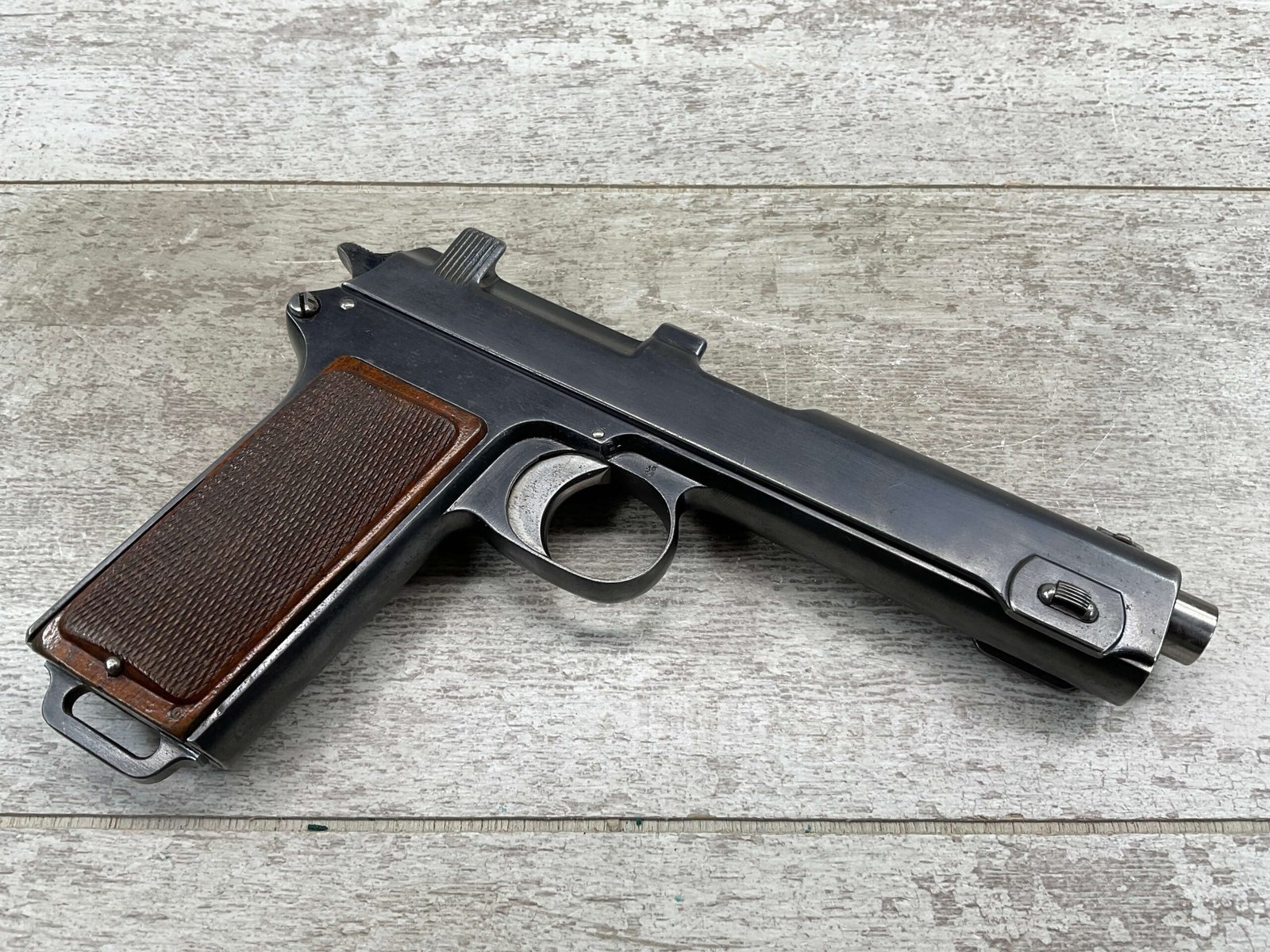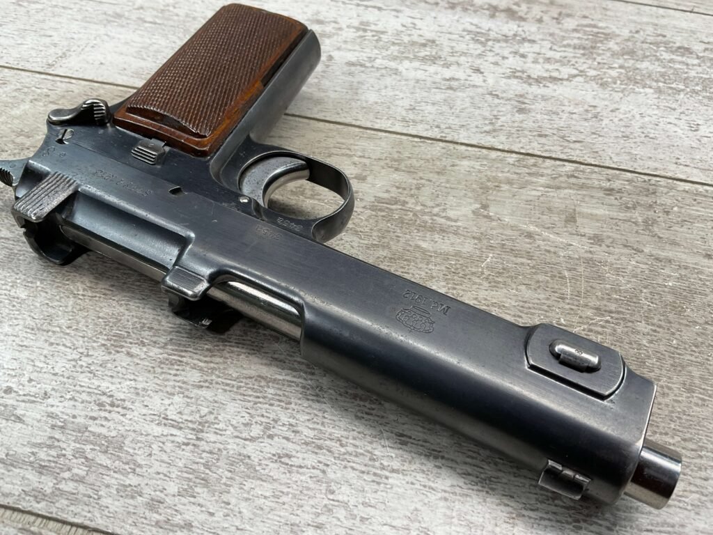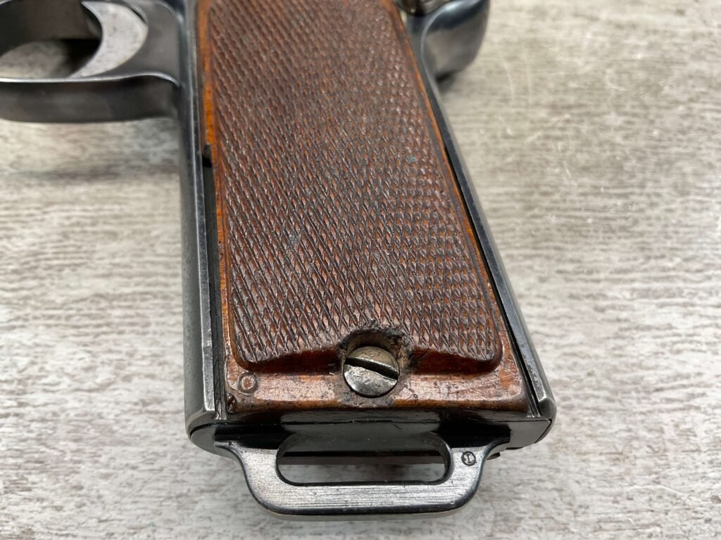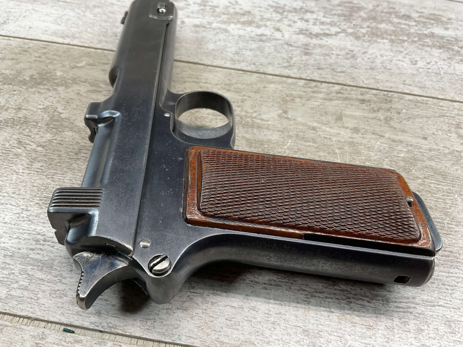 STEYR M1912 9MM STEYR SEMI AUTO PISTOL #345a, STEYR HAHN, MODEL 1912, 9MM STEYR, 1913 DATE, 5″ BARREL W/FROSTING IN GROOVES & GOOD RIFLING, ALL MATCHING, ROMANIAN CONTRACT “CROWN/MD.1912” ON LEFT SIDE OF SLIDE, NO “08” ON LEFT SIDE OF SLIDE INDICATING THAT THIS ONE HAS NOT BEEN CONVERTED TO 9MM LUGER, LIGHT FRECKLING IN AREAS ON SLIDE AND RECIEVER, CORRECT “K” PROOFS, EXC ORIGINAL CHECKERED WOOD GRIPS W/ LIGHT WEAR