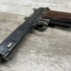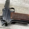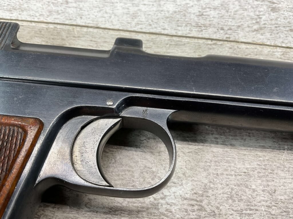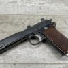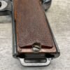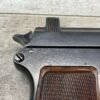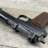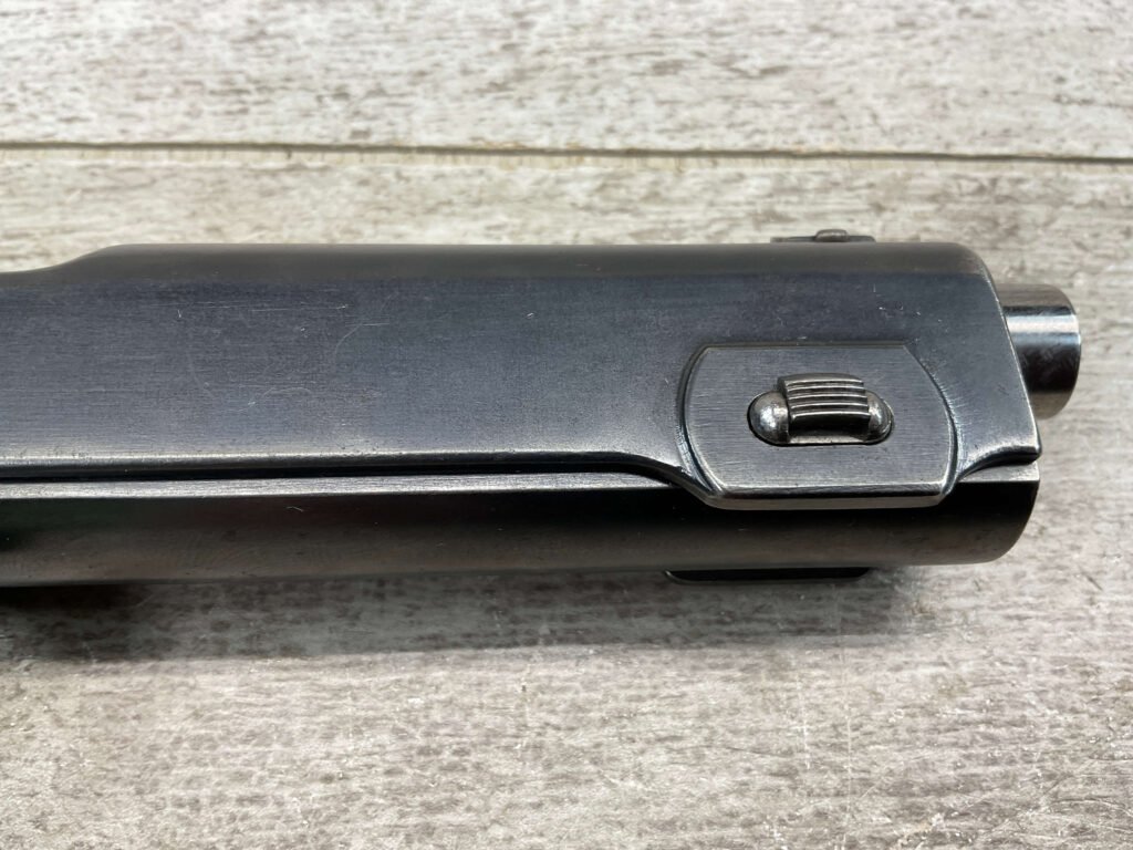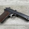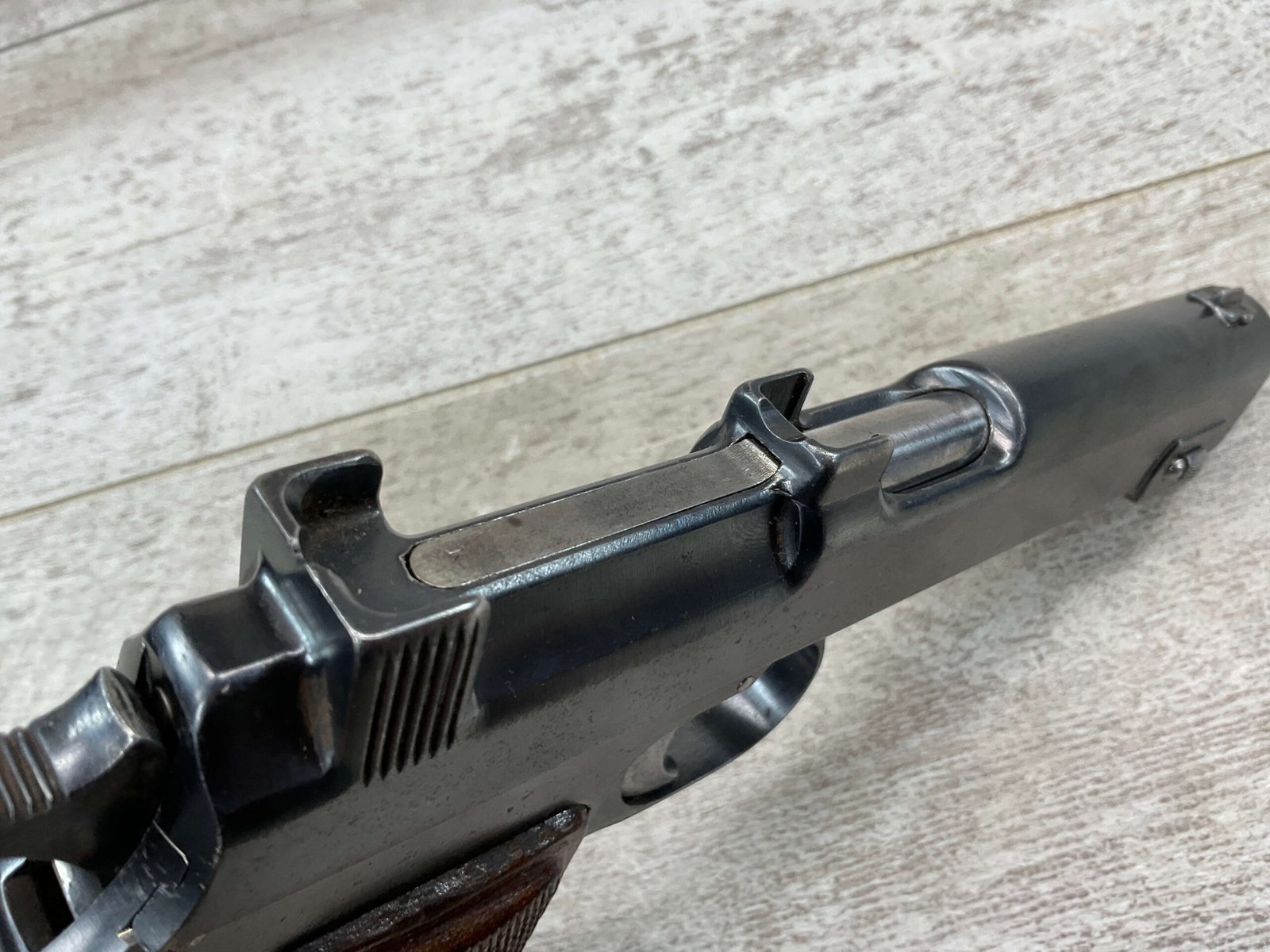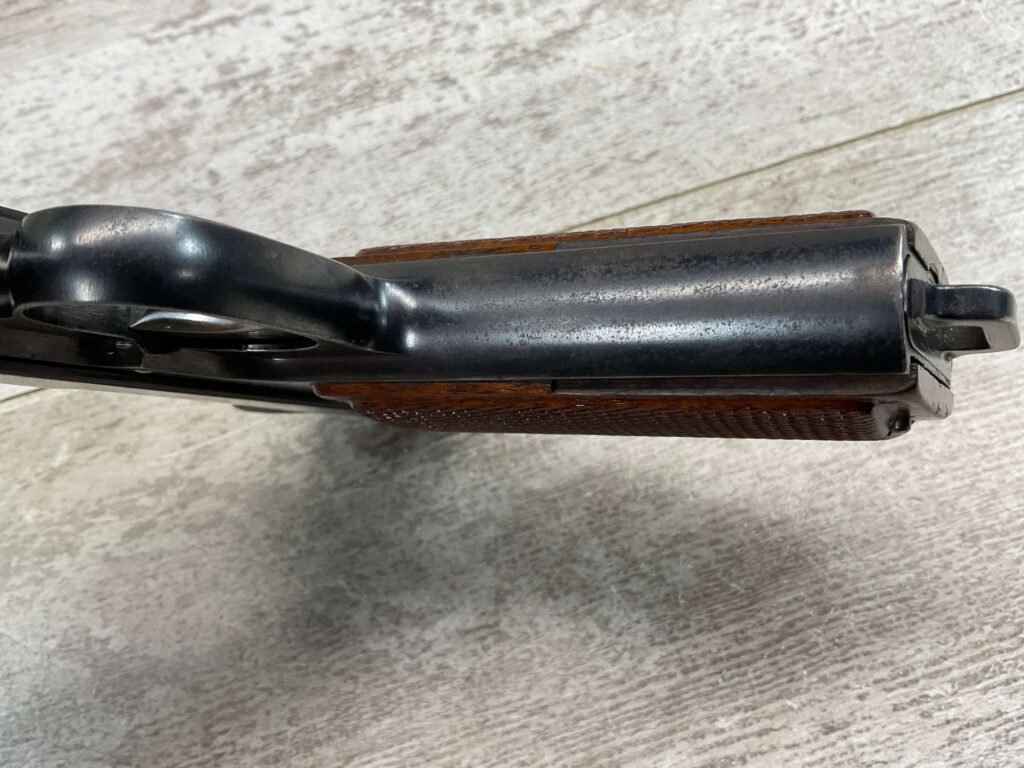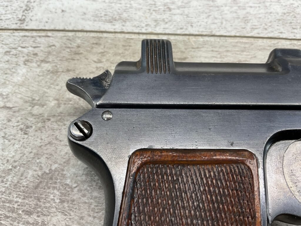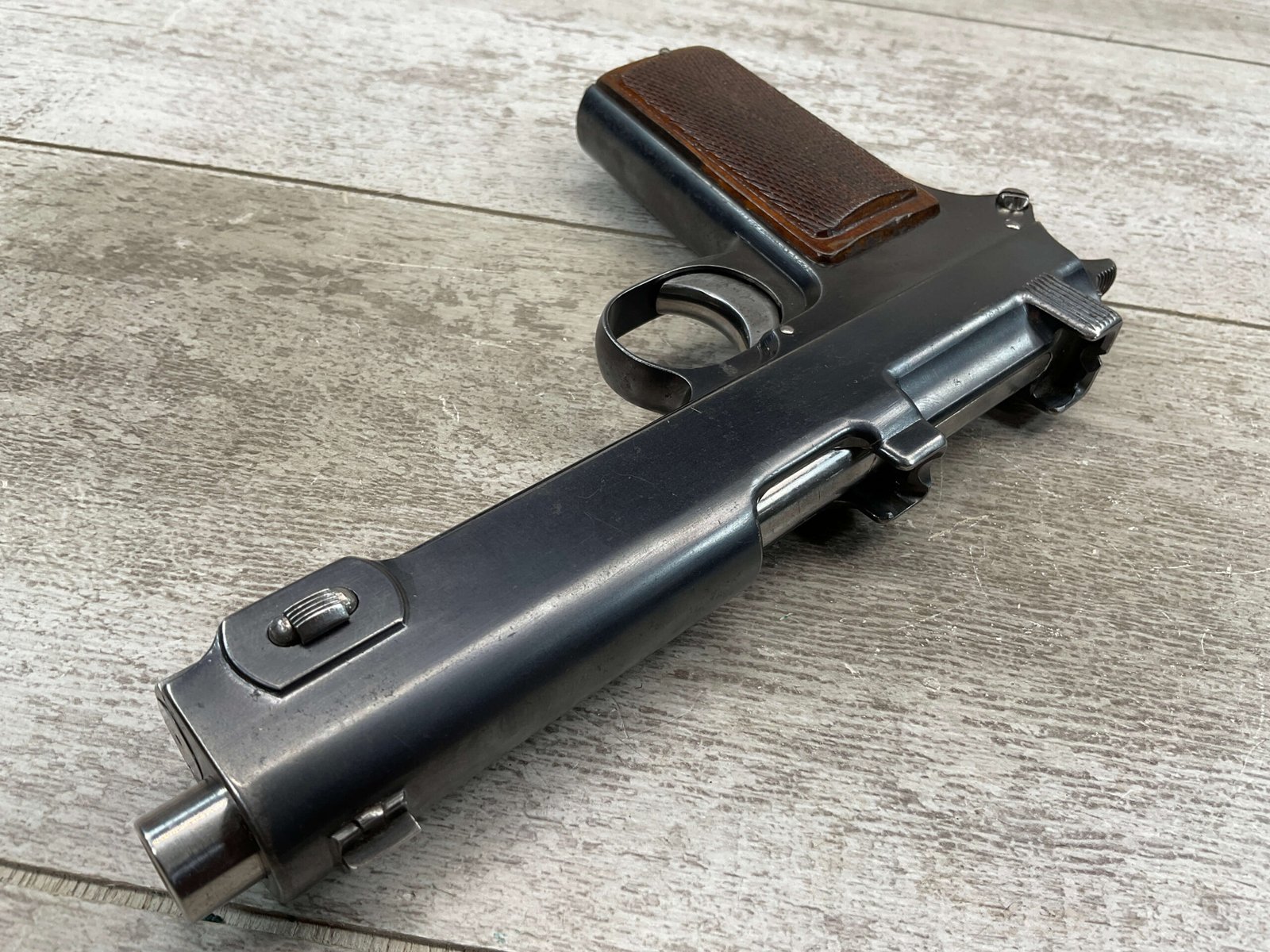 STEYR M1912 9MM STEYR SEMI AUTO PISTOL #345a, STEYR HAHN, MODEL 1912, 9MM STEYR, 1913 DATE, 5″ BARREL W/FROSTING IN GROOVES & GOOD RIFLING, ALL MATCHING, ROMANIAN CONTRACT “CROWN/MD.1912” ON LEFT SIDE OF SLIDE, NO “08” ON LEFT SIDE OF SLIDE INDICATING THAT THIS ONE HAS NOT BEEN CONVERTED TO 9MM LUGER, LIGHT FRECKLING IN AREAS ON SLIDE AND RECIEVER, CORRECT “K” PROOFS, EXC ORIGINAL CHECKERED WOOD GRIPS W/ LIGHT WEAR