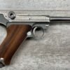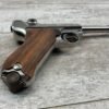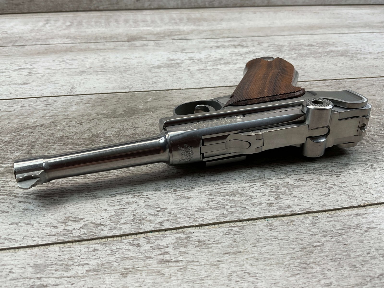 STOEGER AMERICAN EAGLE STAINLESS LUGER P08 9MM PISTOL #S3249, 4″ BBL, 11 ROUND MAG, AMERICAN EAGLE ON MAG AND OVER CHAMBER, 1994 APPROX MFR, WALNUT CHECKERED GRIPS, APPEARS UNFIRED, NEAR PERFECT CONDITION, 99+% OVERALL