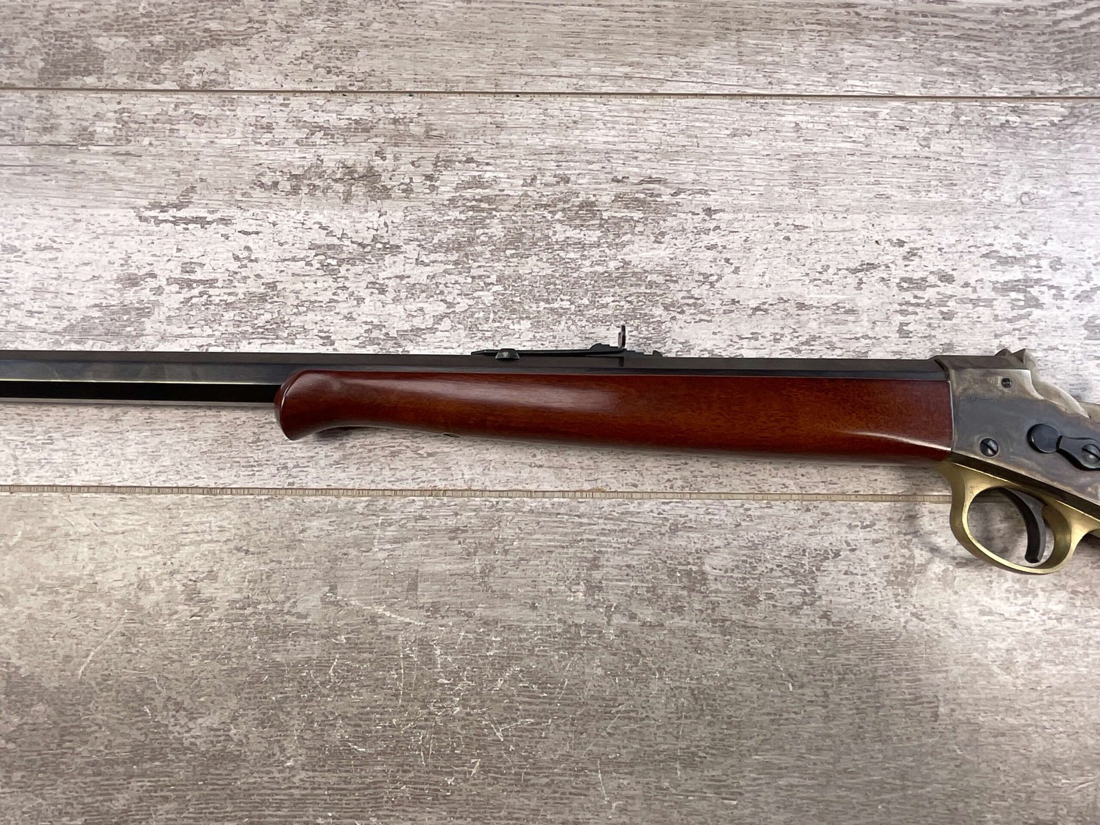 STOEGER / UBERTI 1871 BABY ROLLING BLOCK .22LR RIFLE, JAMES EARL JONES COLLECTION #S00753, 26″ OCTAGON BARREL, EXC MIRROR BORE & RIFLING, EXC BLUE FINISH, EXC WALNUT STOCK, BEAUTIFUL COLOR CASE HARDENED RECEIVER, BRASS TRIGGER GUARD, CONDITION AS SHOWN IN PICTURES, FROM THE JAMES EARL JONES “FAVORITES” COLLECTION W/ CERTIFICATE OF AUTHENTICITY.