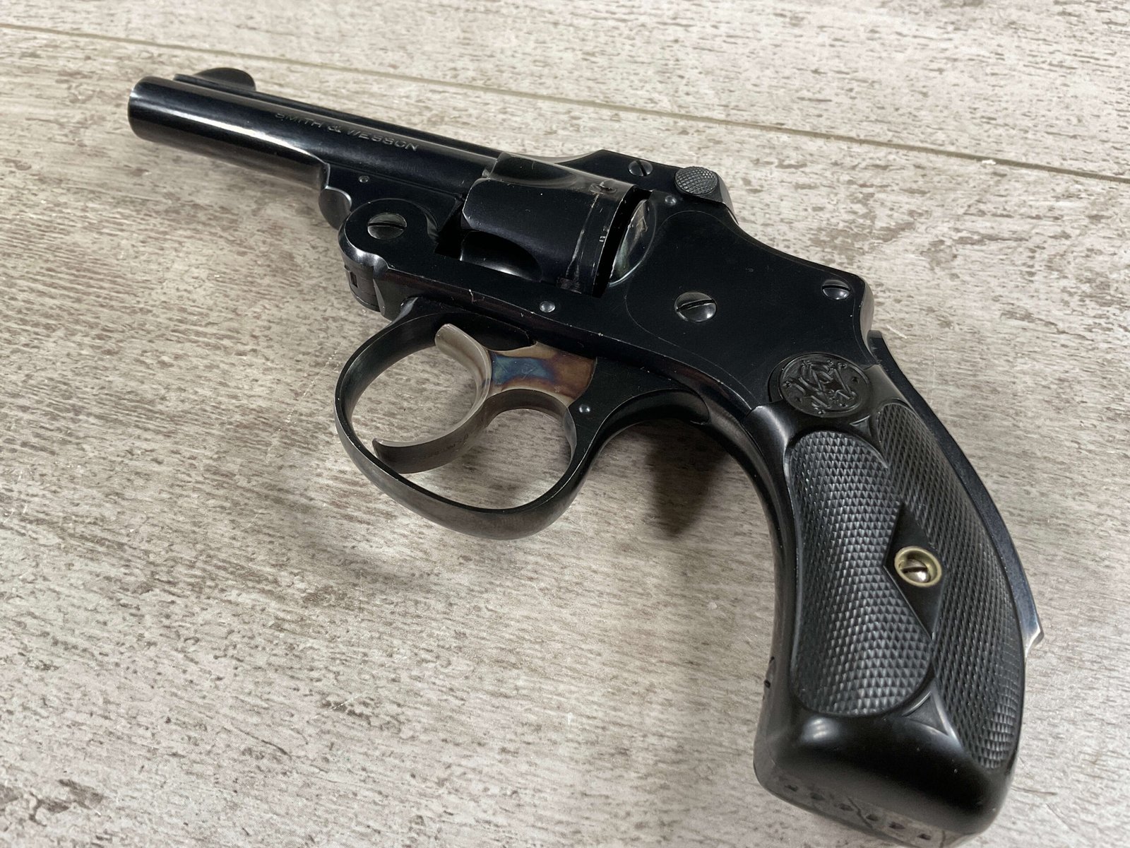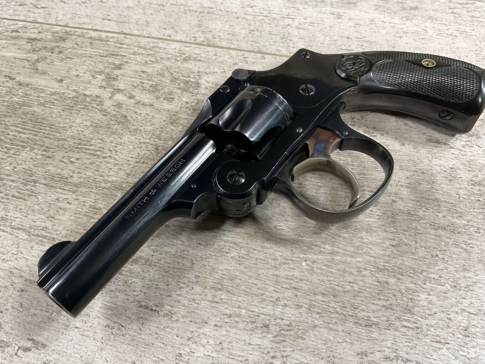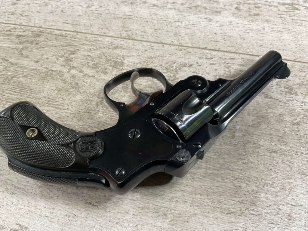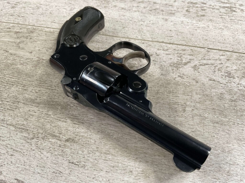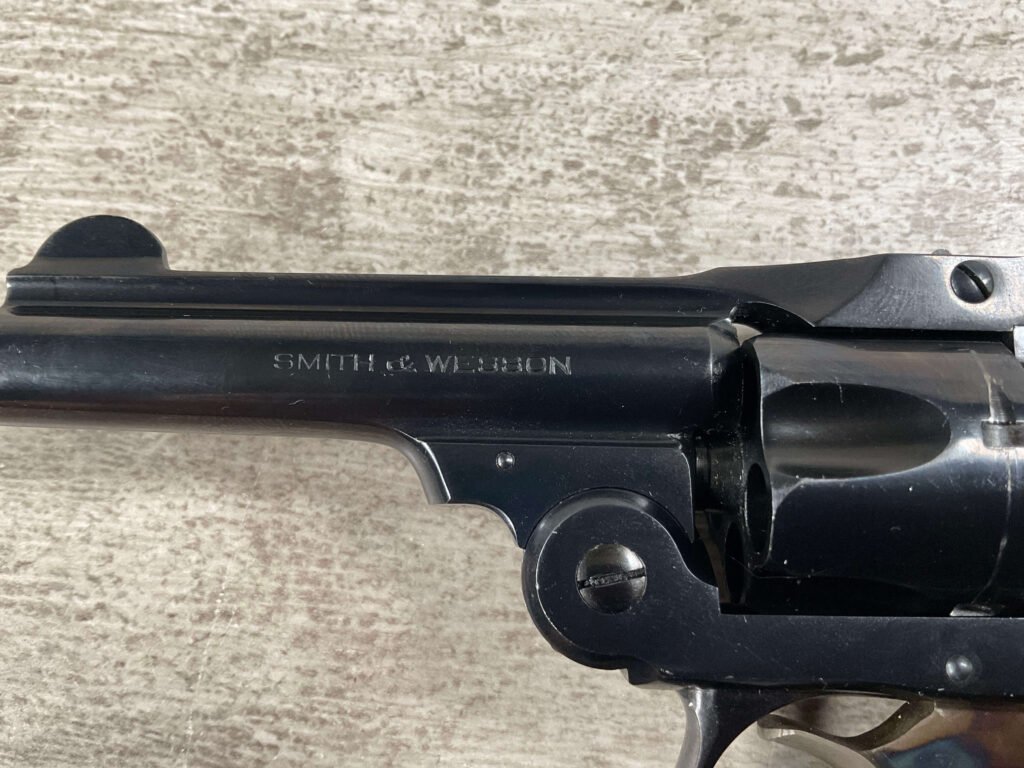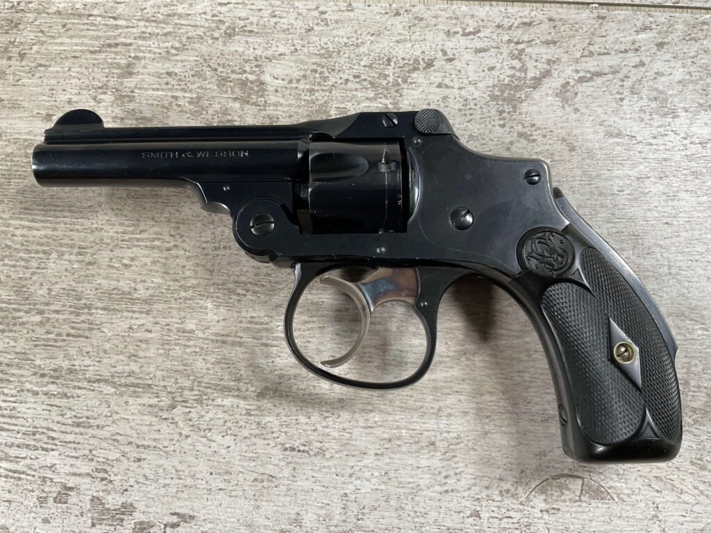 S&W .32 SAFETY HAMMERLESS THIRD MODEL STANDARD REVOLVER #242446, TOP BREAK W/PUSH DOWN LATCH, 3″ BARREL, 5 SHOT FLUTED CYLINDER, ORIGINAL BLUE FINISH, EXC ORIGINAL BLACK PLASTIC GRIPS, CHECKERED REAR GRIP SAFETY, EXC BRIGHT BORE, 98%
