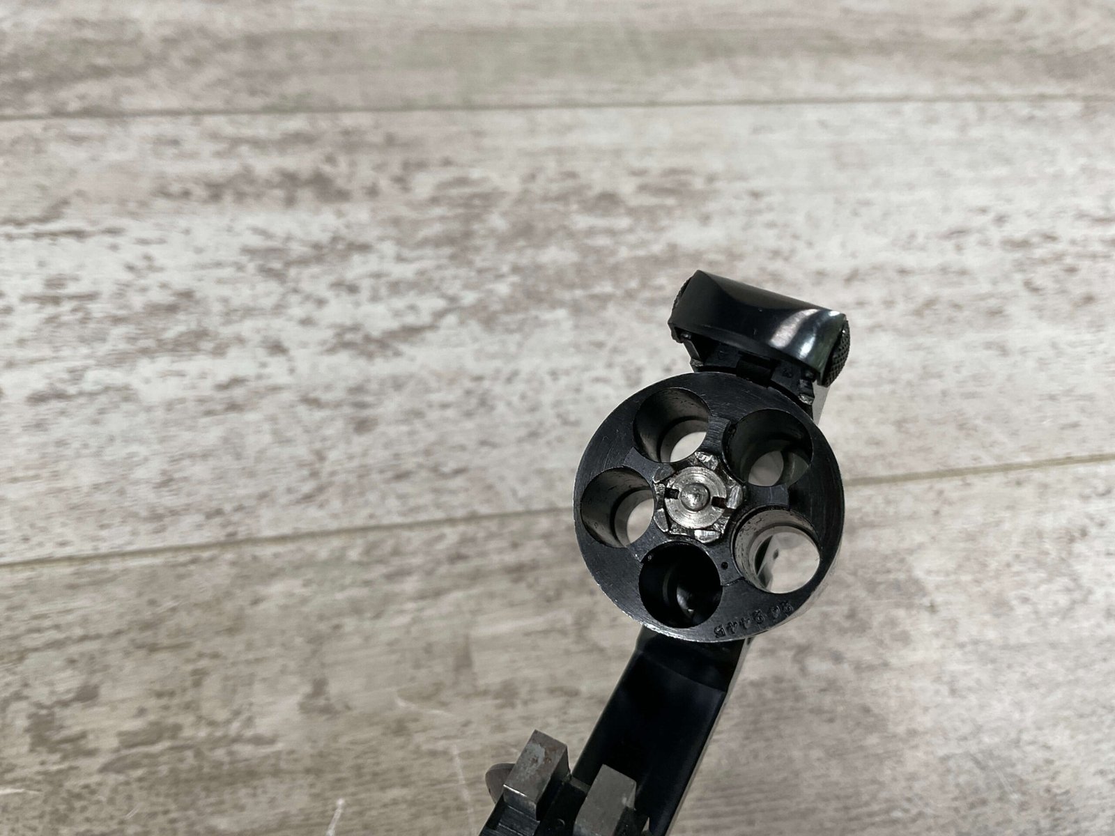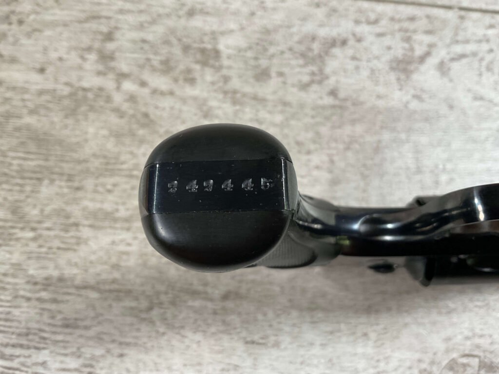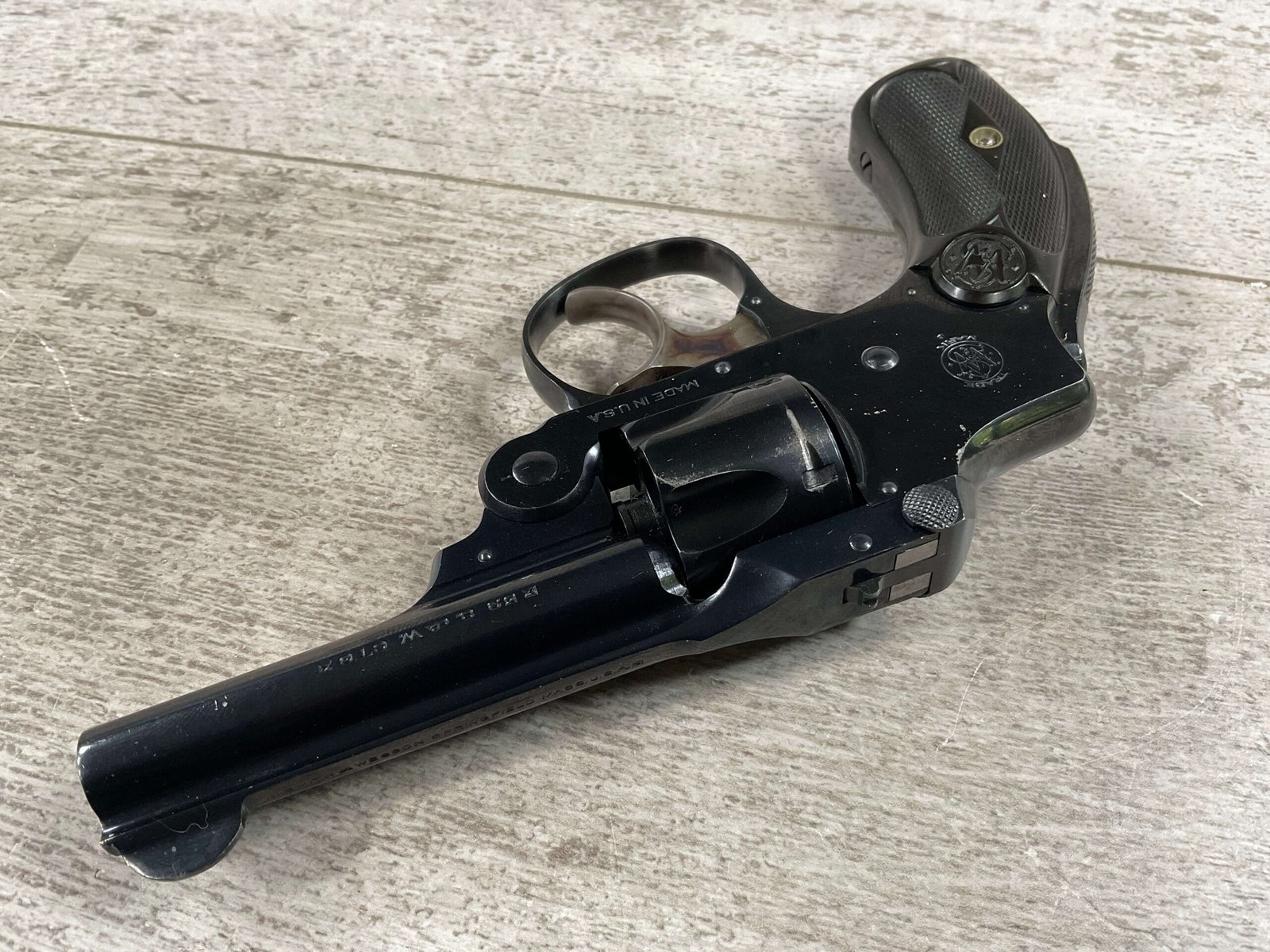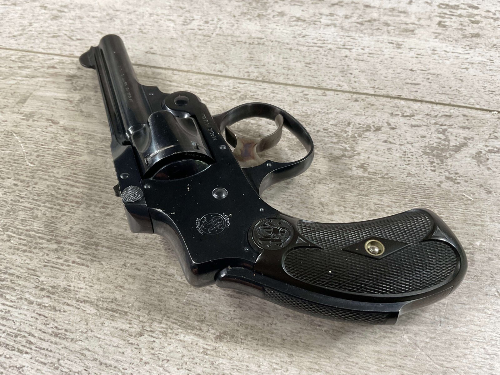 S&W .32 SAFETY HAMMERLESS THIRD MODEL STANDARD REVOLVER #242446, TOP BREAK W/PUSH DOWN LATCH, 3″ BARREL, 5 SHOT FLUTED CYLINDER, ORIGINAL BLUE FINISH, EXC ORIGINAL BLACK PLASTIC GRIPS, CHECKERED REAR GRIP SAFETY, EXC BRIGHT BORE, 98%