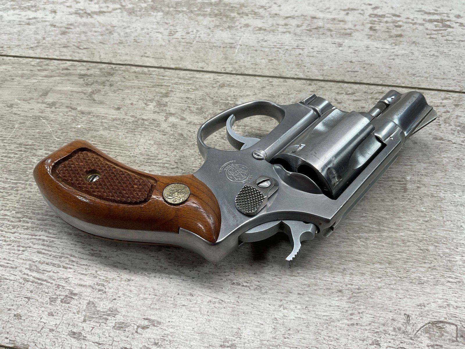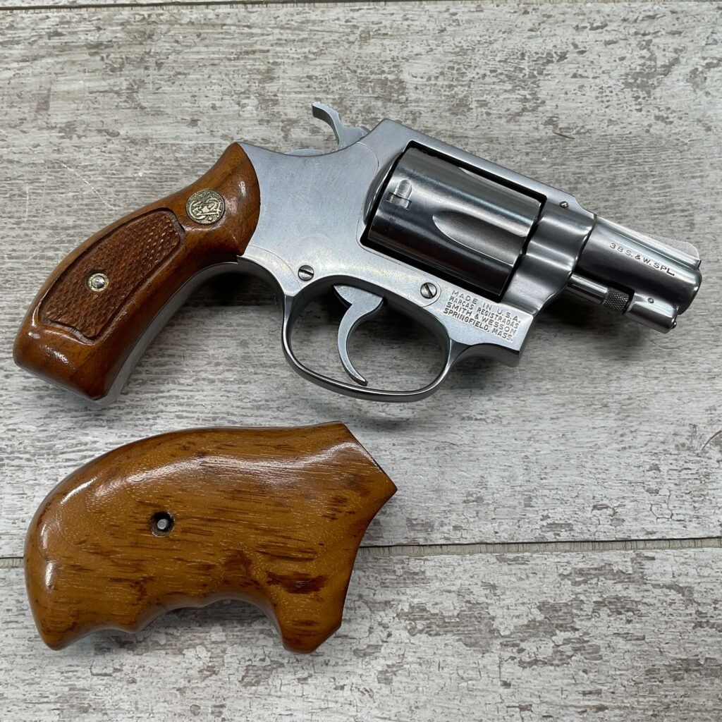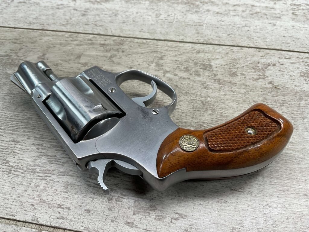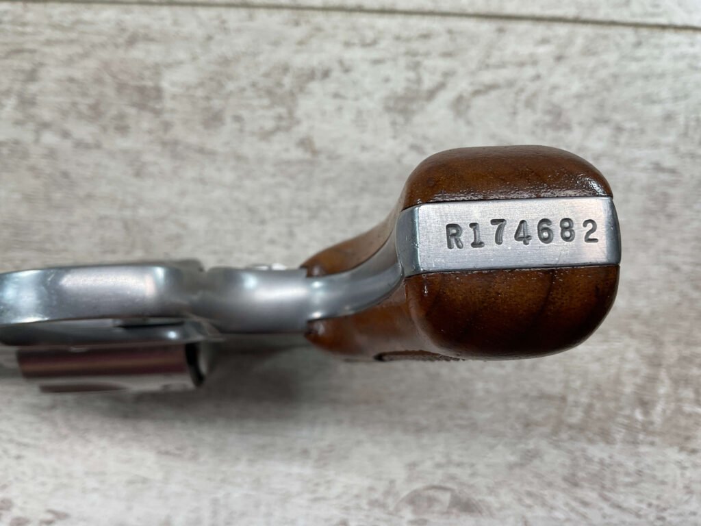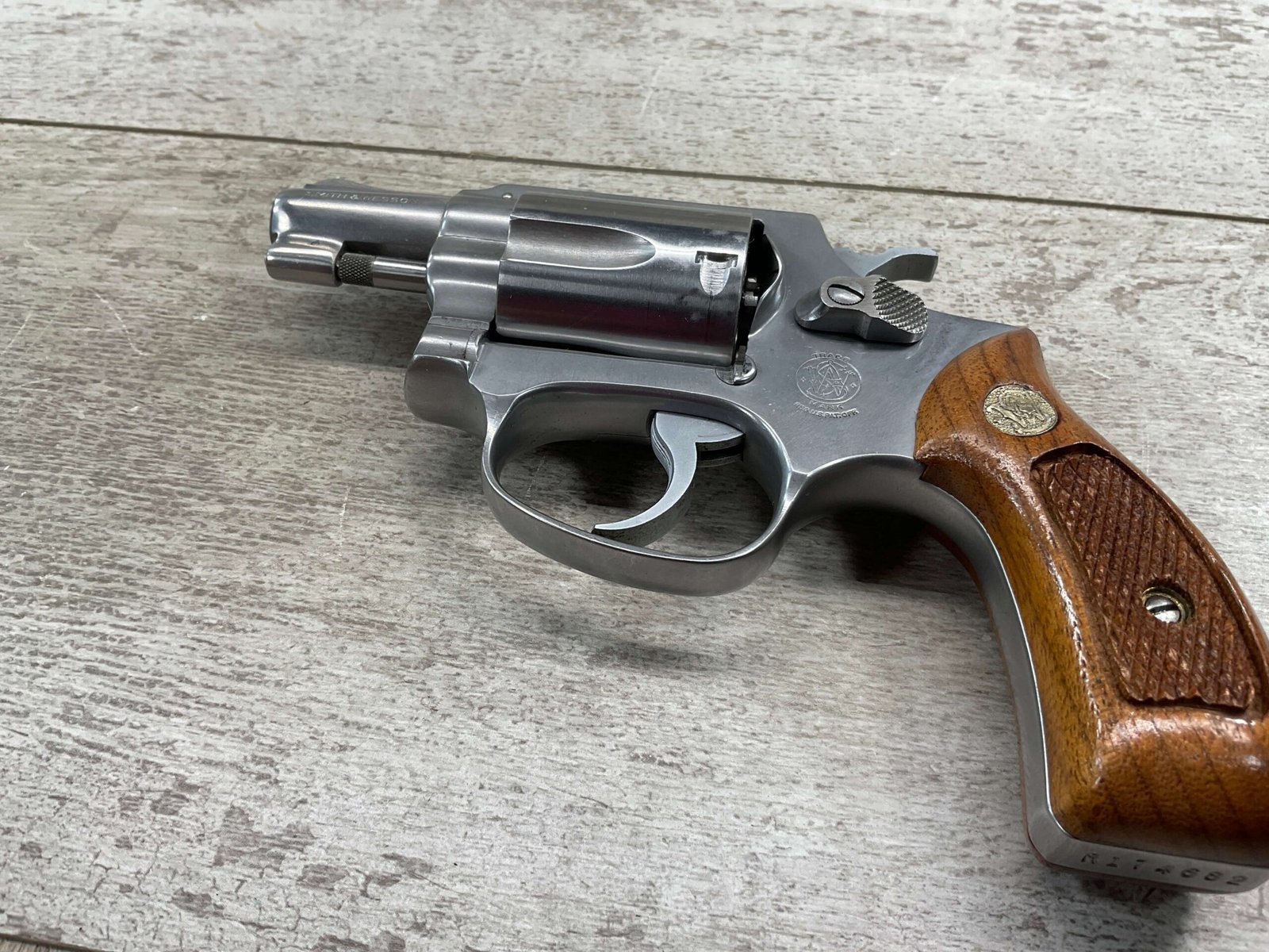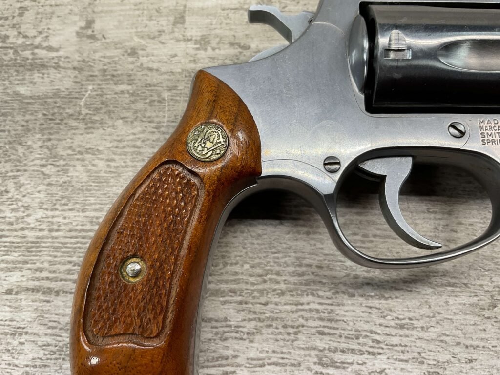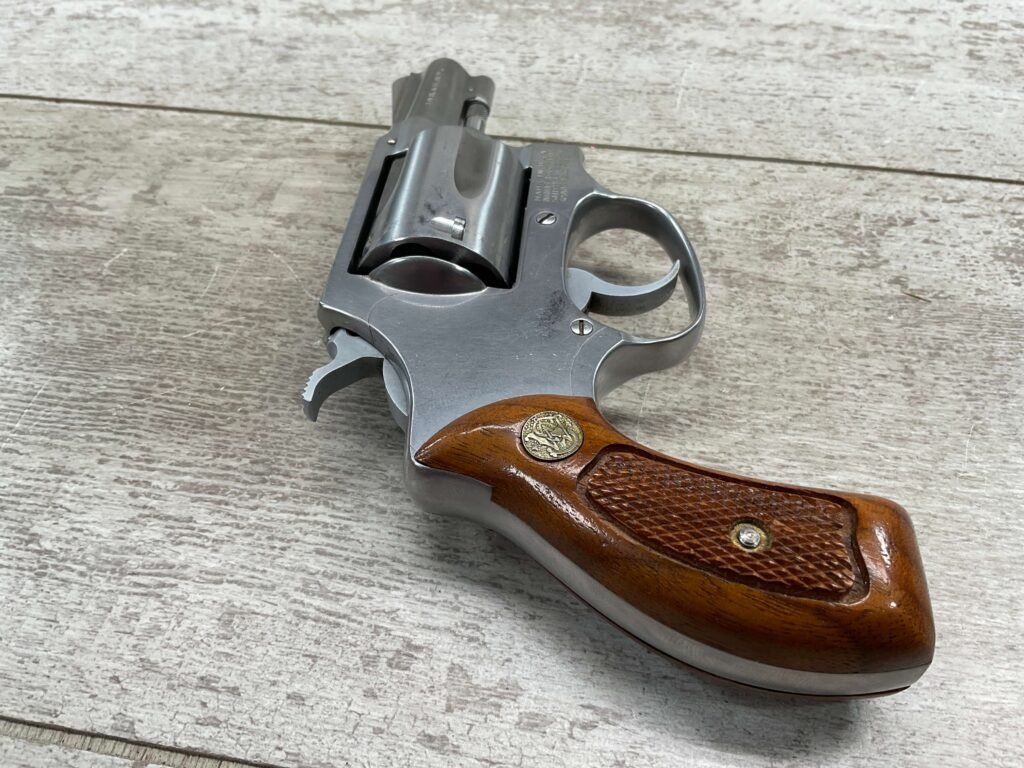 S&W MODEL 60 STAINLESS CHIEFS SPECIAL .38 SPECIAL REVOLVER, 1975-76 MFR #R174682, 1 3/4″ SNUBNOSE BARREL, DA/SA, EXC STAINLESS STEEL FINISH W/VERY LIGHT CYLINDER WEAR, EXC CHECKERED WALNUT GRIPS, 95+% OVERALL CONDITION, SQUARE NOTCH REAR SIGHT & RAMPED FRONT SIGHT, ROUND BUTT, VERY LIGHT HANDLING MARKS, MINTY BORE & RIFLING, EXOTIC WOOD CUSTOM COMBAT GRIPS INCLUDED, 95% HIGH CONDITION
