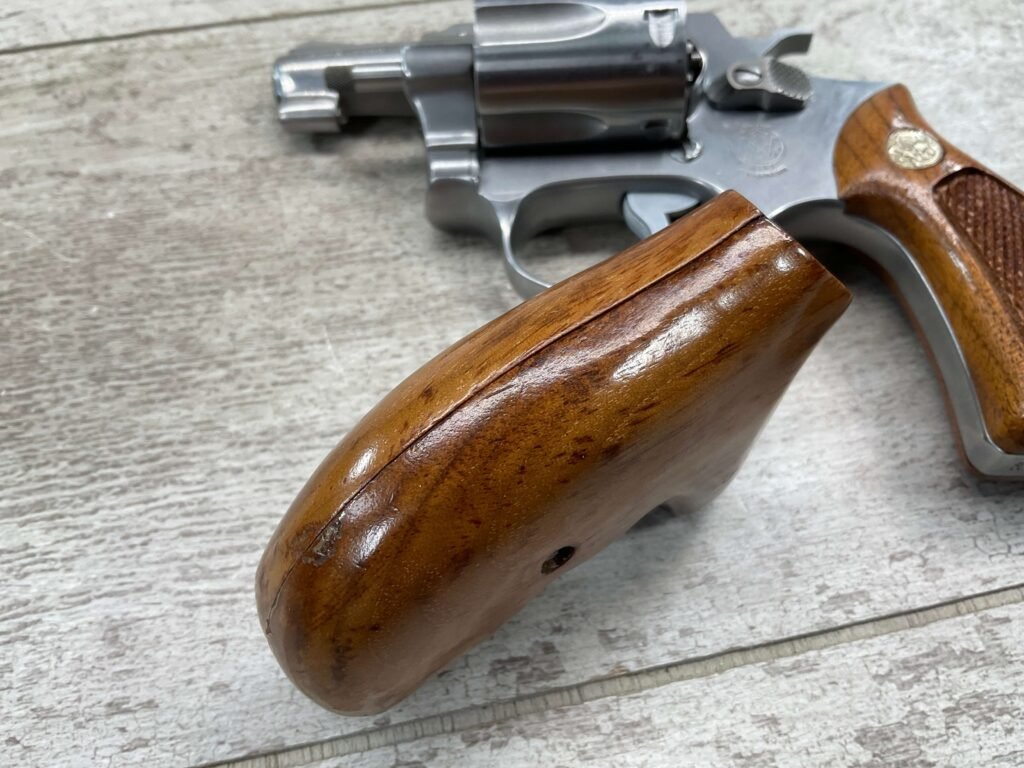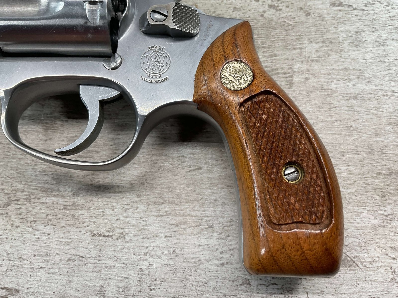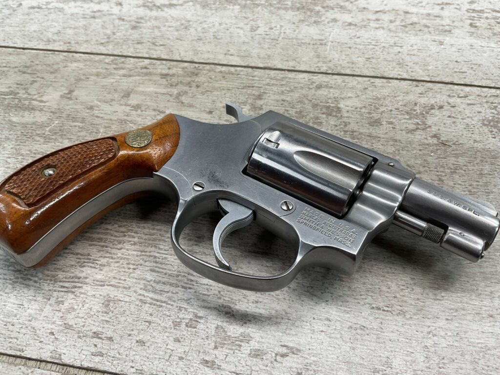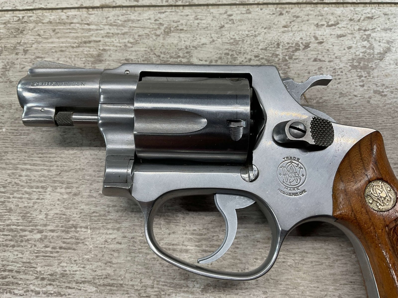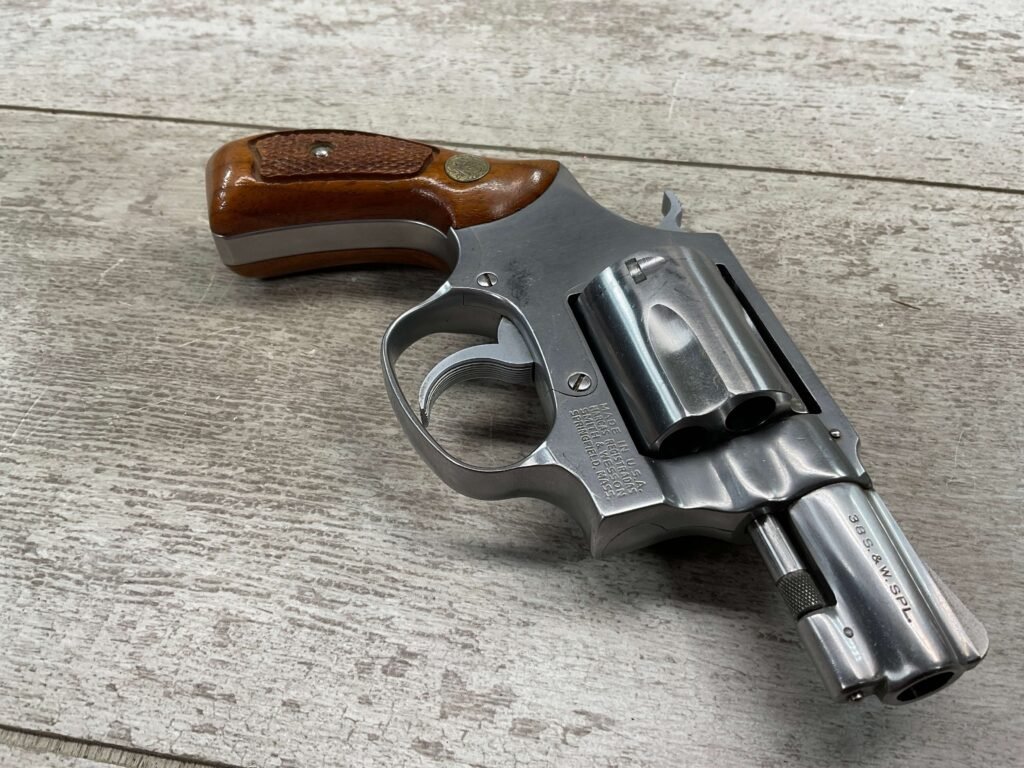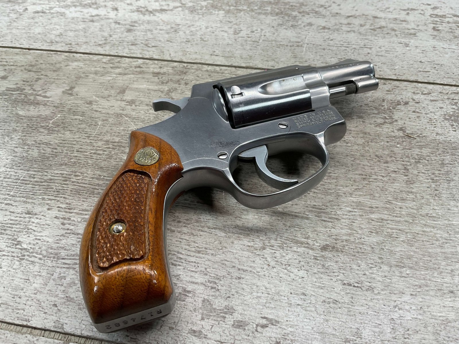S&W MODEL 60 STAINLESS CHIEFS SPECIAL .38 SPECIAL REVOLVER, 1975-76 MFR #R174682, 1 3/4″ SNUBNOSE BARREL, DA/SA, EXC STAINLESS STEEL FINISH W/VERY LIGHT CYLINDER WEAR, EXC CHECKERED WALNUT GRIPS, 95+% OVERALL CONDITION, SQUARE NOTCH REAR SIGHT & RAMPED FRONT SIGHT, ROUND BUTT, VERY LIGHT HANDLING MARKS, MINTY BORE & RIFLING, EXOTIC WOOD CUSTOM COMBAT GRIPS INCLUDED, 95% HIGH CONDITION