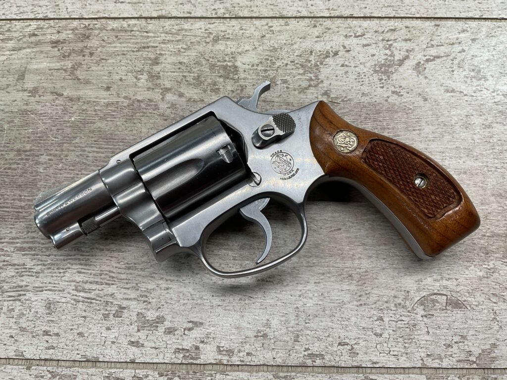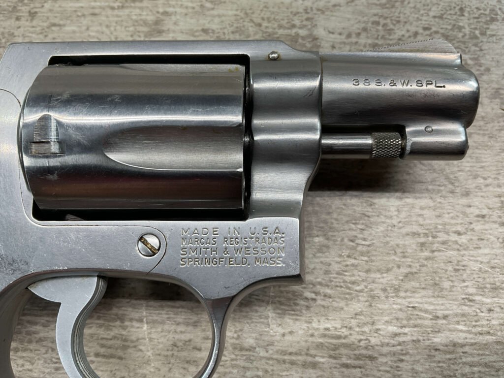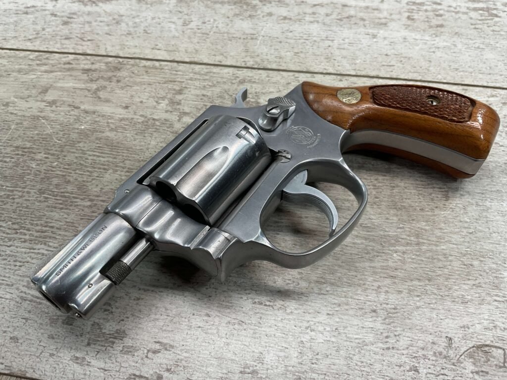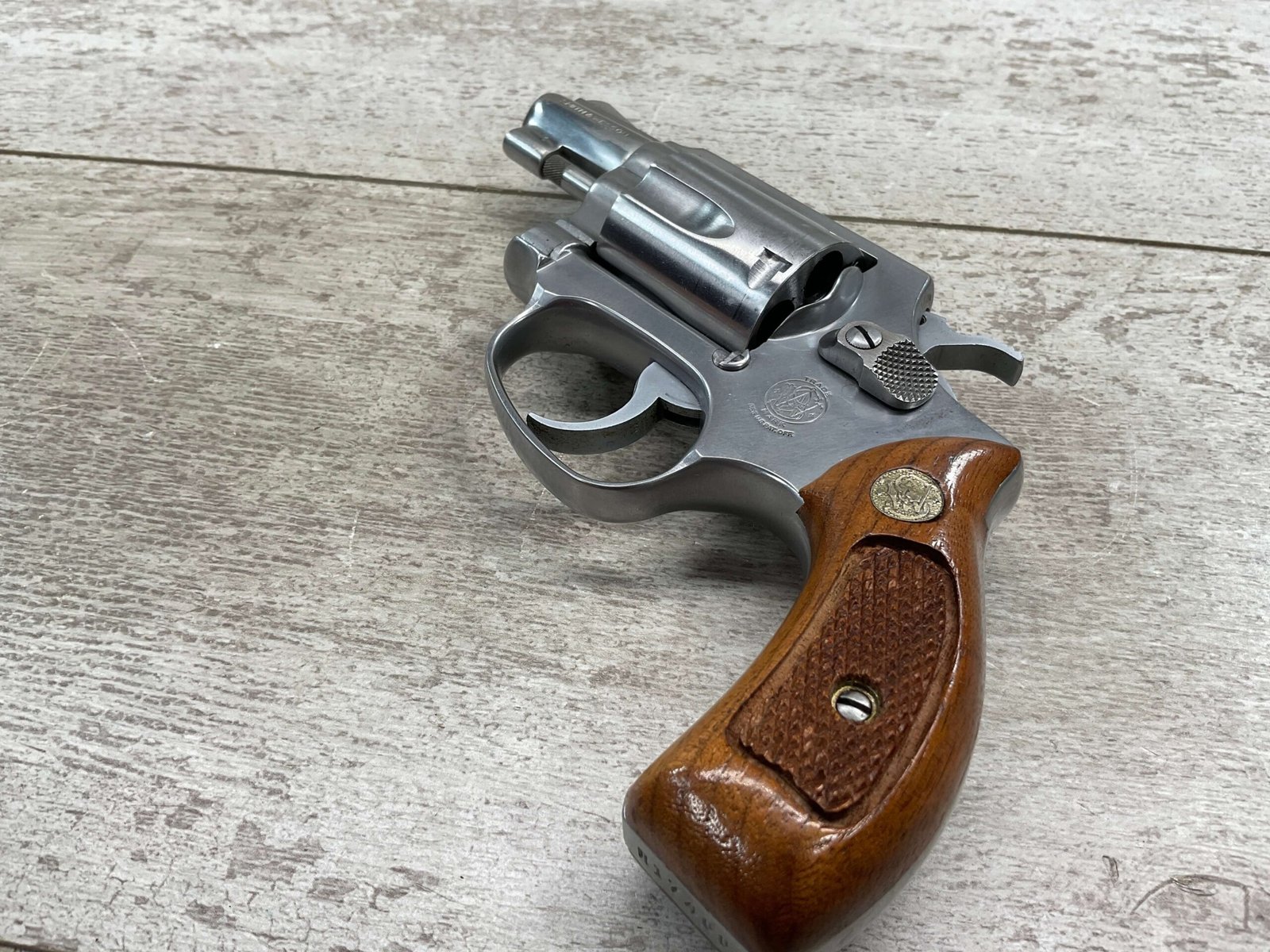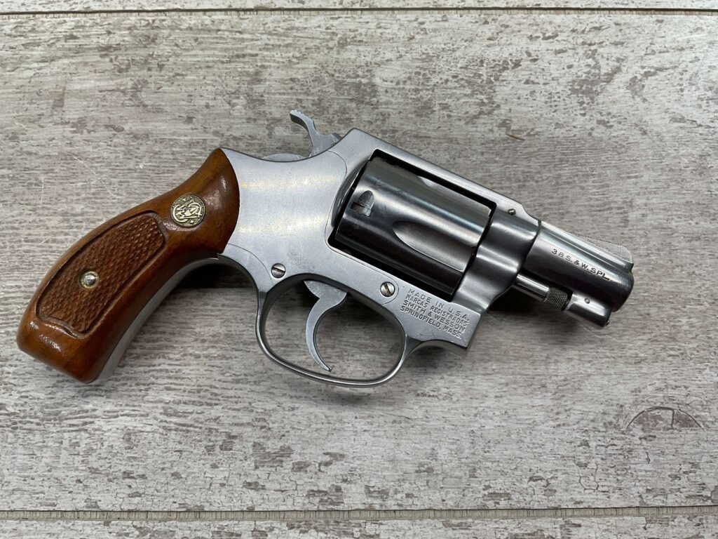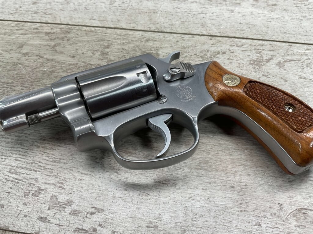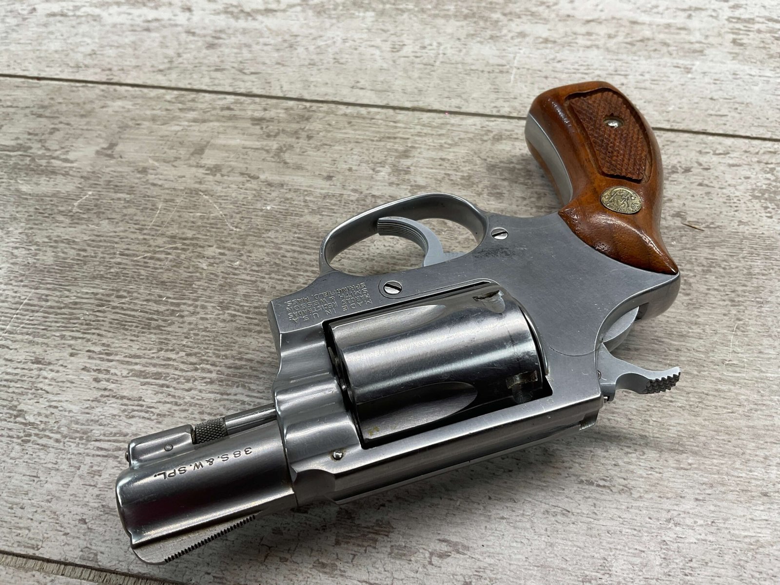 S&W MODEL 60 STAINLESS CHIEFS SPECIAL .38 SPECIAL REVOLVER, 1975-76 MFR #R174682, 1 3/4″ SNUBNOSE BARREL, DA/SA, EXC STAINLESS STEEL FINISH W/VERY LIGHT CYLINDER WEAR, EXC CHECKERED WALNUT GRIPS, 95+% OVERALL CONDITION, SQUARE NOTCH REAR SIGHT & RAMPED FRONT SIGHT, ROUND BUTT, VERY LIGHT HANDLING MARKS, MINTY BORE & RIFLING, EXOTIC WOOD CUSTOM COMBAT GRIPS INCLUDED, 95% HIGH CONDITION