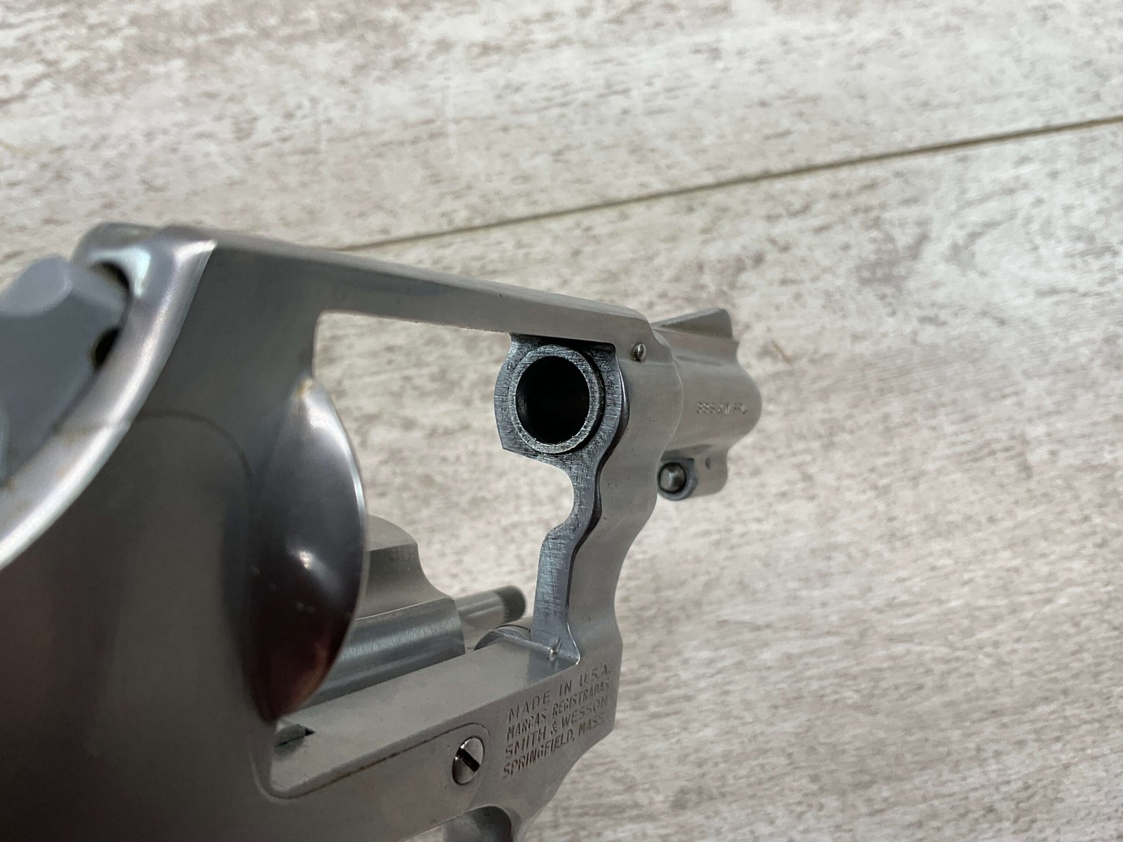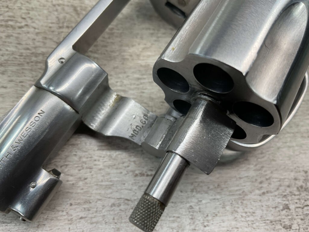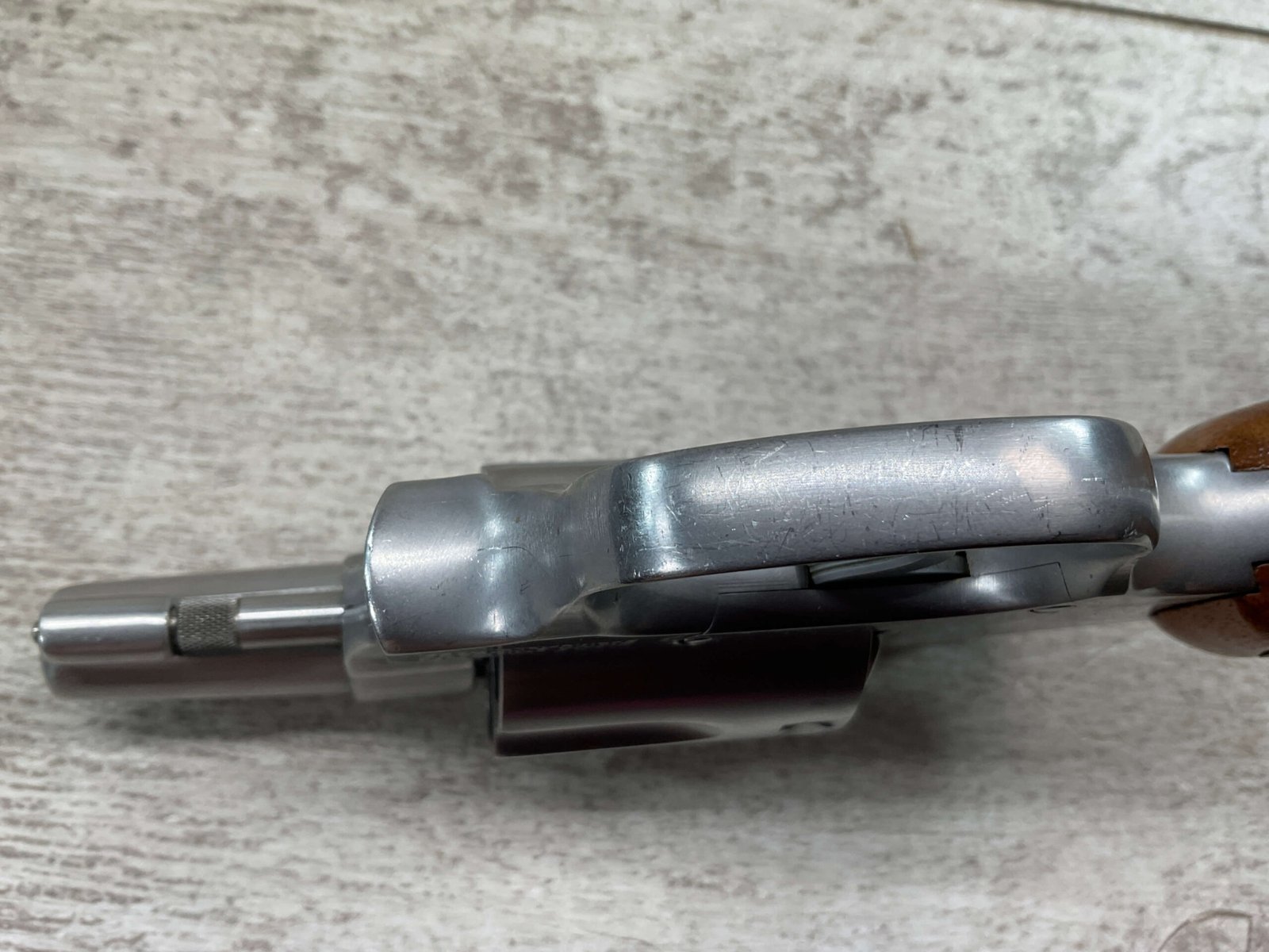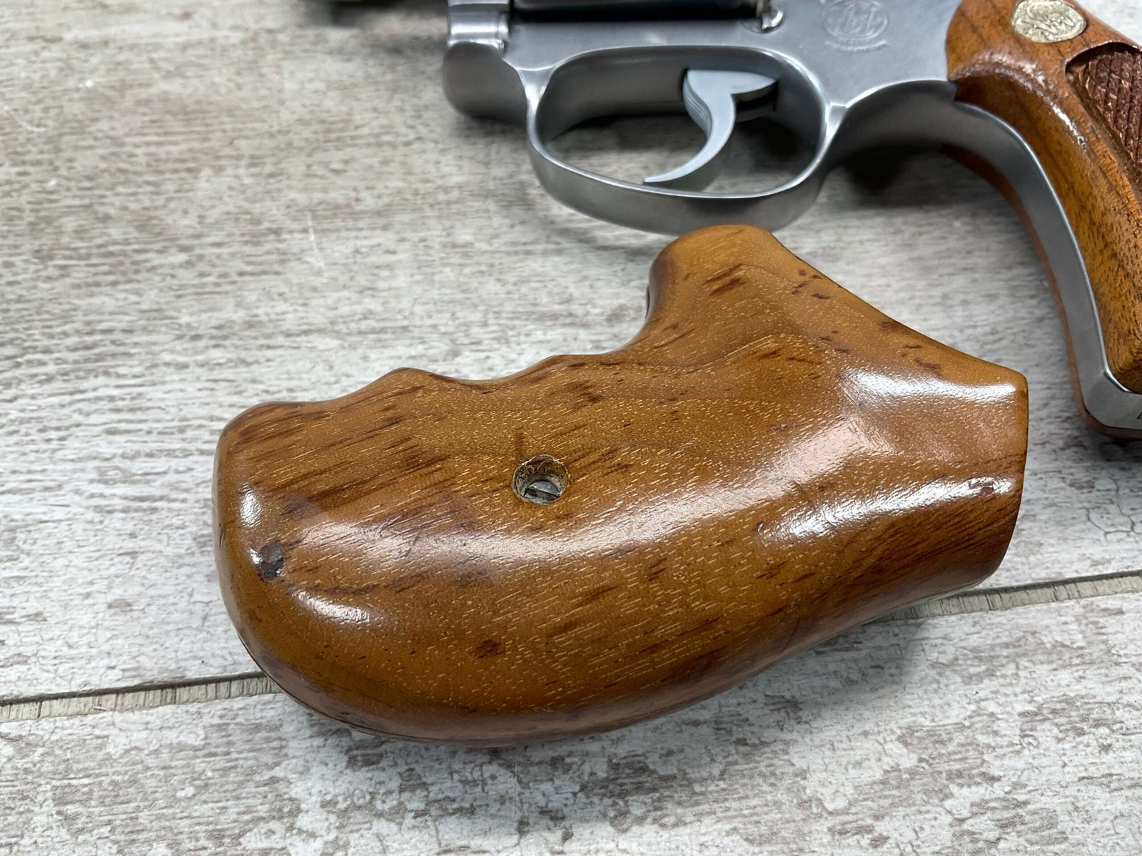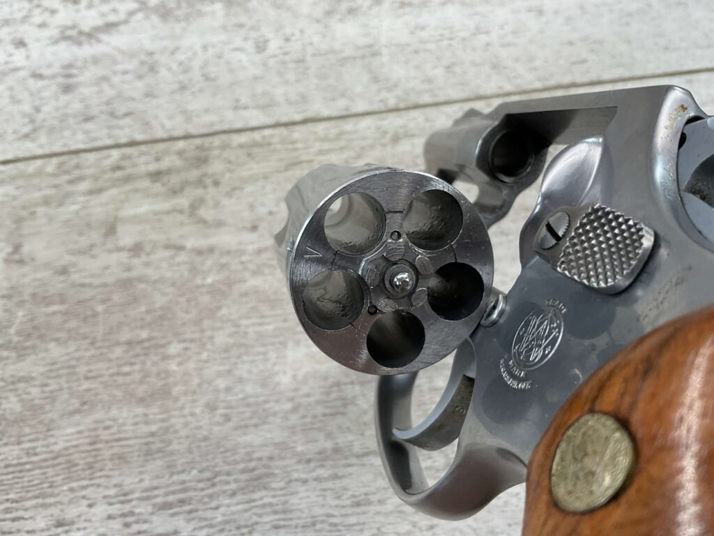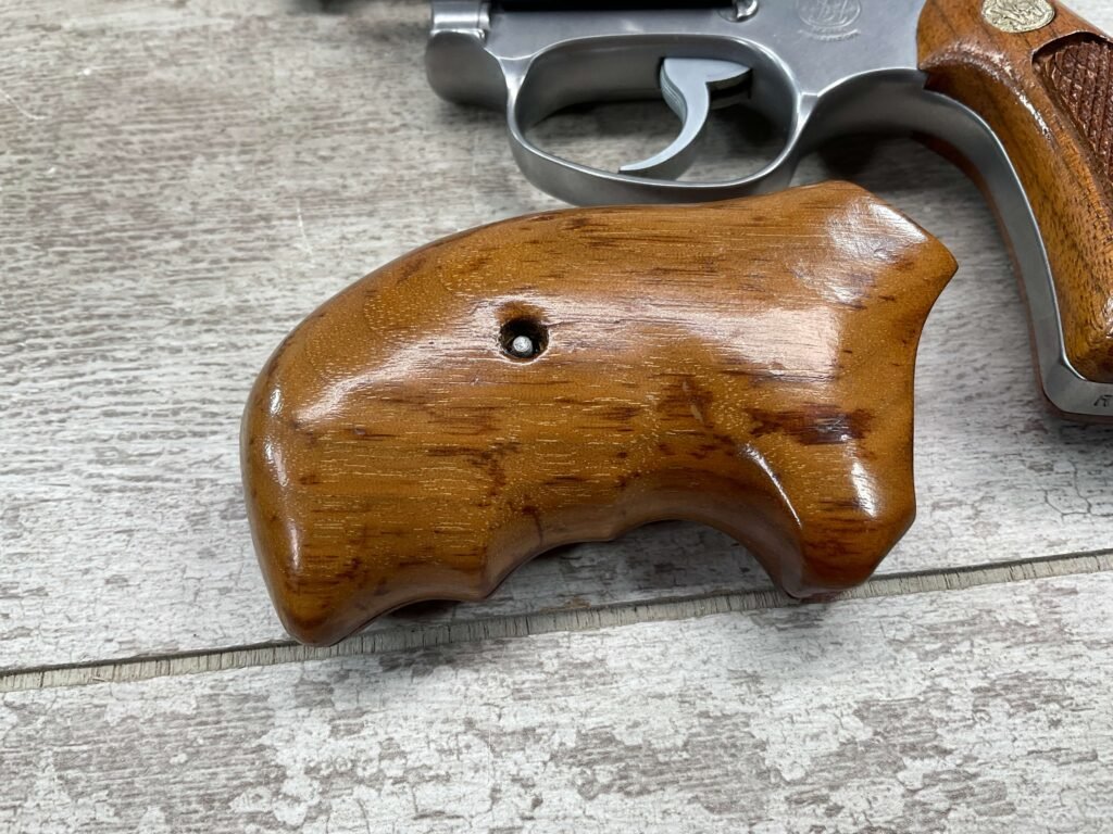 S&W MODEL 60 STAINLESS CHIEFS SPECIAL .38 SPECIAL REVOLVER, 1975-76 MFR #R174682, 1 3/4″ SNUBNOSE BARREL, DA/SA, EXC STAINLESS STEEL FINISH W/VERY LIGHT CYLINDER WEAR, EXC CHECKERED WALNUT GRIPS, 95+% OVERALL CONDITION, SQUARE NOTCH REAR SIGHT & RAMPED FRONT SIGHT, ROUND BUTT, VERY LIGHT HANDLING MARKS, MINTY BORE & RIFLING, EXOTIC WOOD CUSTOM COMBAT GRIPS INCLUDED, 95% HIGH CONDITION
