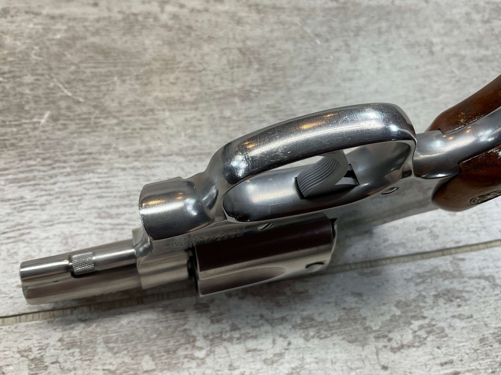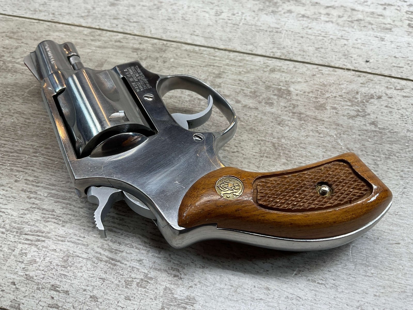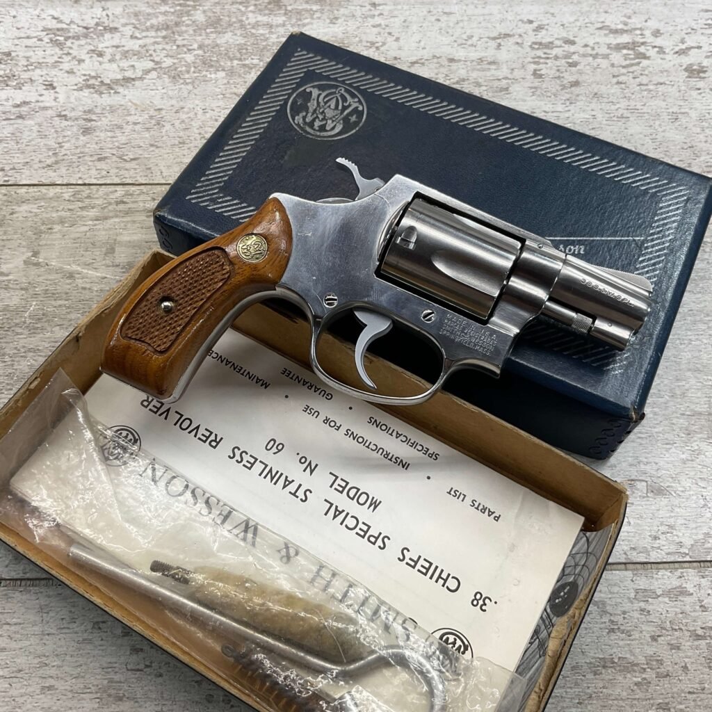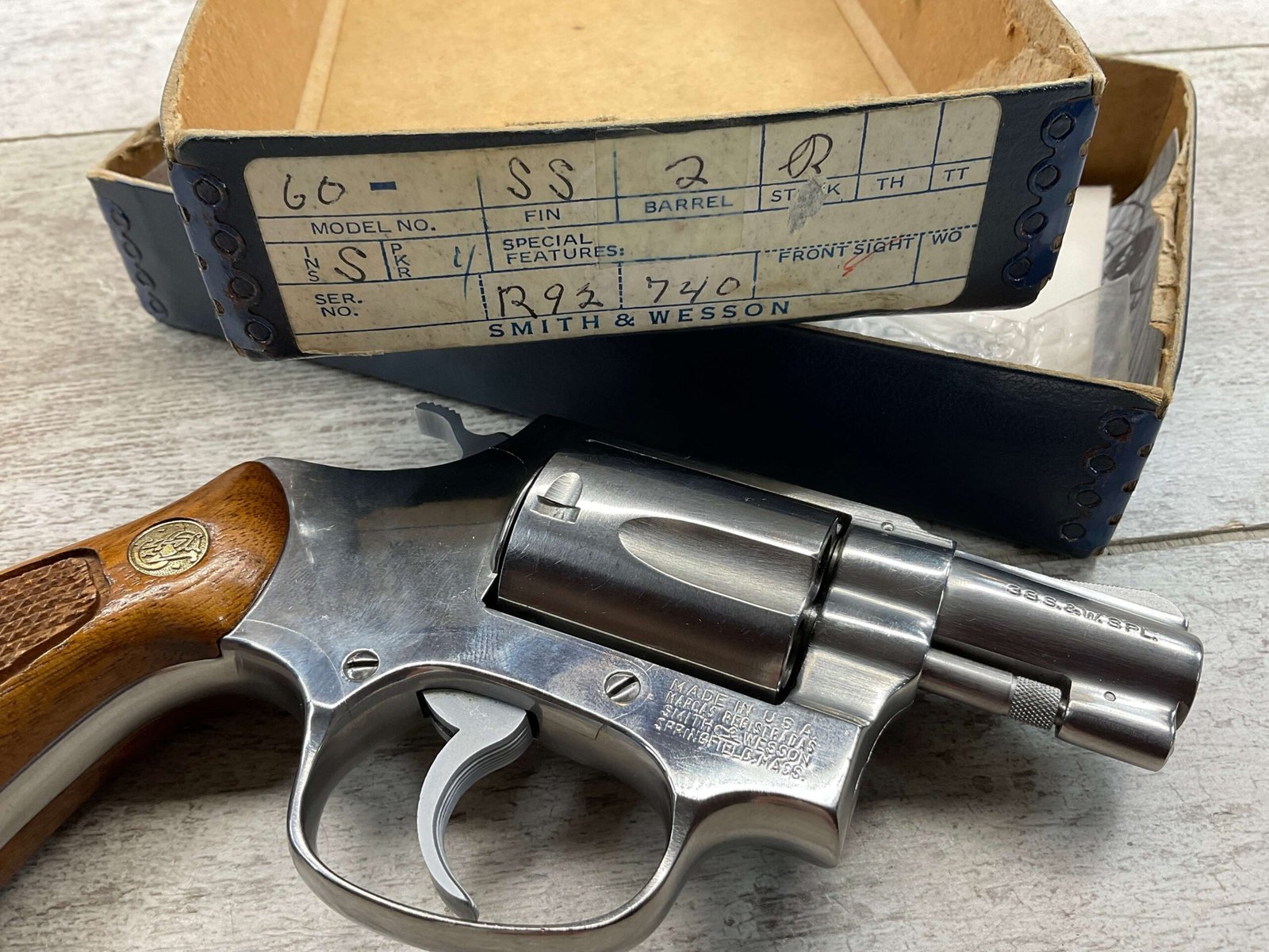 S&W MODEL 60 STAINLESS CHIEFS SPECIAL .38 SPECIAL REVOLVER, 1974-75 MFR #R92740, 1 3/4″ SNUBNOSE BARREL, DA/SA, EXC STAINLESS STEEL FINISH W/VERY LIGHT CYLINDER WEAR, EXC CHECKERED WALNUT GRIPS, 95+% OVERALL CONDITION, SQUARE NOTCH BUILT IN REAR SIGHT & RAMPED FRONT SIGHT, ROUND BUTT, LIGHT HANDLING MARKS, MINTY BORE & RIFLING, 95% HIGH CONDITION W/ORIGINAL BOX & PAPERWORK! GREAT COLLECTOR PIECE