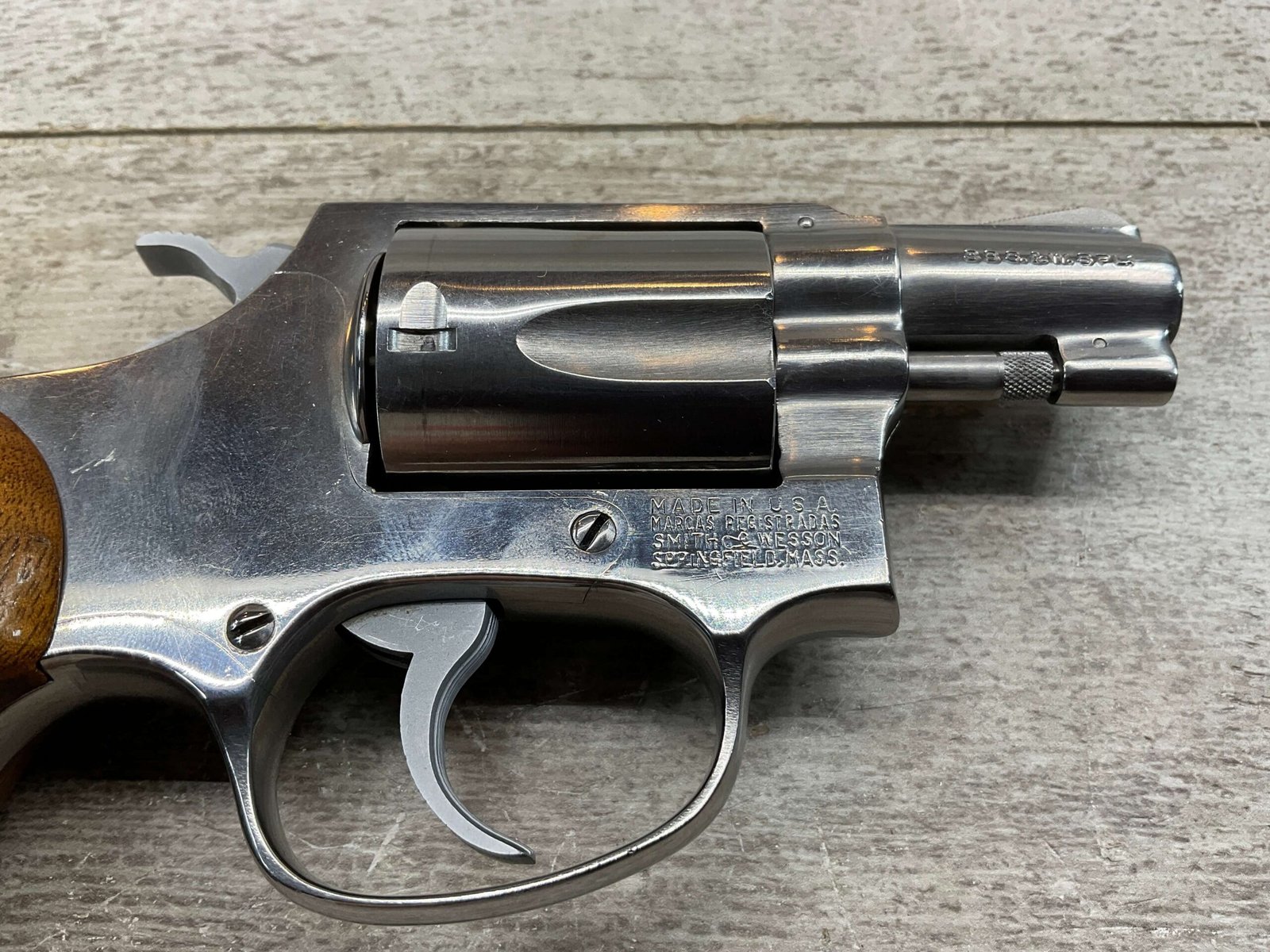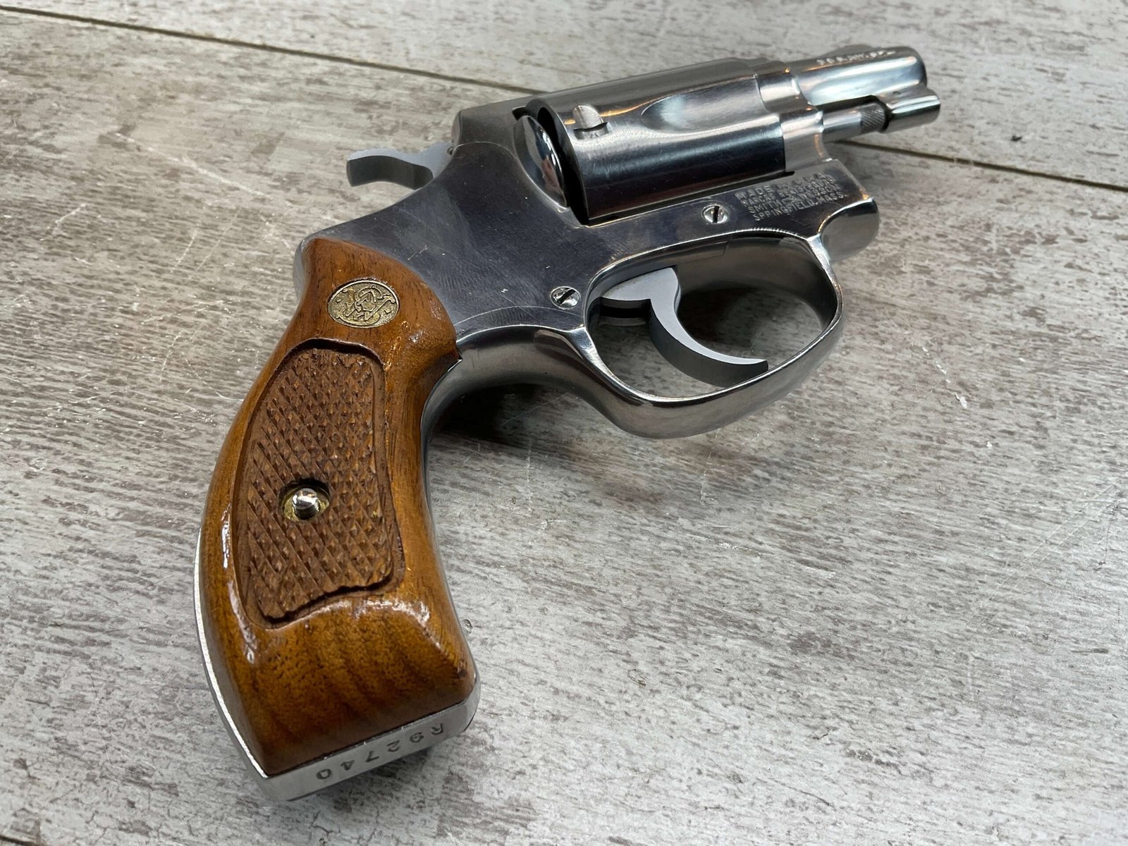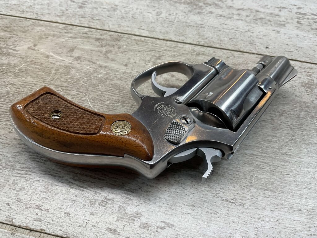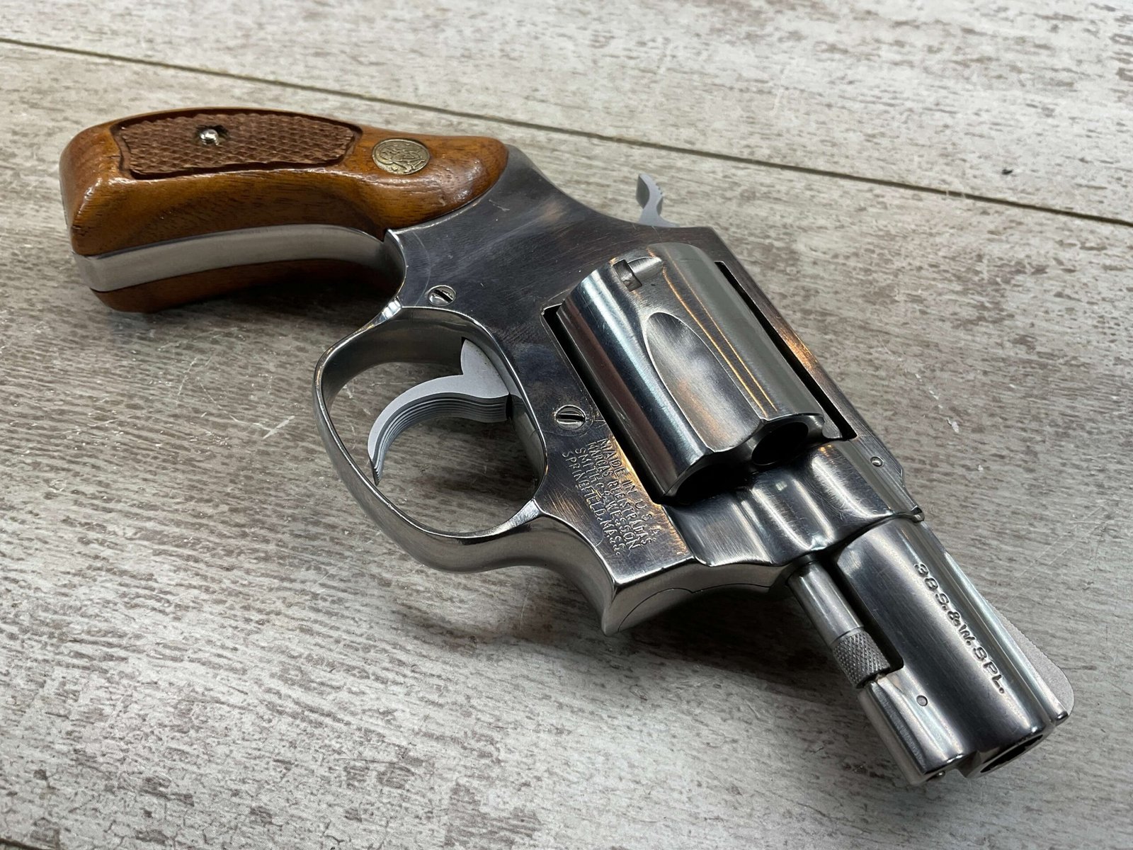 S&W MODEL 60 STAINLESS CHIEFS SPECIAL .38 SPECIAL REVOLVER, 1974-75 MFR #R92740, 1 3/4″ SNUBNOSE BARREL, DA/SA, EXC STAINLESS STEEL FINISH W/VERY LIGHT CYLINDER WEAR, EXC CHECKERED WALNUT GRIPS, 95+% OVERALL CONDITION, SQUARE NOTCH BUILT IN REAR SIGHT & RAMPED FRONT SIGHT, ROUND BUTT, LIGHT HANDLING MARKS, MINTY BORE & RIFLING, 95% HIGH CONDITION W/ORIGINAL BOX & PAPERWORK! GREAT COLLECTOR PIECE