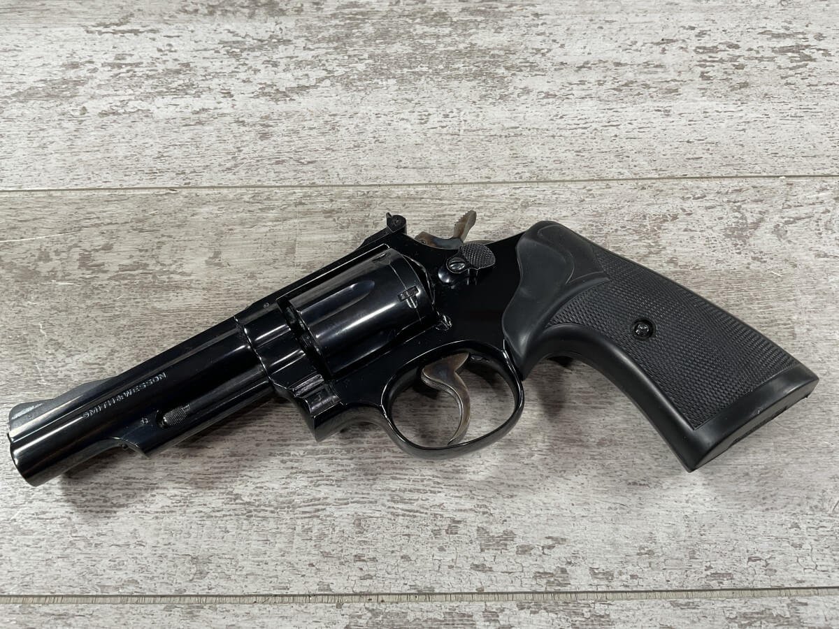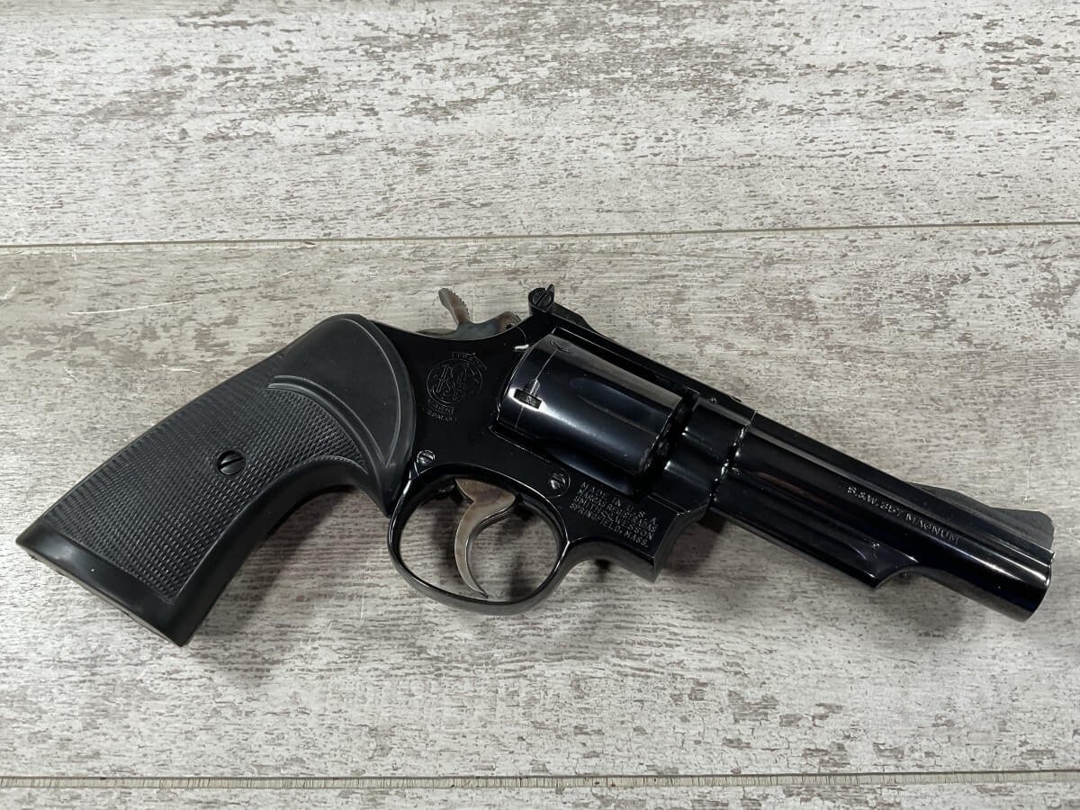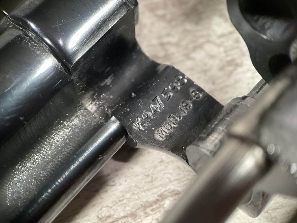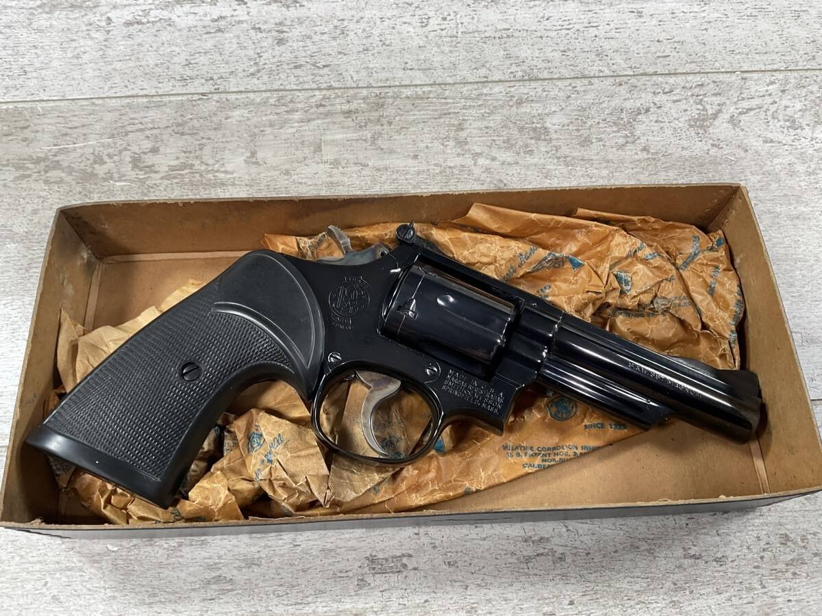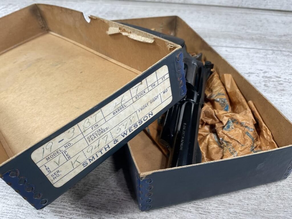S&W, SMITH & WESSON 19-3 .357 COMBAT MAGNUM REVOLVER W/ORIGINAL PAPER BOX #K947598 4″ BBL, 6-SHOT, ADJ REAR SIGHT, BLADE FRONT SIGHT, PACHMAYR RUBBER PRESENTATION GRIPS, 99+% BLUE, CASE COLOR HAMMER/TRIGGER, ORIGINAL PAPER BOX AND CRAFT PAPER INCLUDED, 98+%