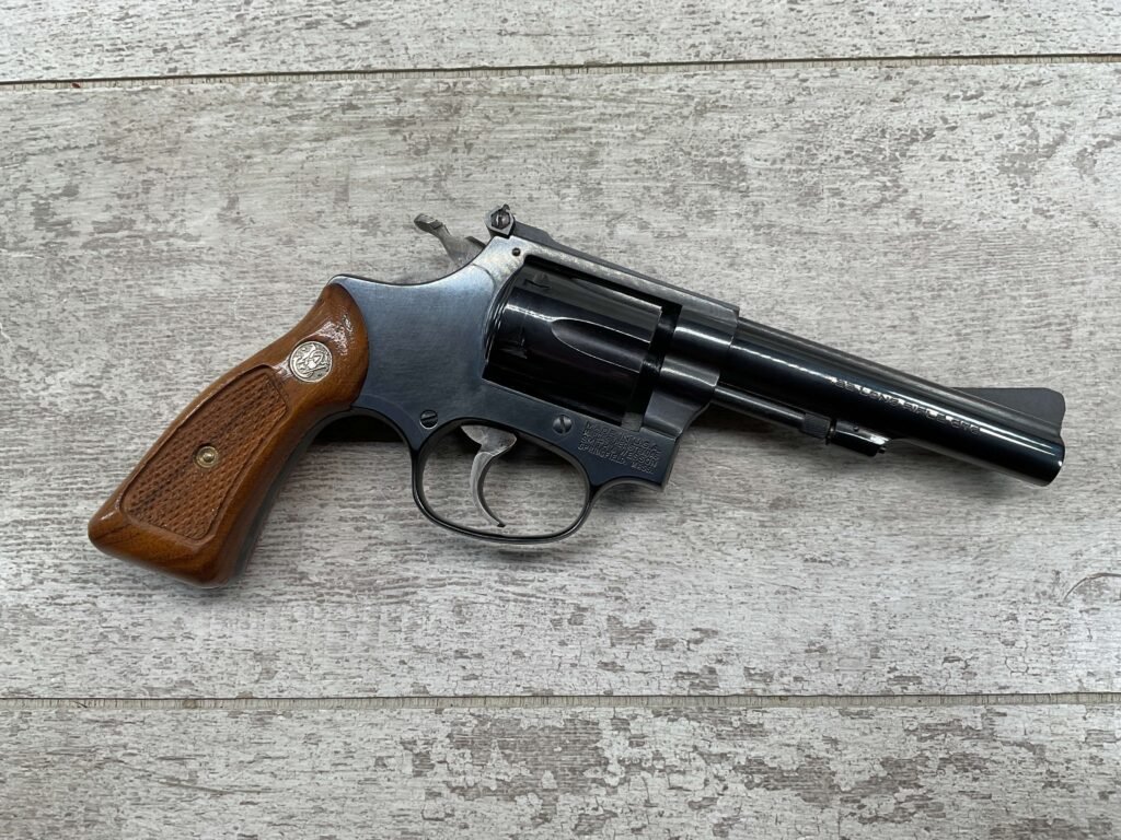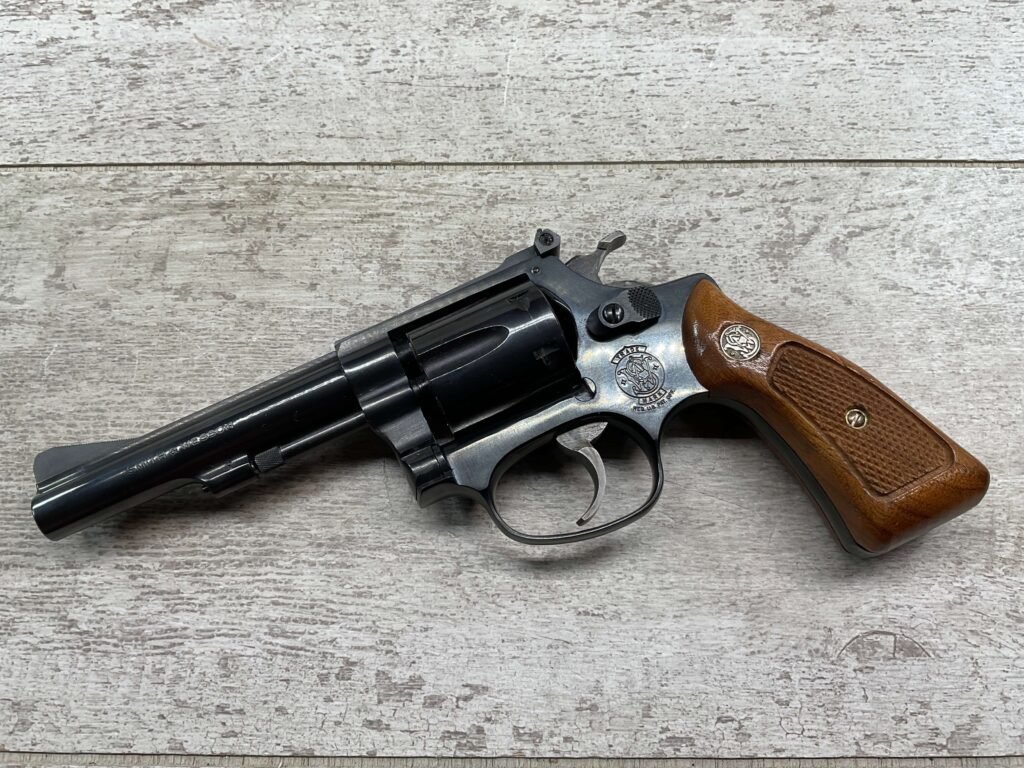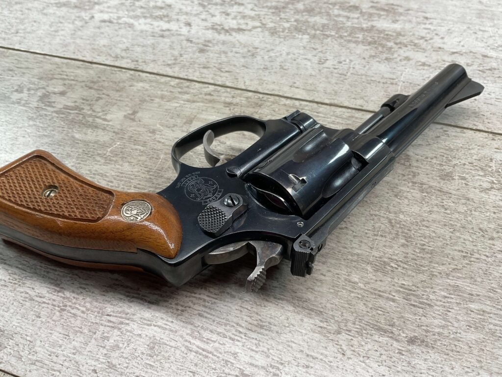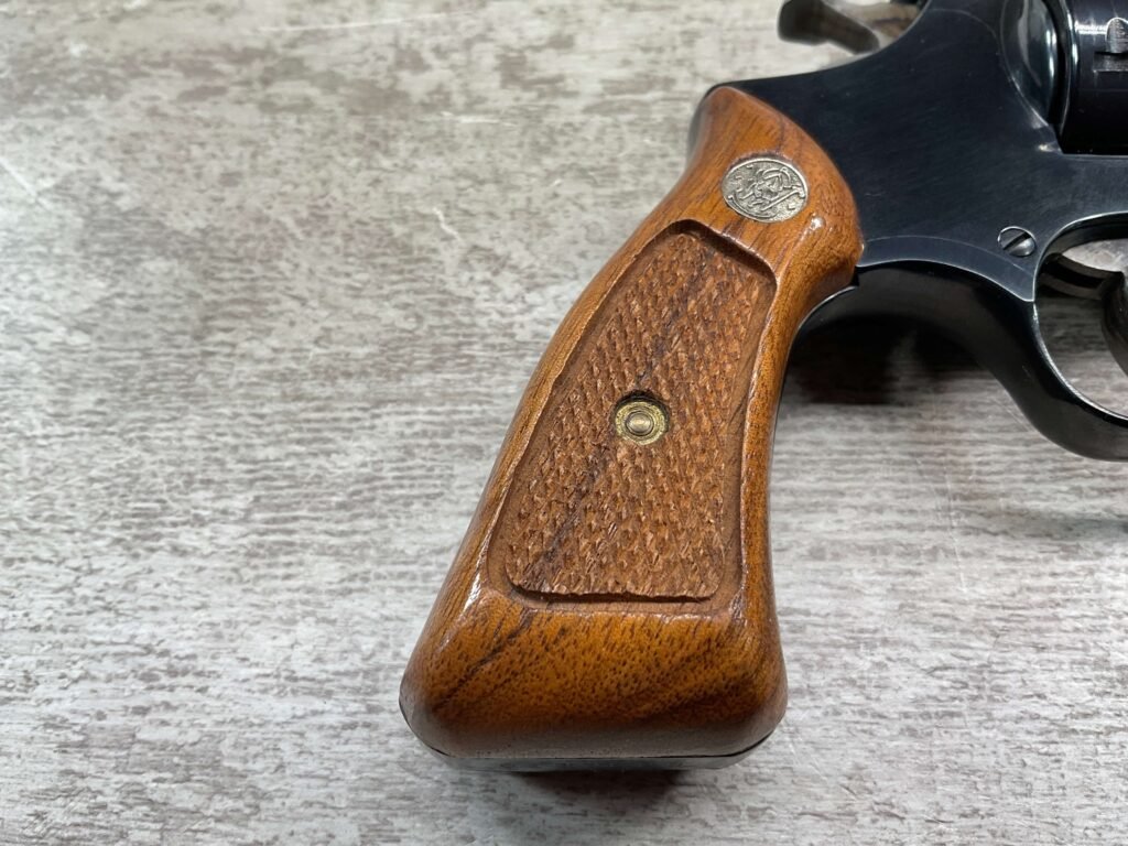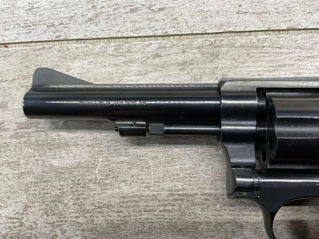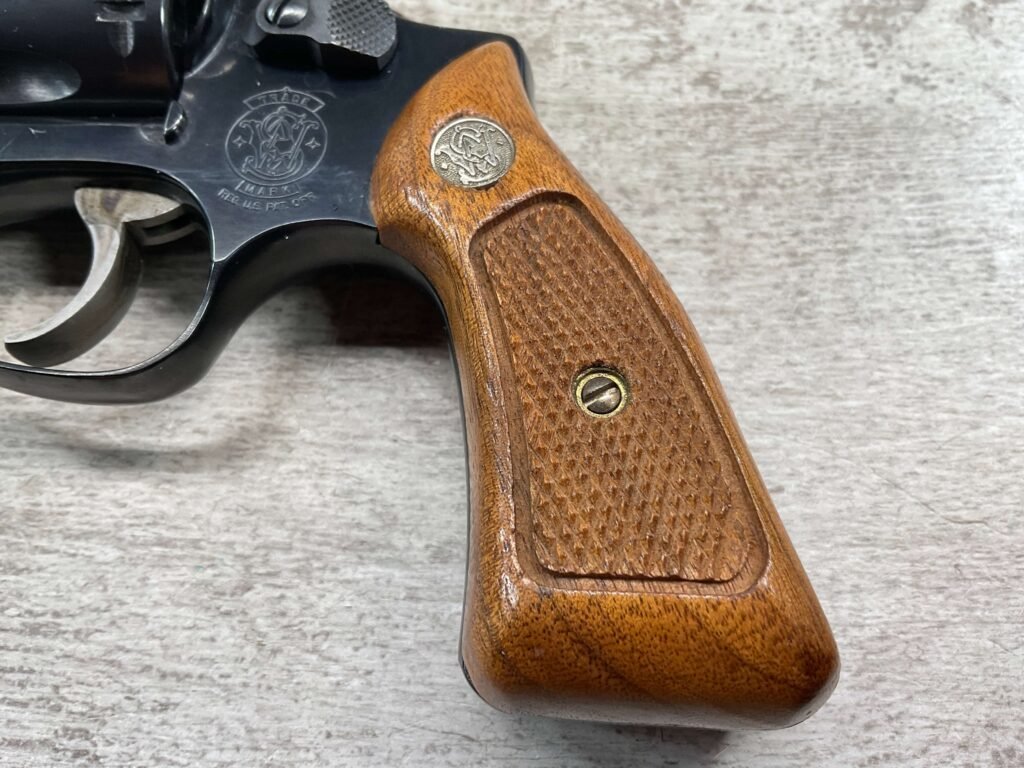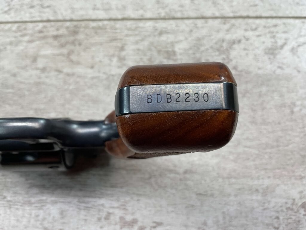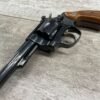 S&W MODEL 34-2 .22LR KIT REVOLVER #BDB2230, 1988 MFR, EXCELLENT CHECKERED WALNUT S&W GRIPS, CASE HARDENED TRIGGER & HAMMER, EXC TIMING & LOCKUP, 4″ BARREL, EXC BORE & RIFLING, APPEARS TO BE UNFIRED, 98+% OVERALL