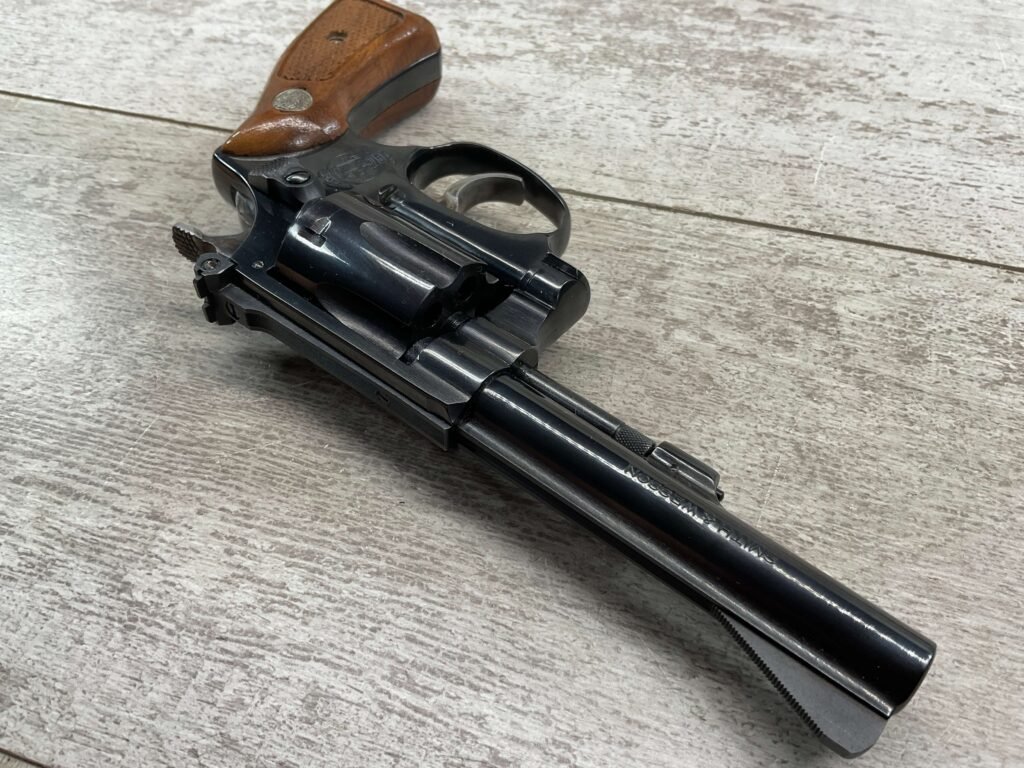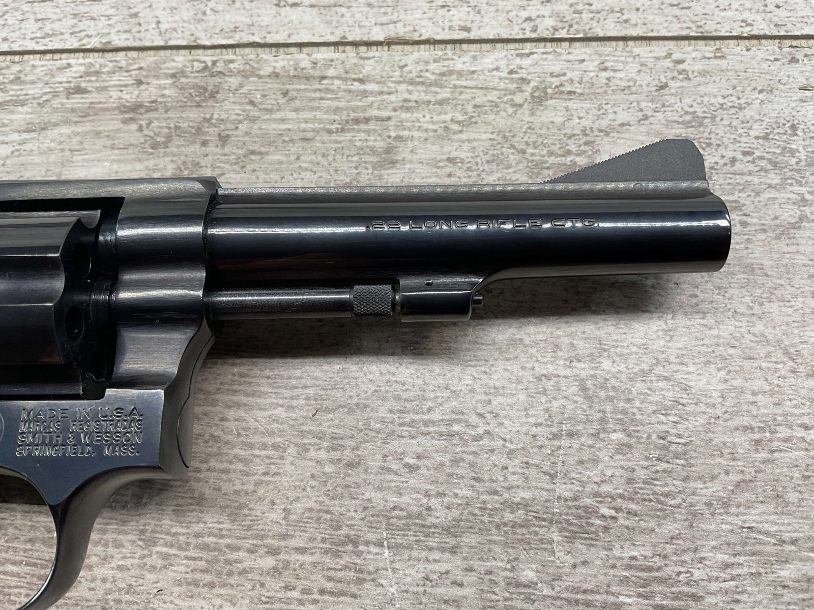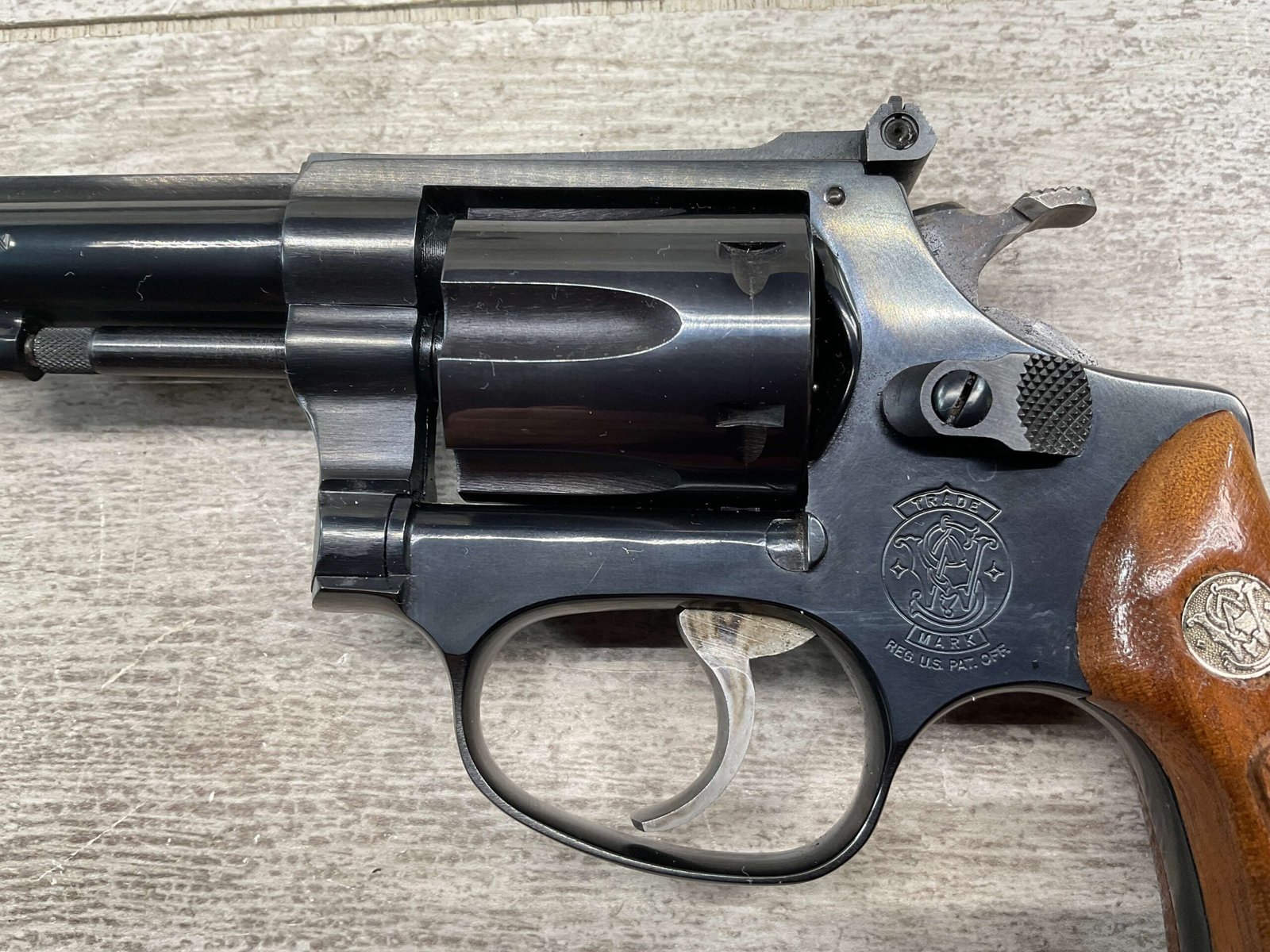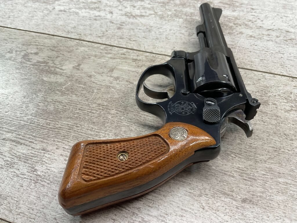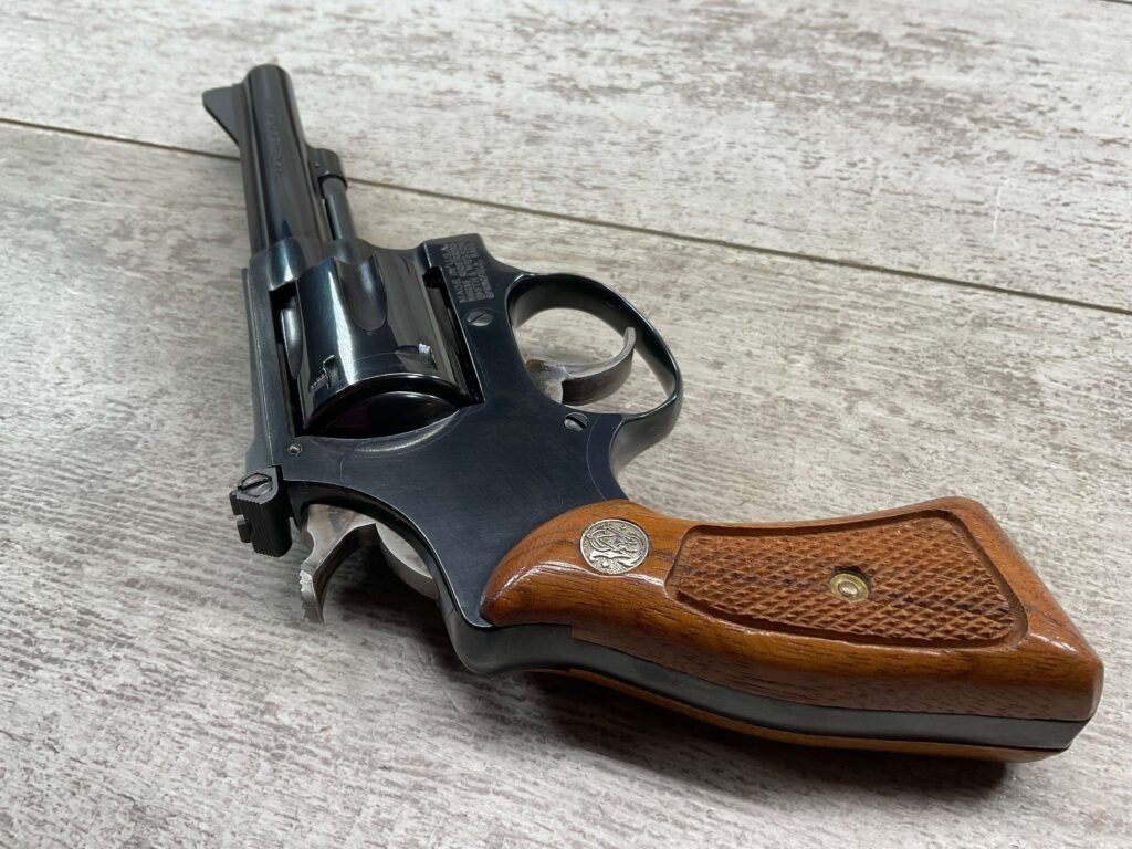 S&W MODEL 34-2 .22LR KIT REVOLVER #BDB2230, 1988 MFR, EXCELLENT CHECKERED WALNUT S&W GRIPS, CASE HARDENED TRIGGER & HAMMER, EXC TIMING & LOCKUP, 4″ BARREL, EXC BORE & RIFLING, APPEARS TO BE UNFIRED, 98+% OVERALL