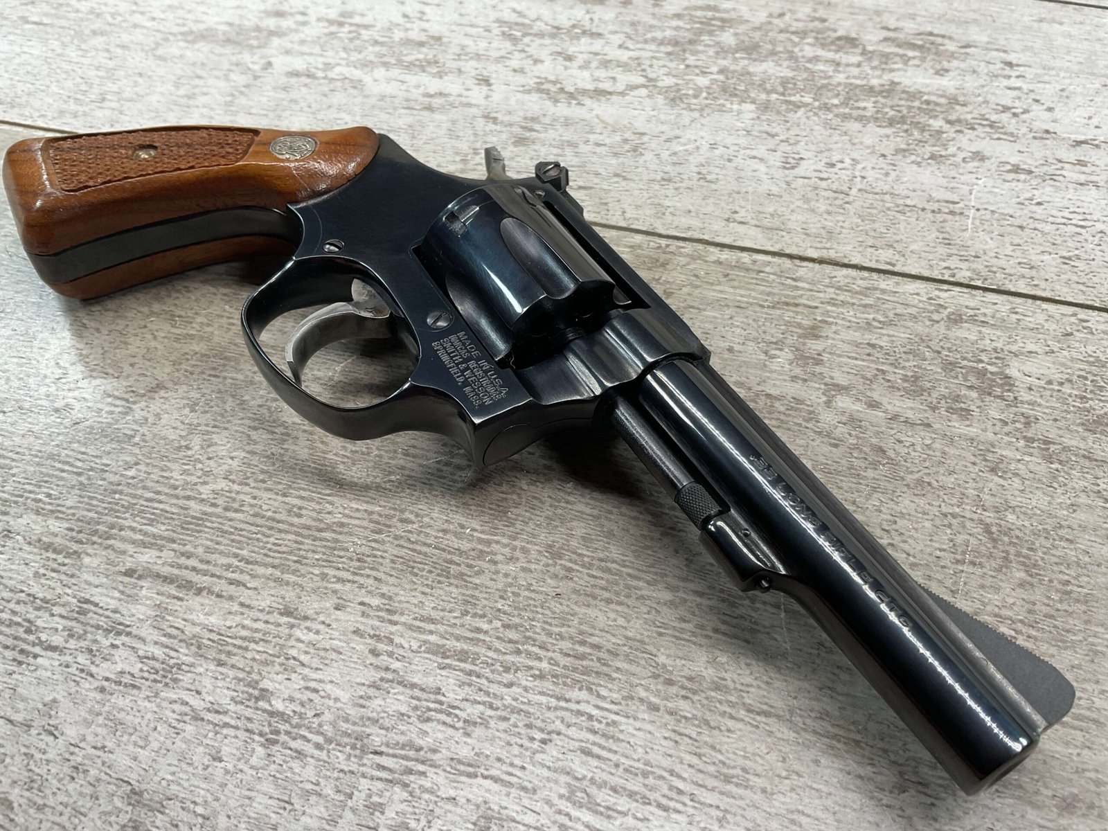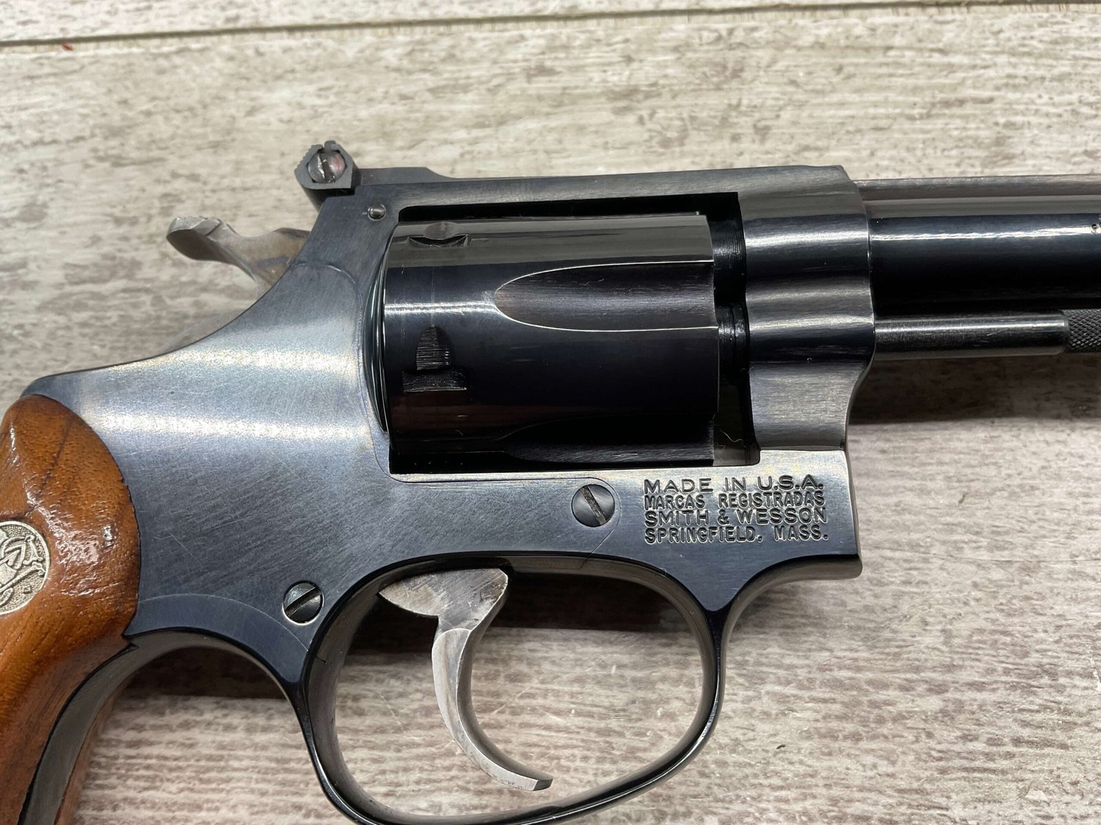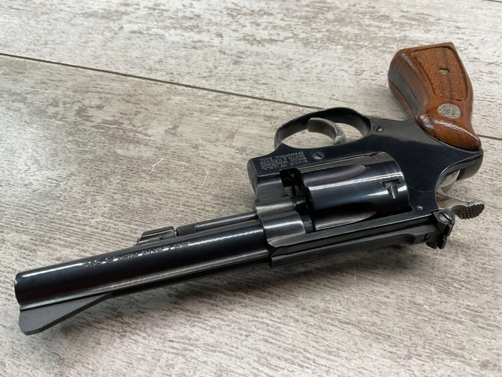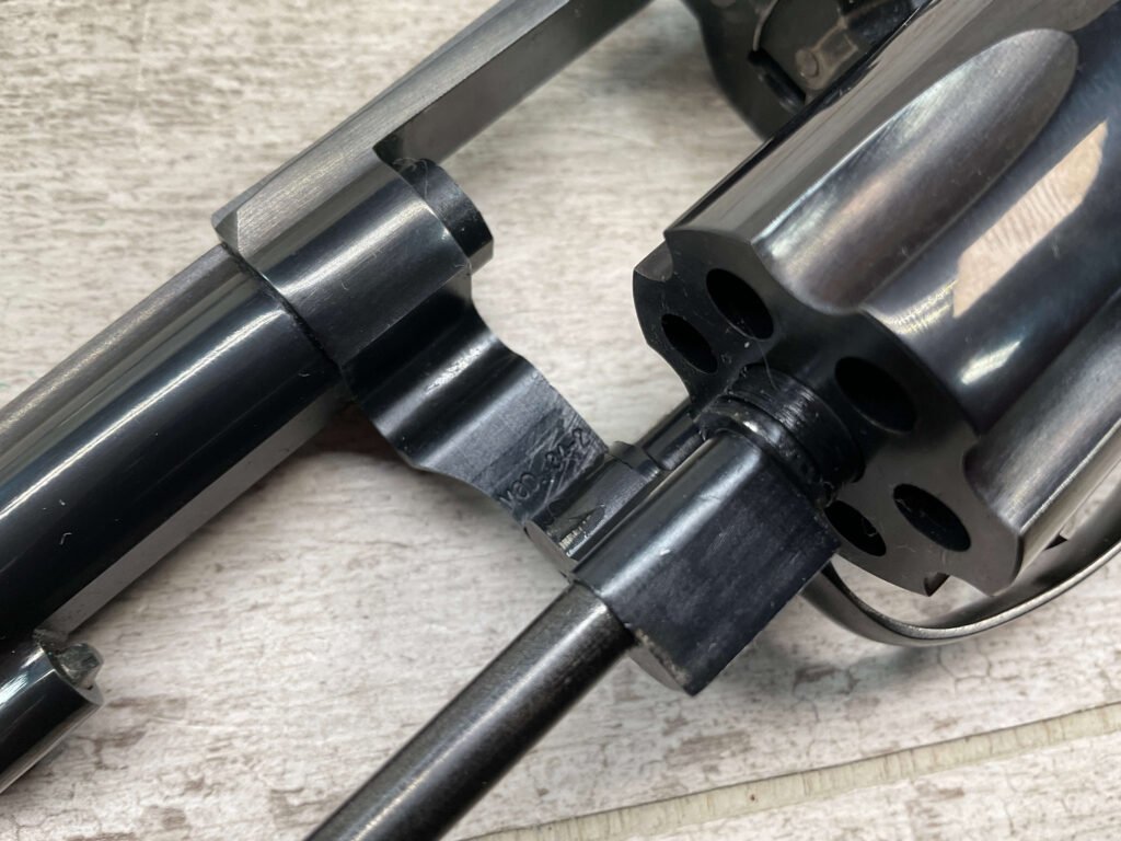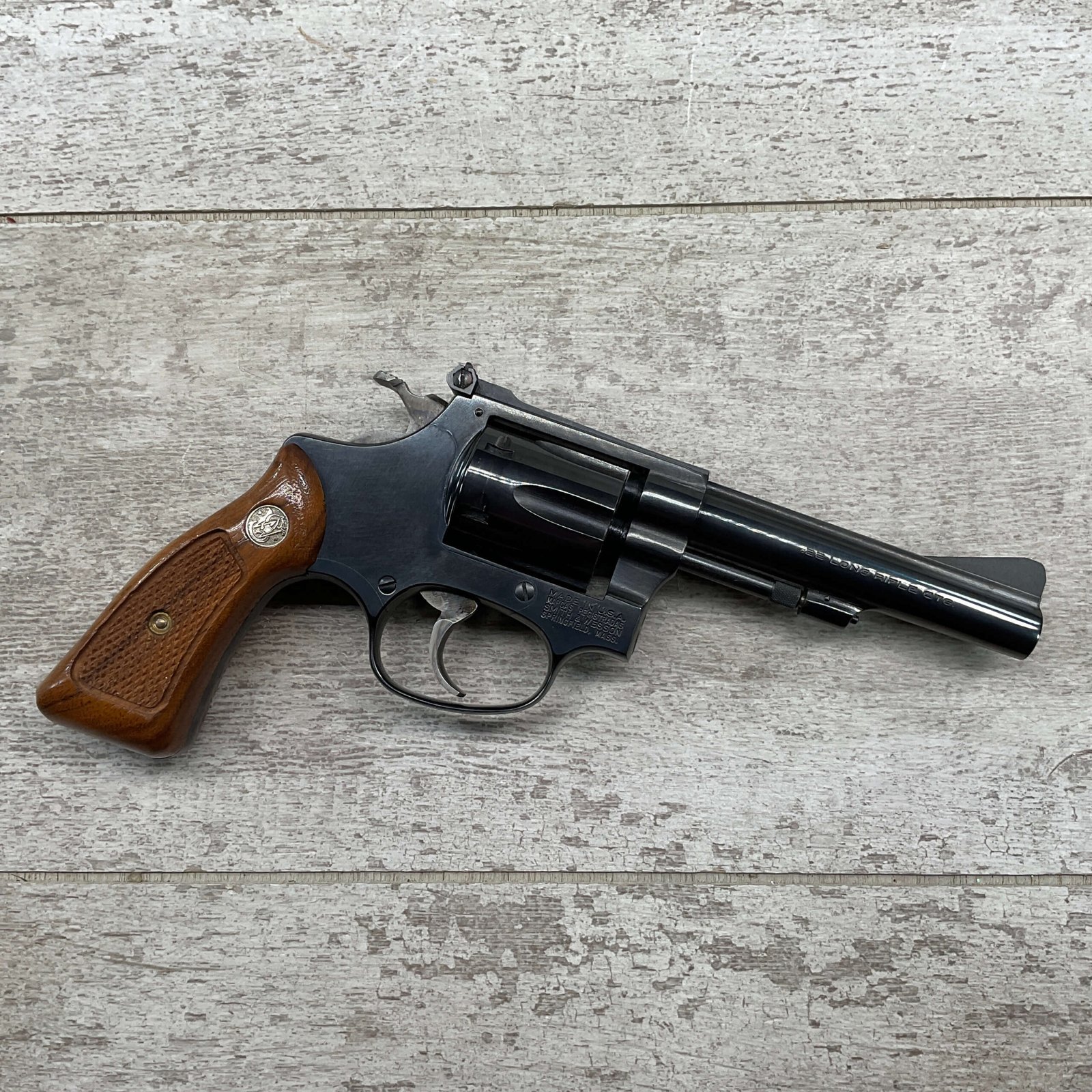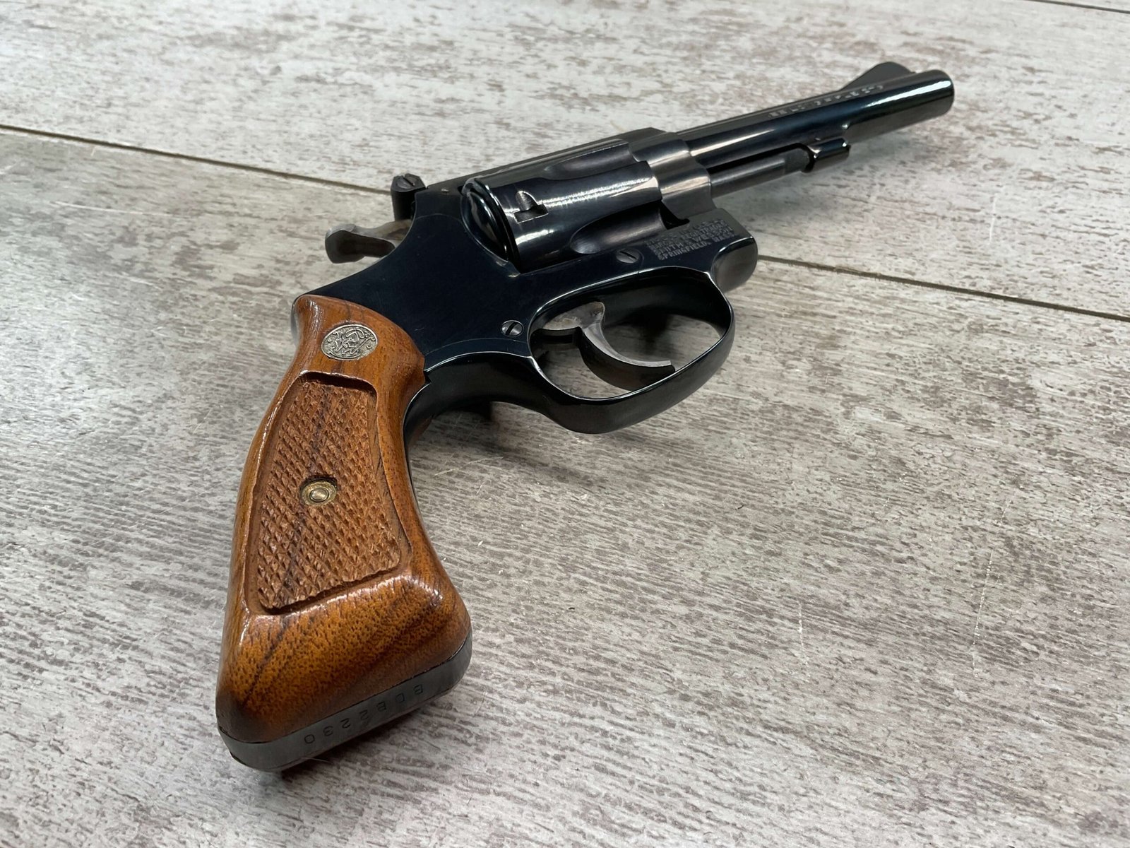 S&W MODEL 34-2 .22LR KIT REVOLVER #BDB2230, 1988 MFR, EXCELLENT CHECKERED WALNUT S&W GRIPS, CASE HARDENED TRIGGER & HAMMER, EXC TIMING & LOCKUP, 4″ BARREL, EXC BORE & RIFLING, APPEARS TO BE UNFIRED, 98+% OVERALL