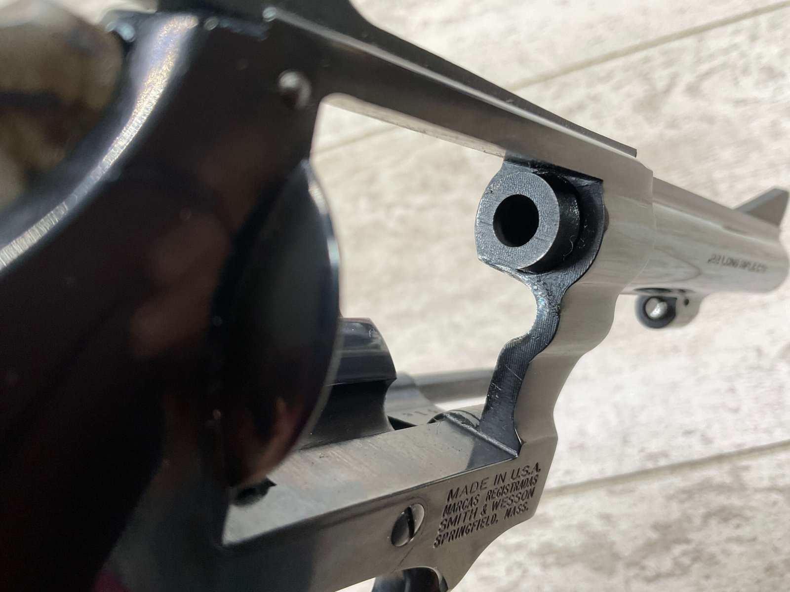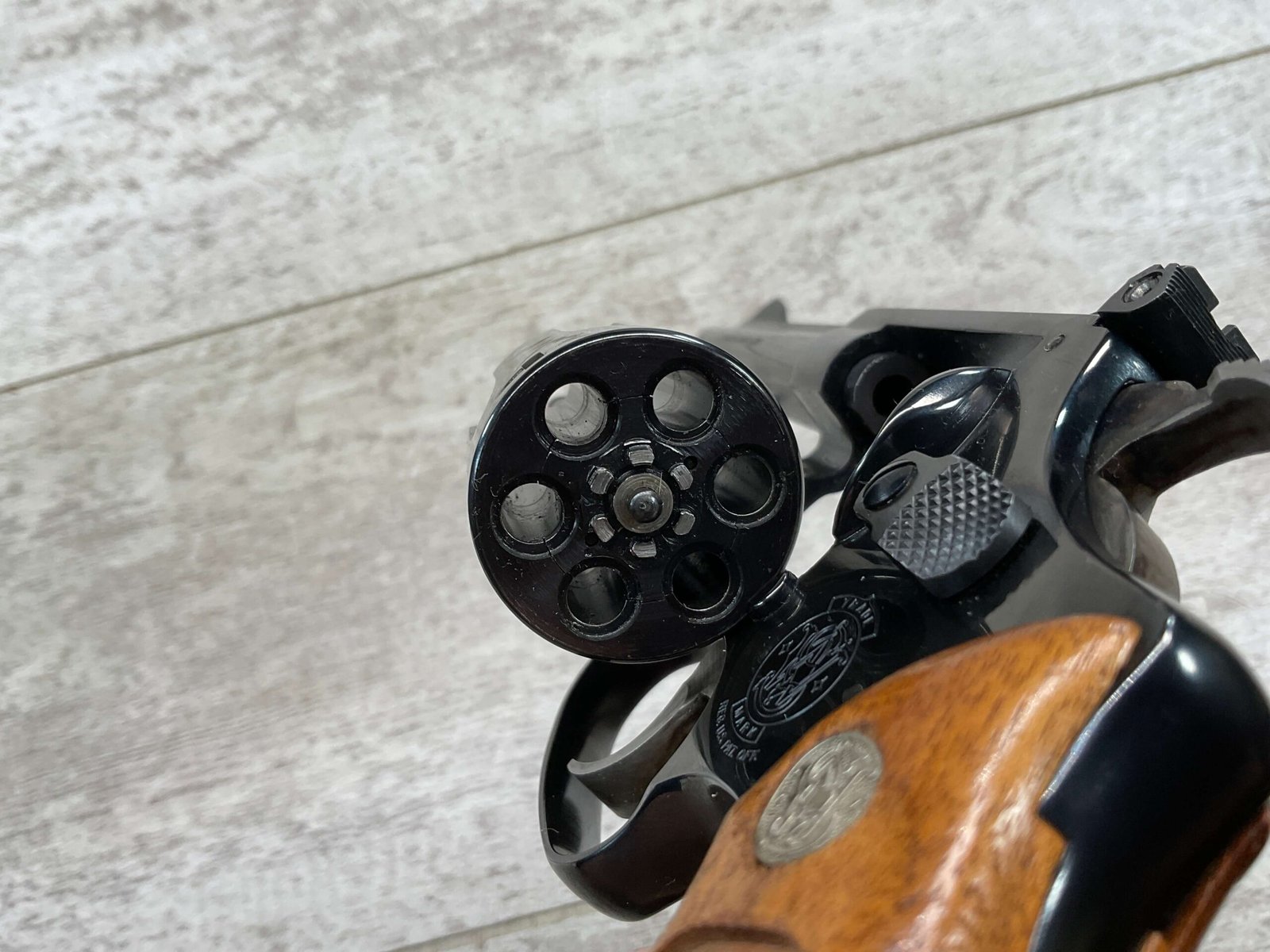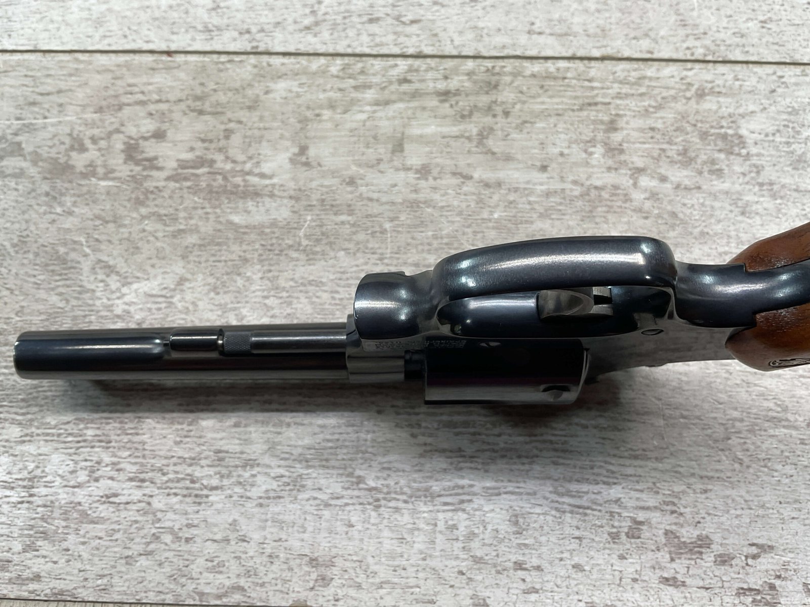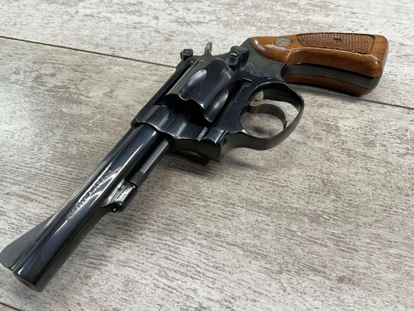 S&W MODEL 34-2 .22LR KIT REVOLVER #BDB2230, 1988 MFR, EXCELLENT CHECKERED WALNUT S&W GRIPS, CASE HARDENED TRIGGER & HAMMER, EXC TIMING & LOCKUP, 4″ BARREL, EXC BORE & RIFLING, APPEARS TO BE UNFIRED, 98+% OVERALL
