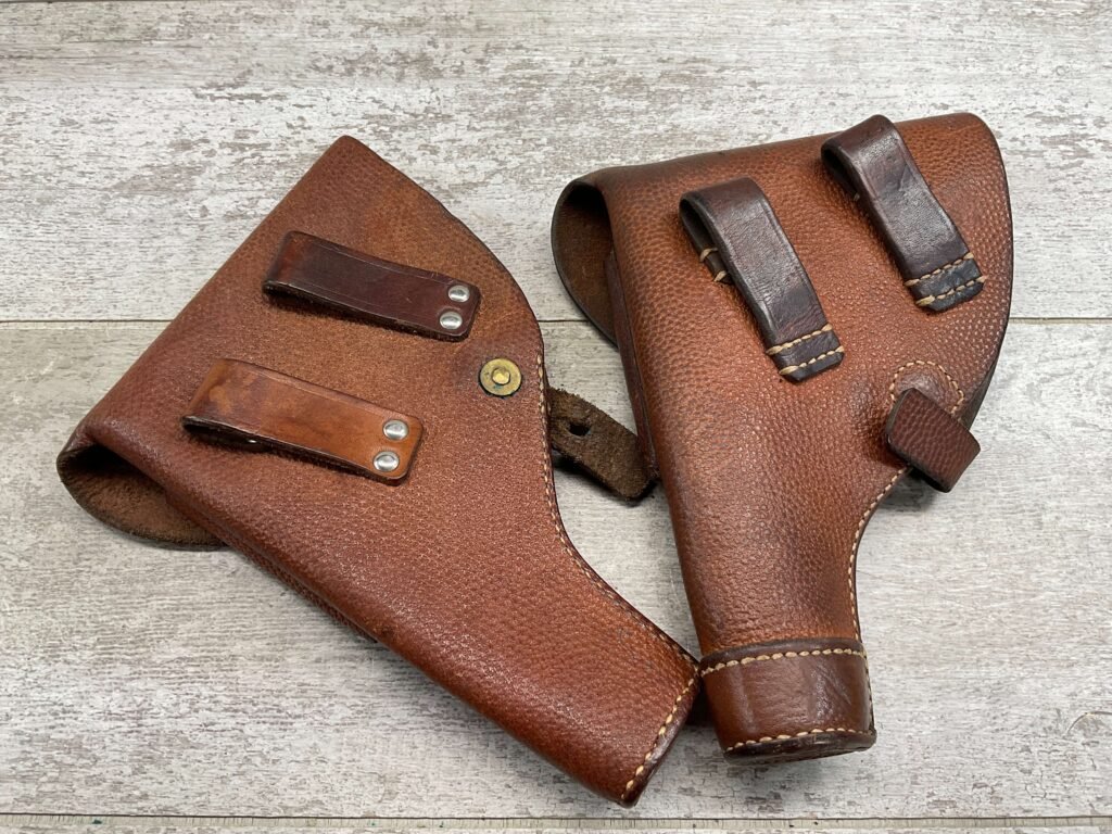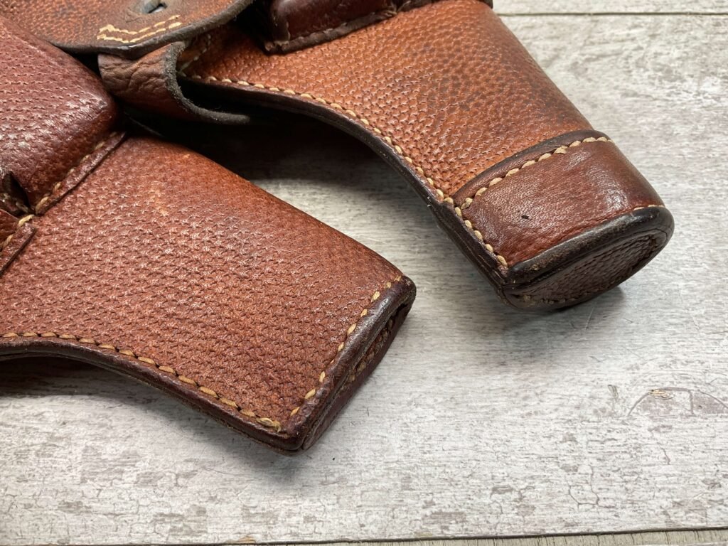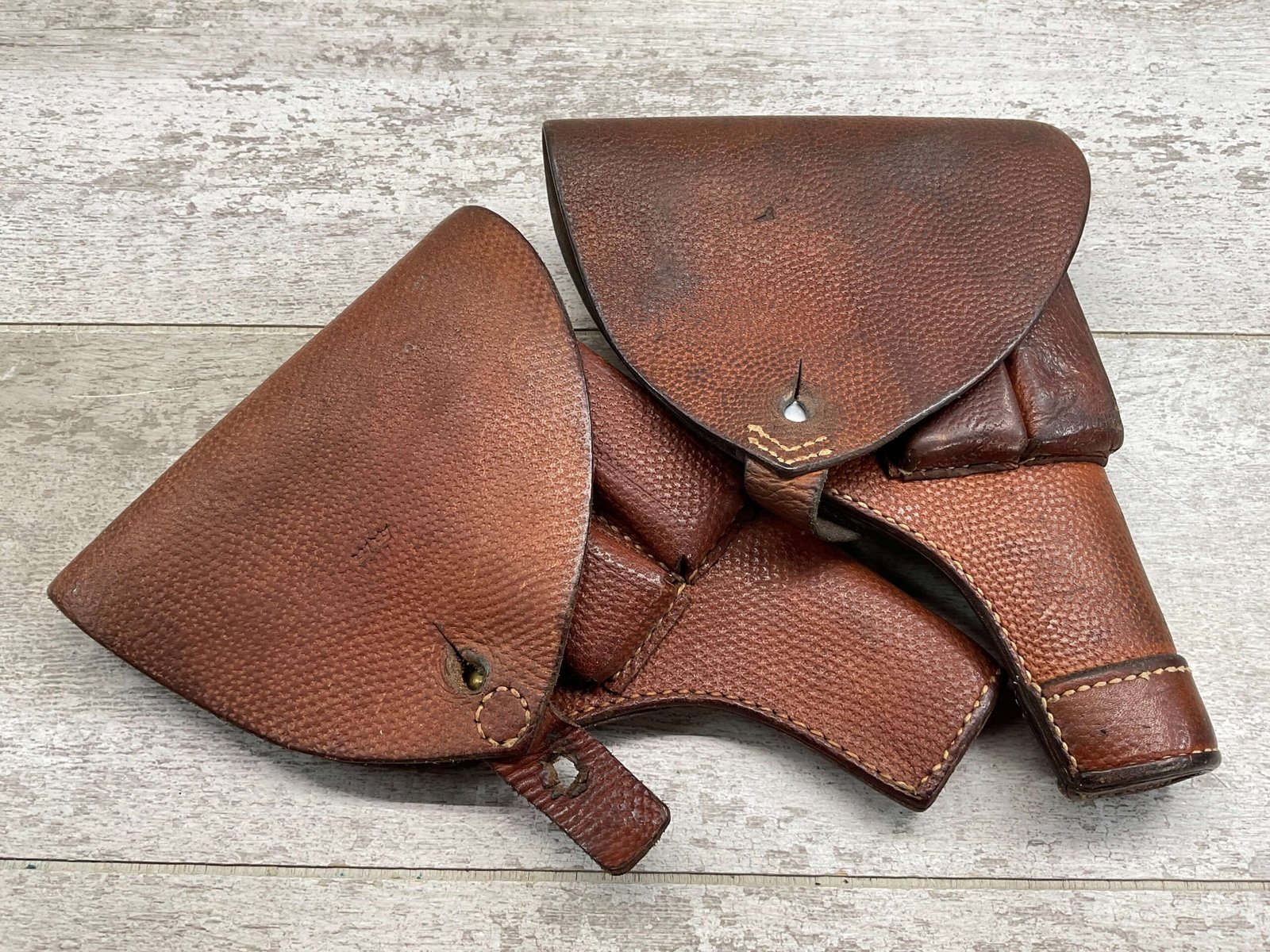 LOT OF TWO (2) ORIGINAL PEBBLE GRAINED LEATHER HOLSTER FOR BROWNING 1907 PISTOL, ONE W/ TRIPLE CROWN STAMPED ON FRONT FLAP, OTHER NOT MARKED, BOTH IN VG-EXC CONDITION