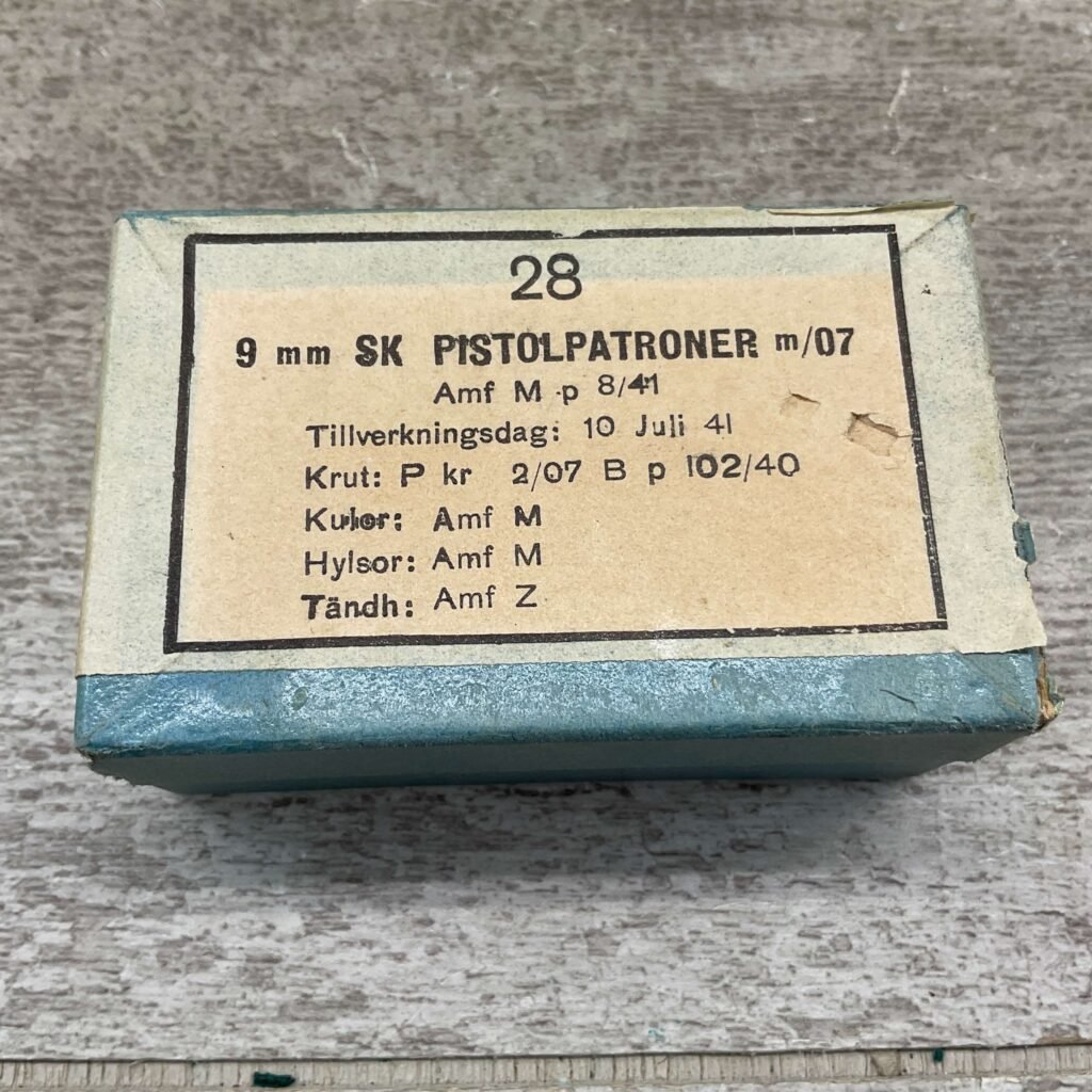 SWEDISH MILITARY 9MM BROWNING LONG AMMUNITION 9X20MM, WW2, MADE FOR BROWNING MODEL 1907 PISTOL ADOPTED BY SWEDEN, ORIGINAL CARTRIDGE FOR SWEDISH M/07, SURPLUS M/07 PISTOLS WHERE MODIFIED TO .380 ACP. IF YOU HAVE AN ORIGINAL M/07 YOU NEED THIS AMMO. EXC. CONDITION, 28 PER BOX, FULL BOX, MANY AVAILABLE.