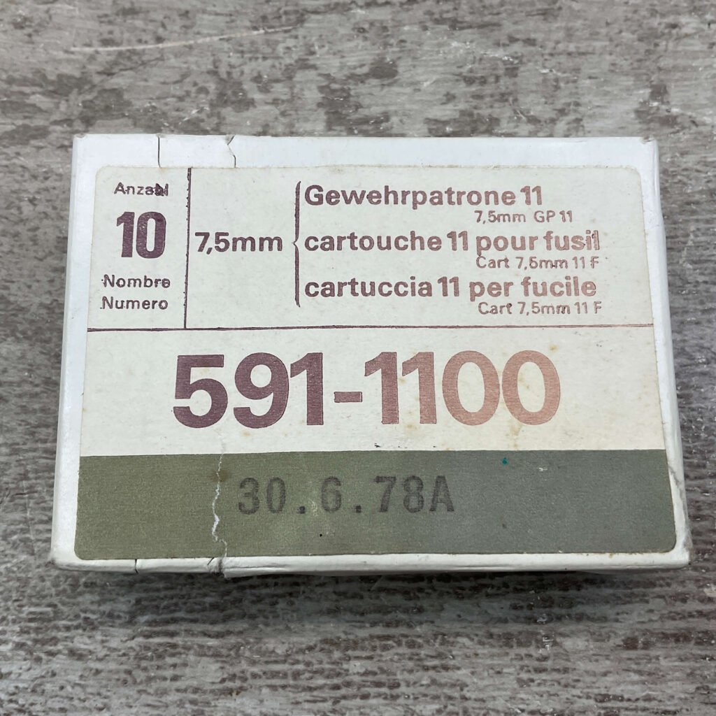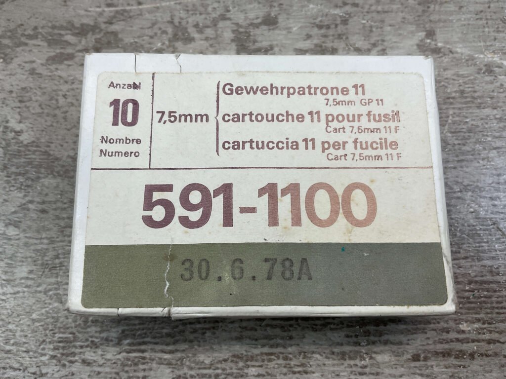 SWISS 7.5X55MM GEWEHRPATRONE 11 (GP11) 591-1100 AMMO, SCHMIDT RUBIN, UNOPENED, BOX IS IN EXC CONDITION WITH LABELING SLIGHTLY WEARING.