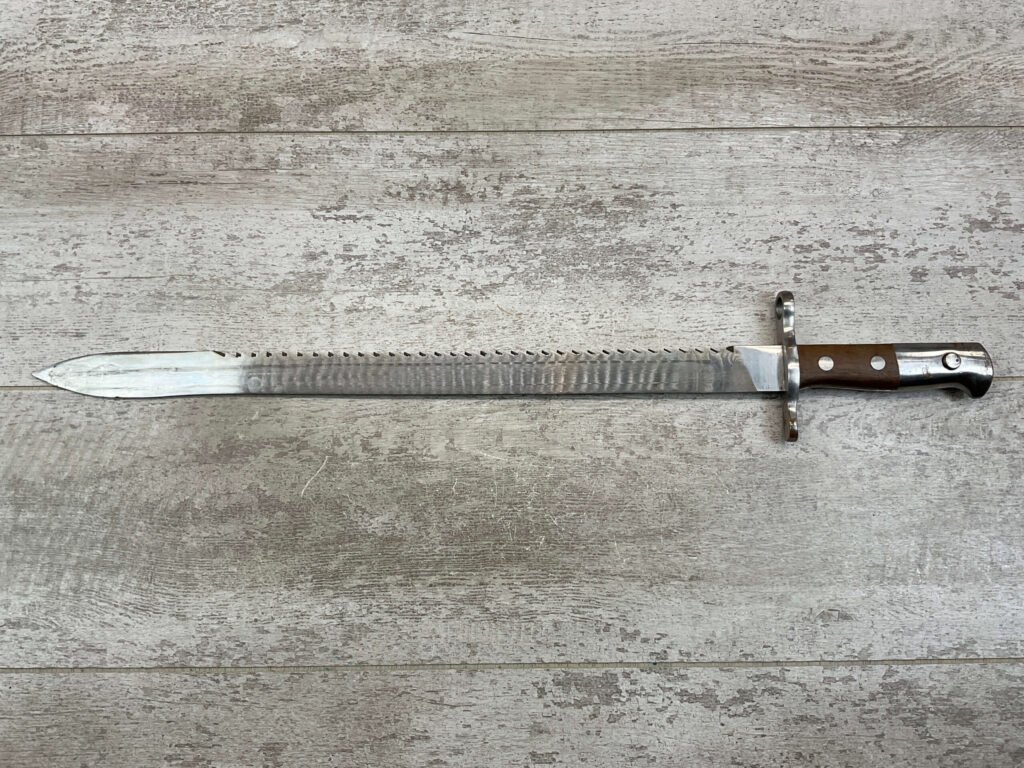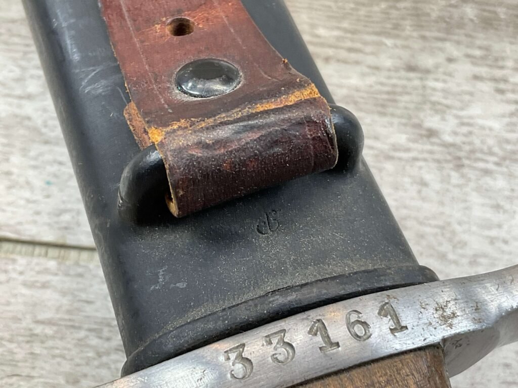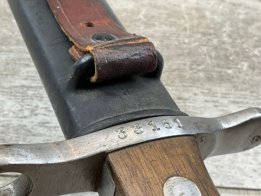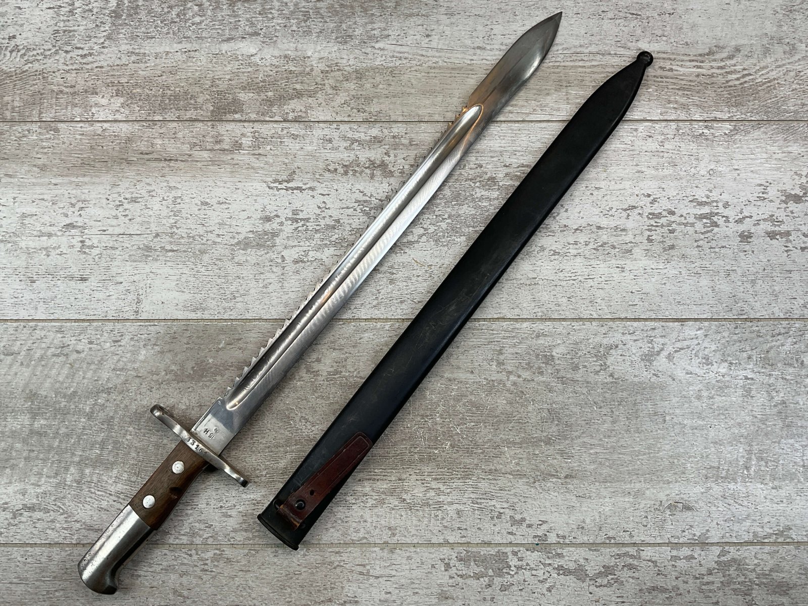 SWISS M1914 PIONEER SAWBACK SWORD/BAYONET W/SCABBARD, ANTIQUE, RICASSO MARKED “SWISS CROSS / H.St”, GUARD MARKED WITH SERIAL NUMBER “33161”, TOPMOUNT HAS CURSIVE “P” MARK, FINIAL MARKED ON ONE SIDE WITH “+”, IN EXC CONDITION AND A RARE, COOL FIND!