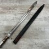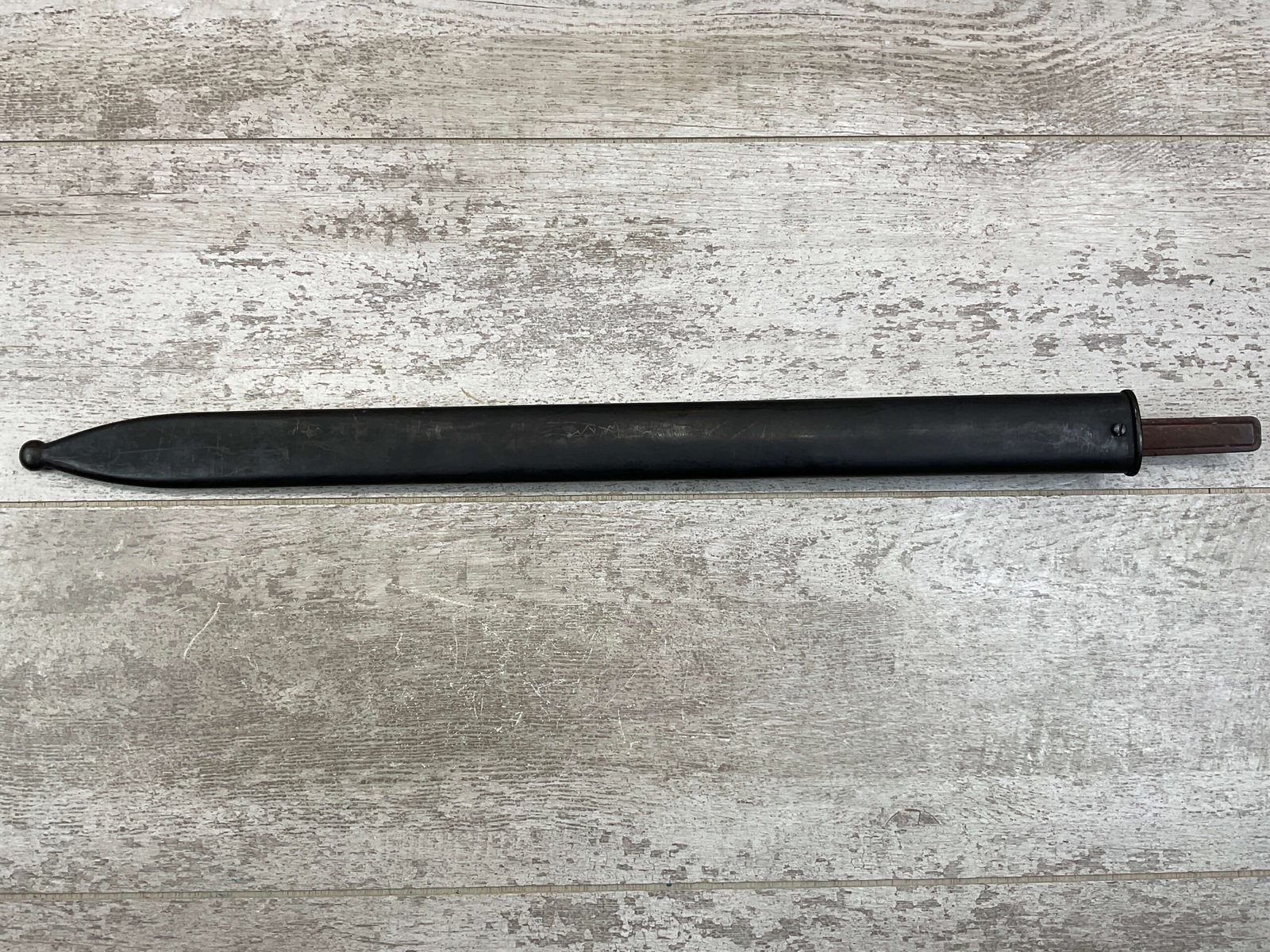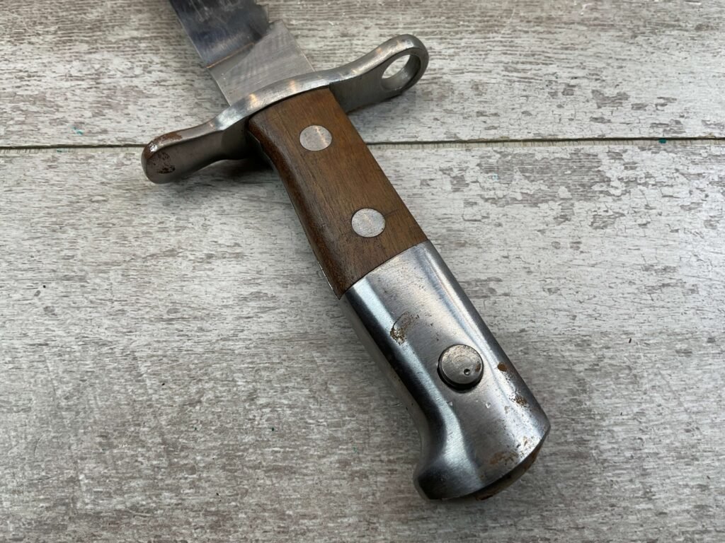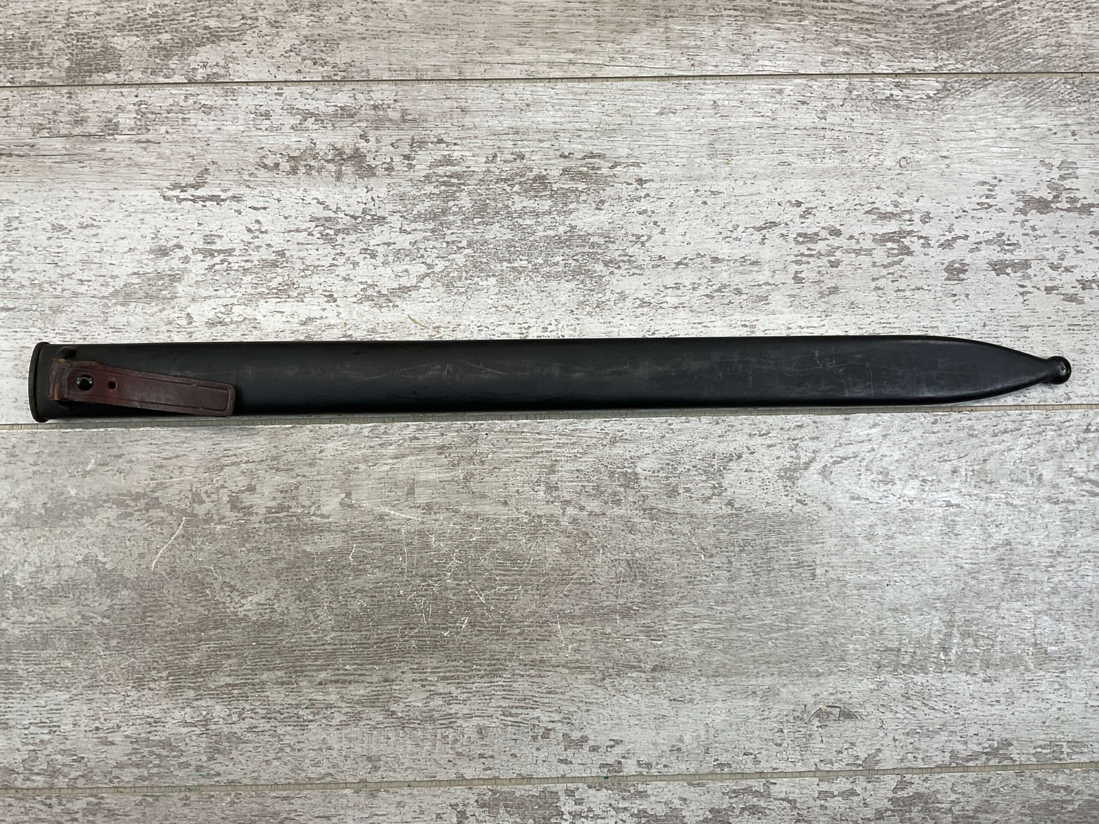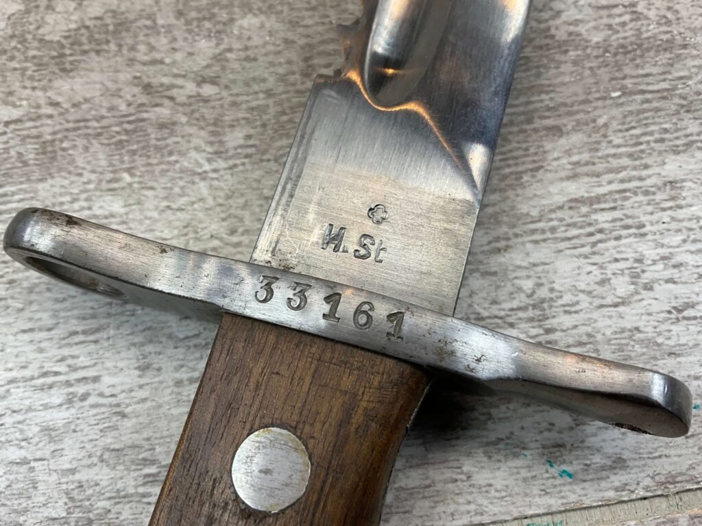 SWISS M1914 PIONEER SAWBACK SWORD/BAYONET W/SCABBARD, ANTIQUE, RICASSO MARKED “SWISS CROSS / H.St”, GUARD MARKED WITH SERIAL NUMBER “33161”, TOPMOUNT HAS CURSIVE “P” MARK, FINIAL MARKED ON ONE SIDE WITH “+”, IN EXC CONDITION AND A RARE, COOL FIND!