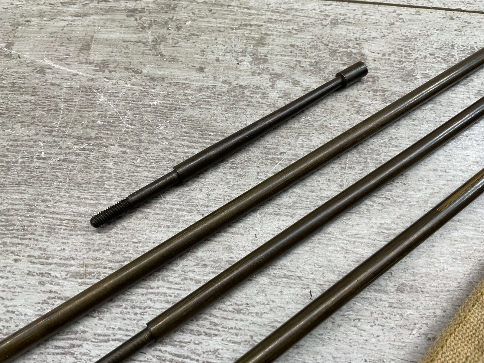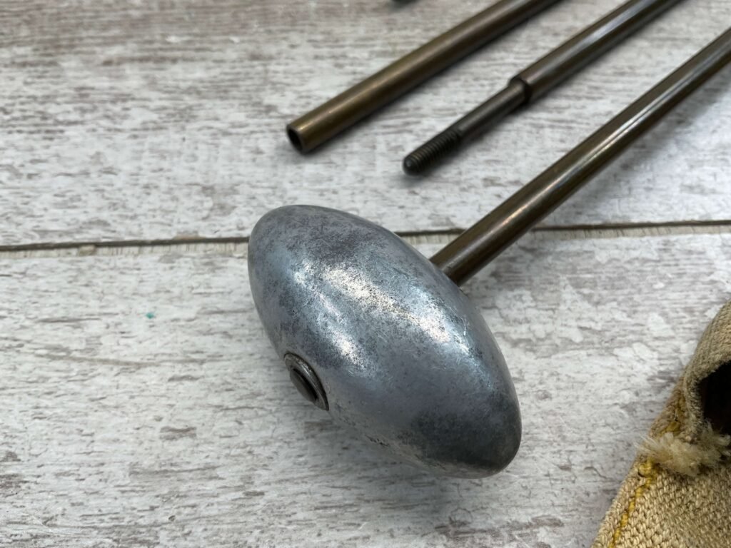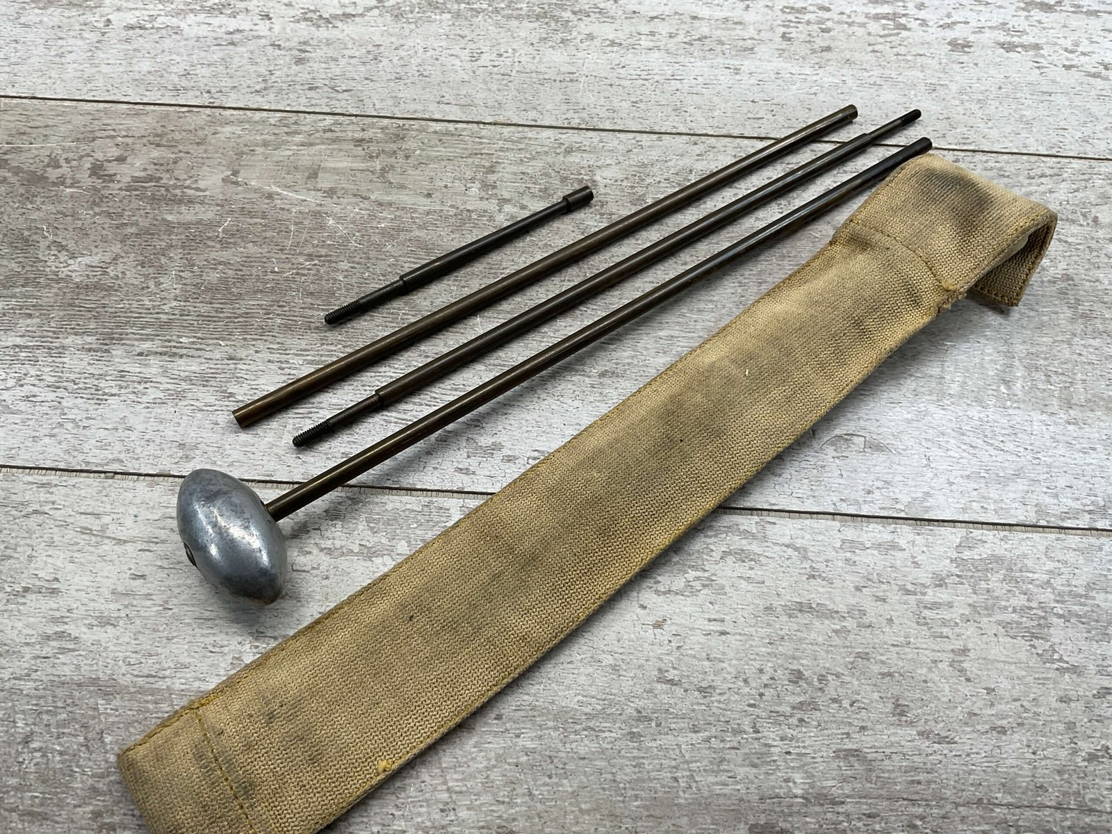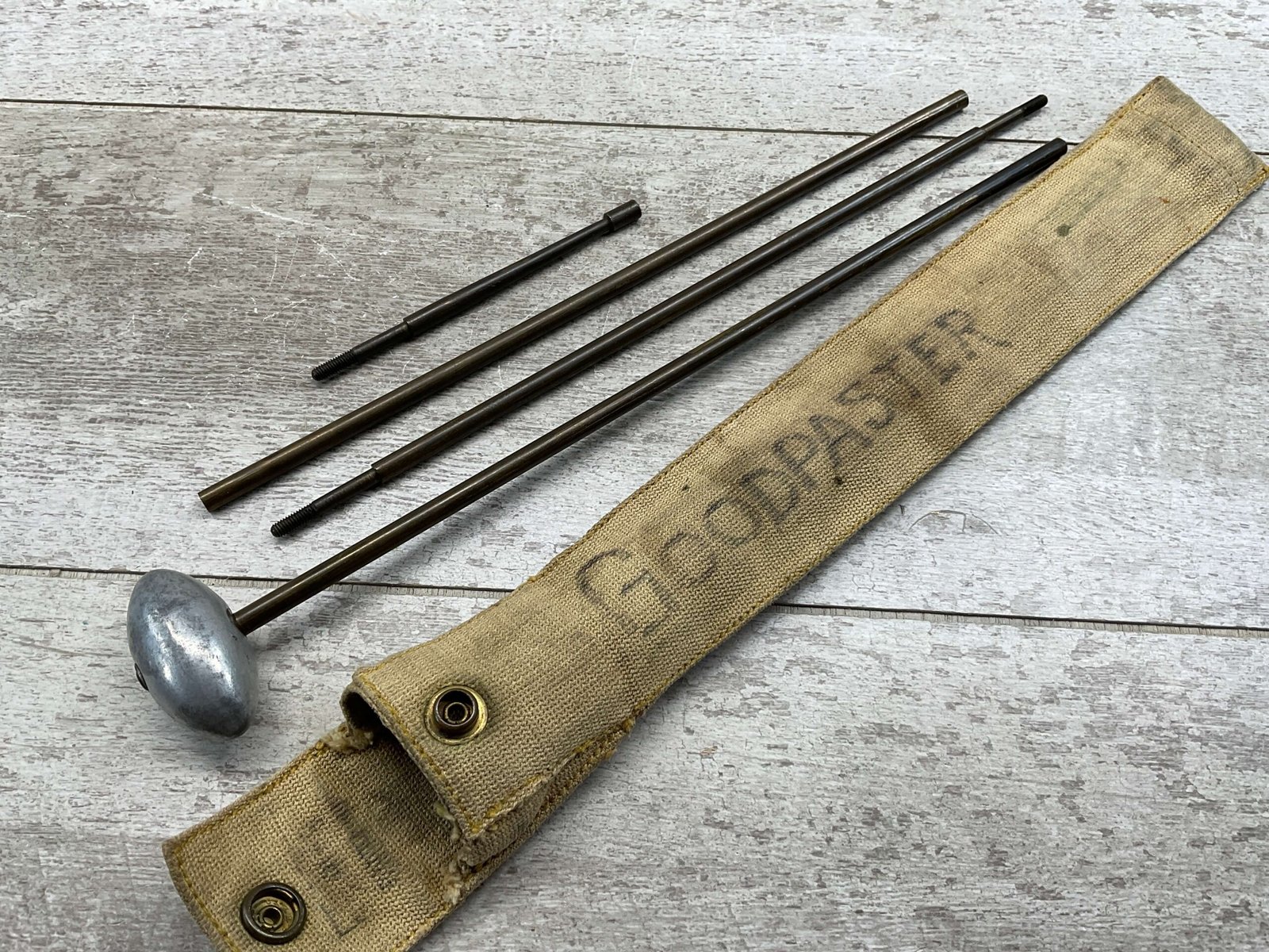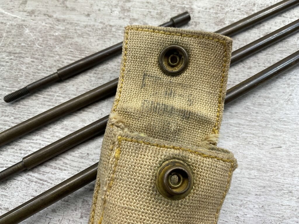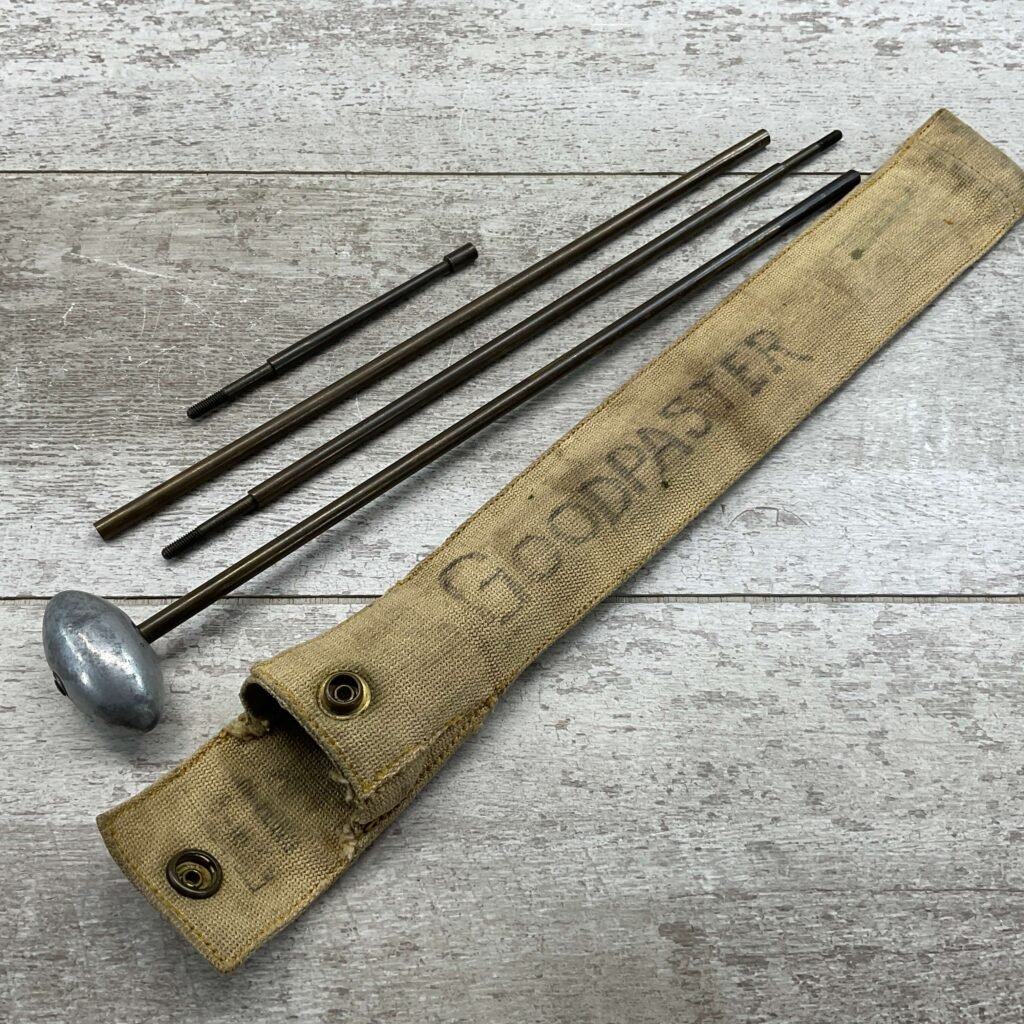 SWISS RIFLE CLEANING KIT, CAST ALUMINUM HANDLE WITH BRASS RODS TOTAL LENGTH 35″, CANVAS TAN POUCH WITH “GOODPASTER” WRITTEN ON ONE SIDE.
