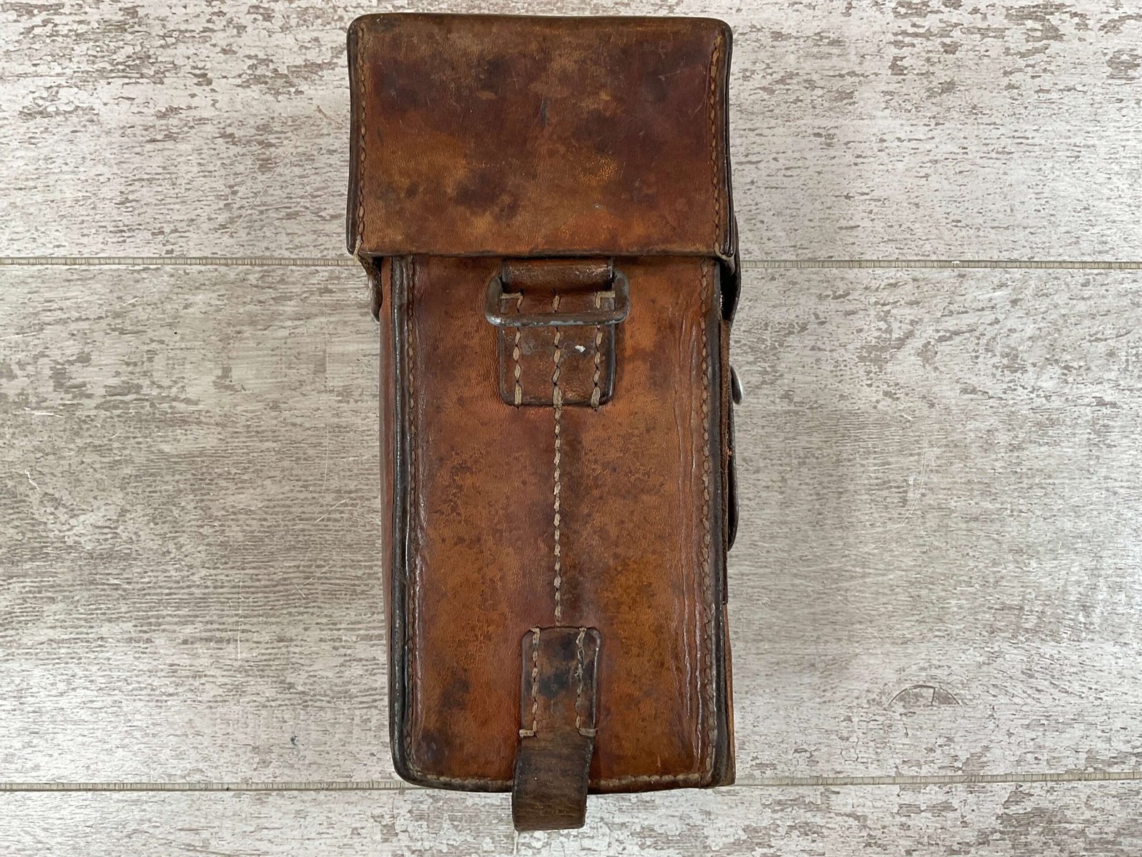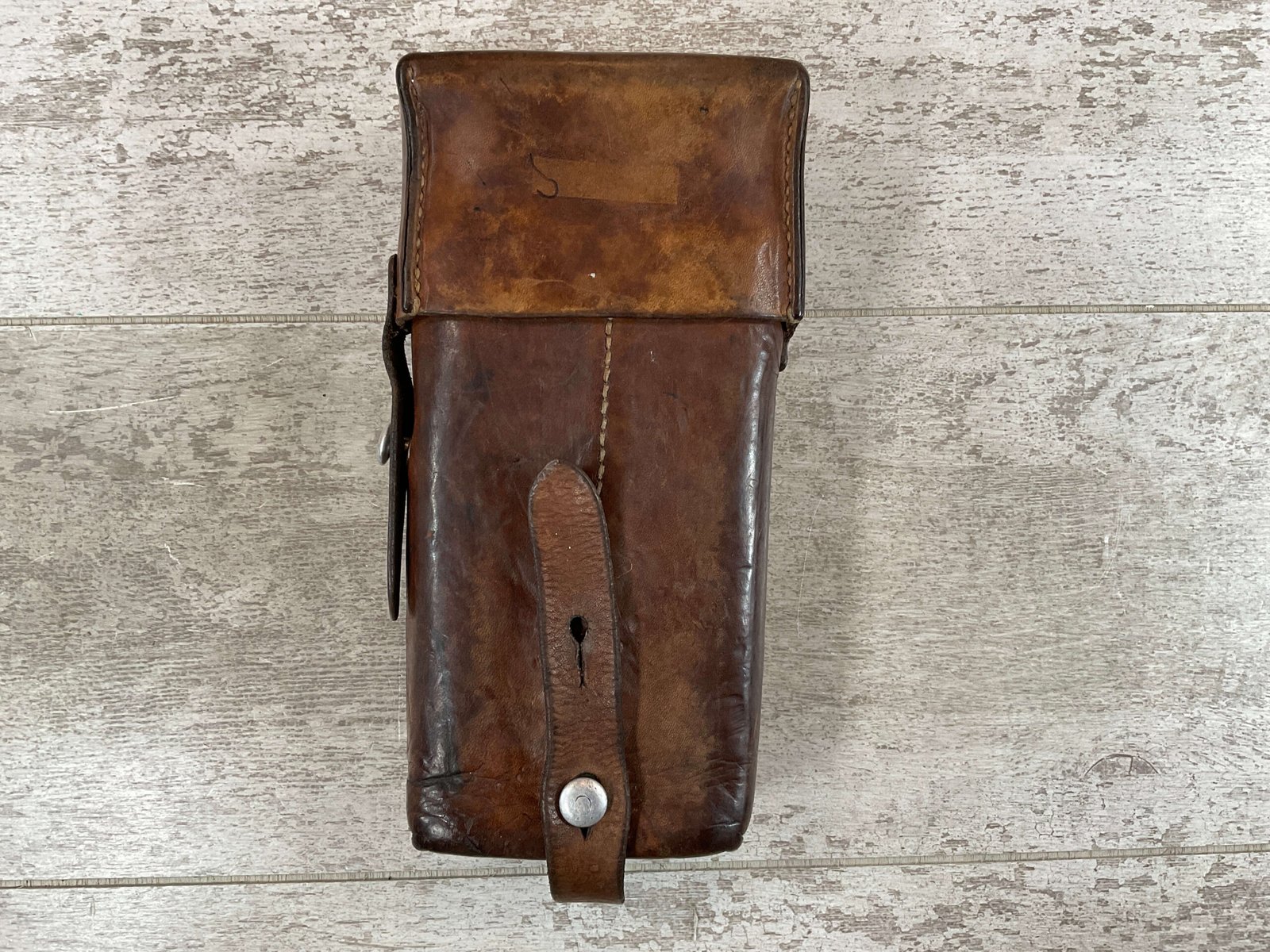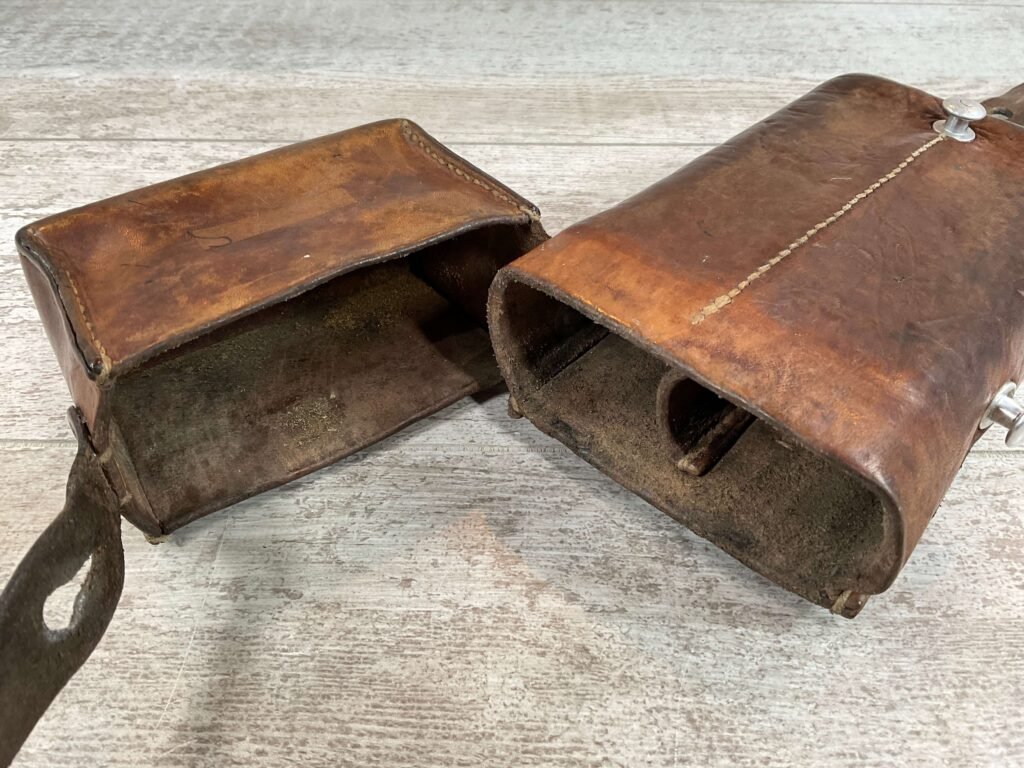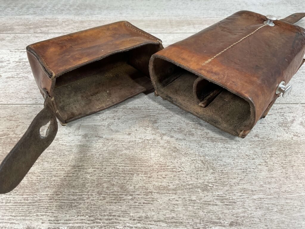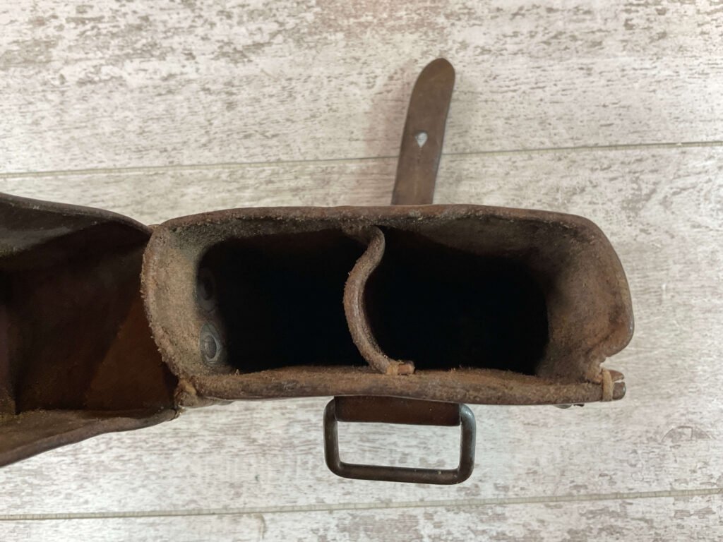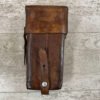 SWISS SMG LEATHER MAG POUCH, 9″ TALL, GOOD LEATHER, MISSING OTHER HALF (THIS WAS A TWO PACK WITH STRAPS ORIGINALLY), VG CONDITION FOR AGE