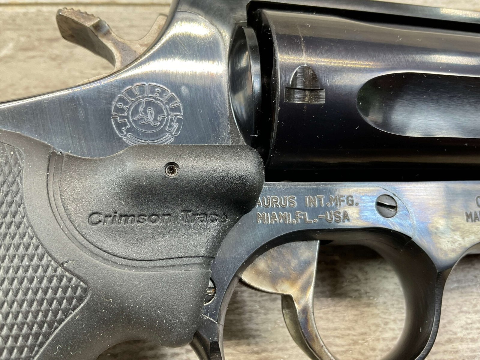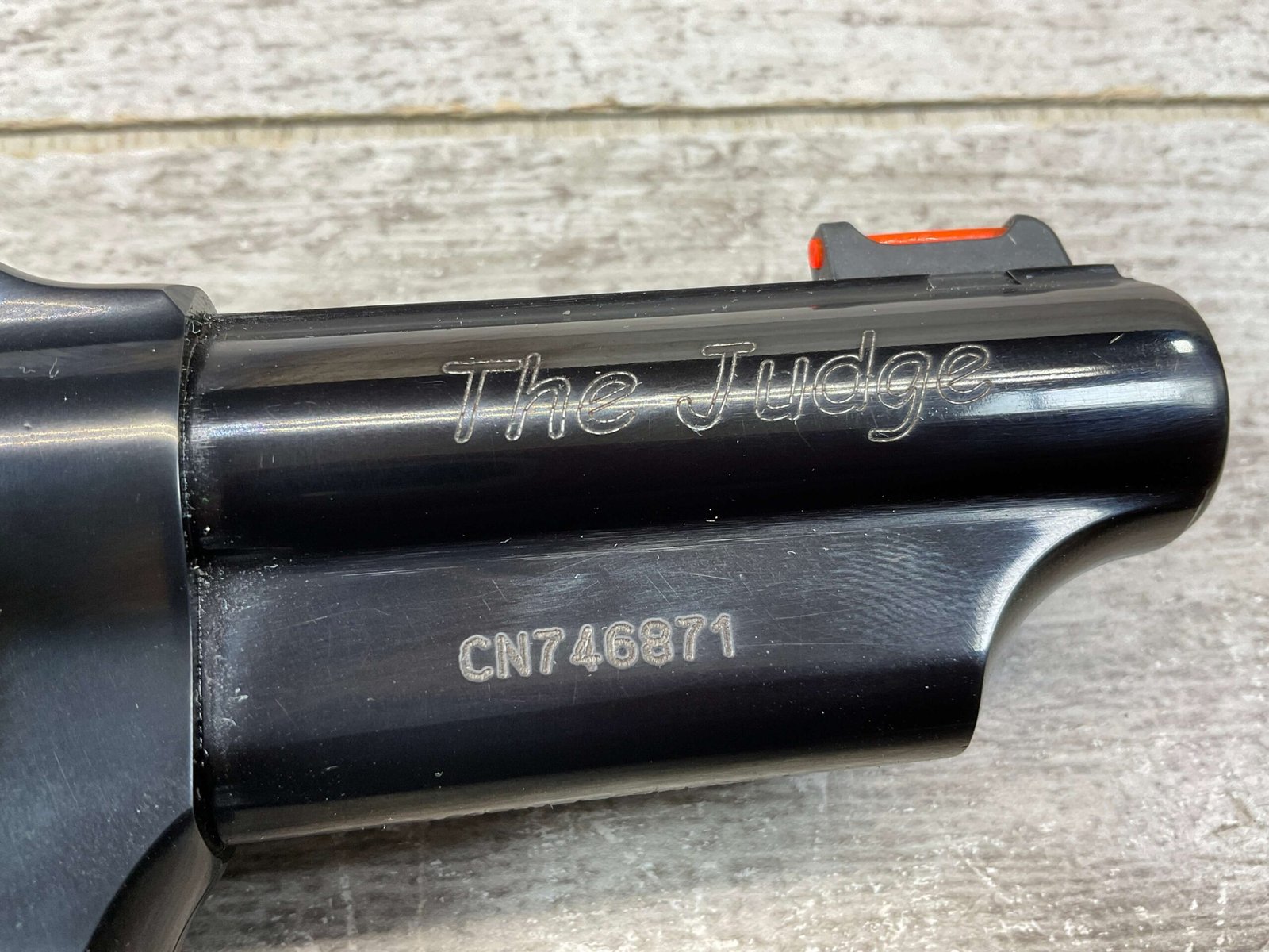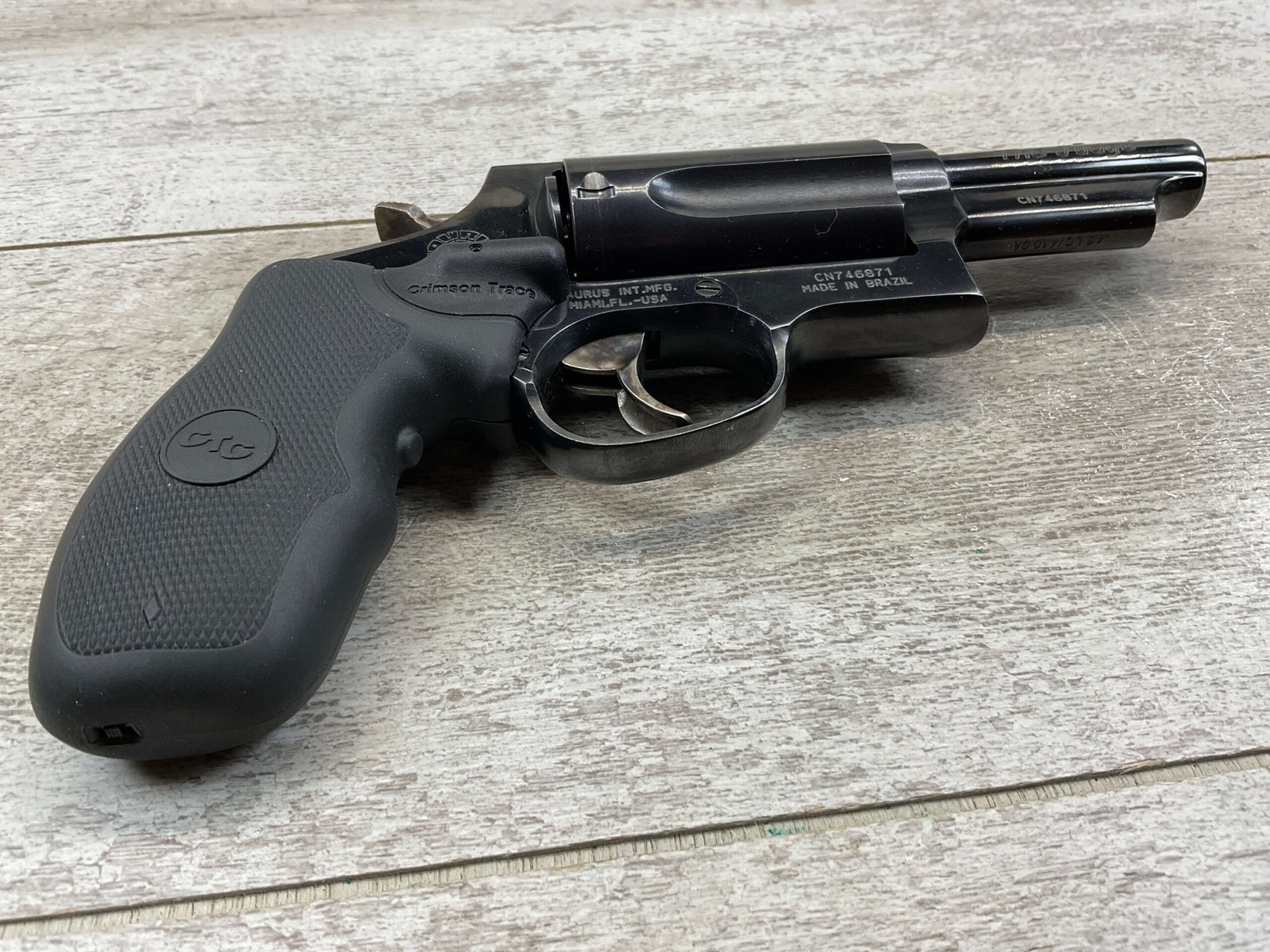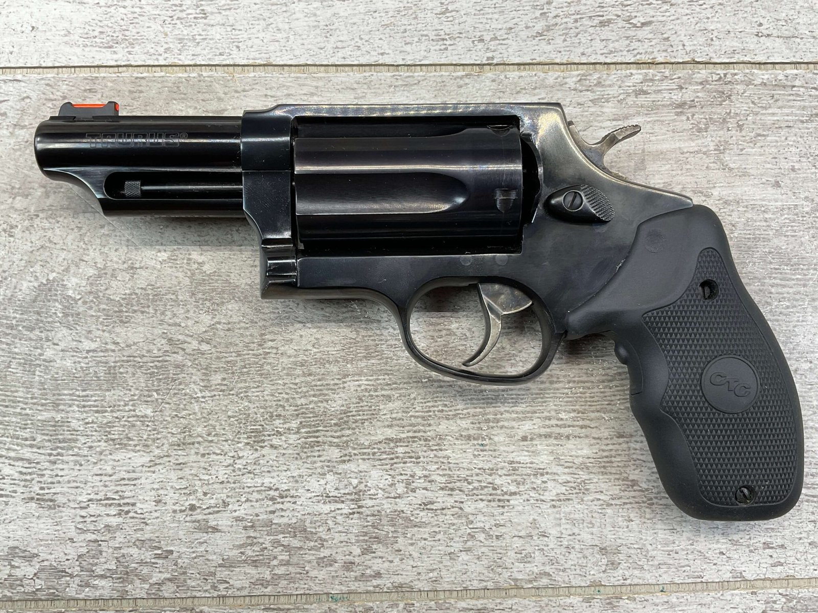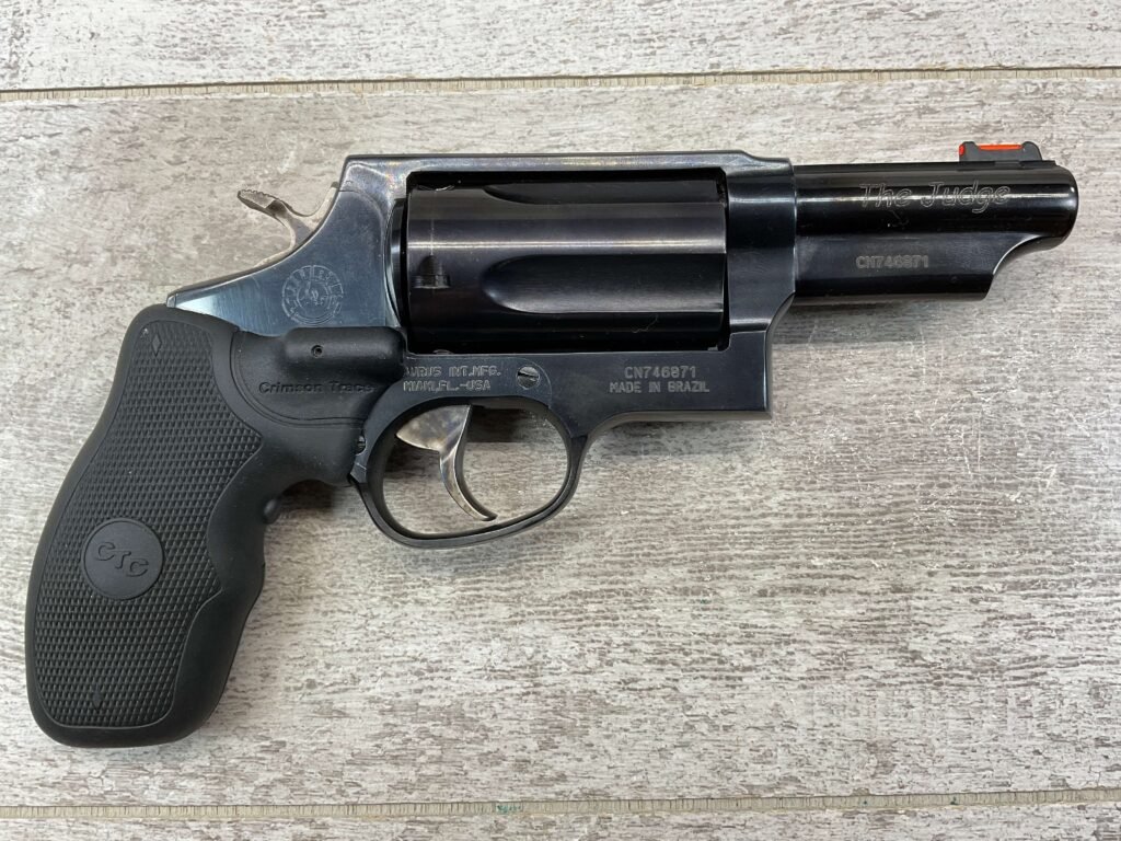 TAURUS “THE JUDGE” .45LC/410 SHOTSHELL 3″ BBL REVOLVER W/LASER GRIPS #CN746871, 5 SHOT,  EXC 99+%  BLUE, EXC CRIMSON TRACE RUBER LASER GRIPS WITH ON/OFF SWITCH ON THE HEEL, EXC BRIGHT BORE W/EXC RIFLING (10/10), COLOR CASE HARDENED HAMMER & TRIGGER, FIBER OPTIC FRONT SIGHT, 2010-12 MFR, COMPACT FRAME, AMAZING CONDITION ON THIS ONE!! 99+%