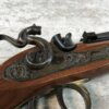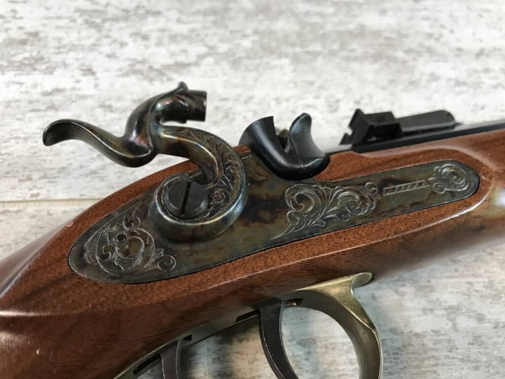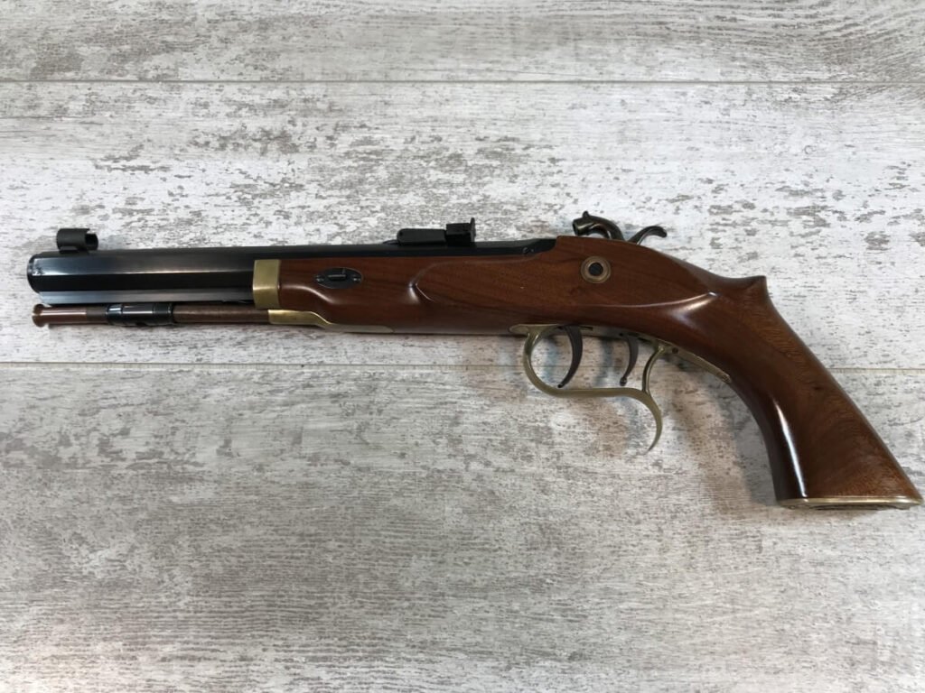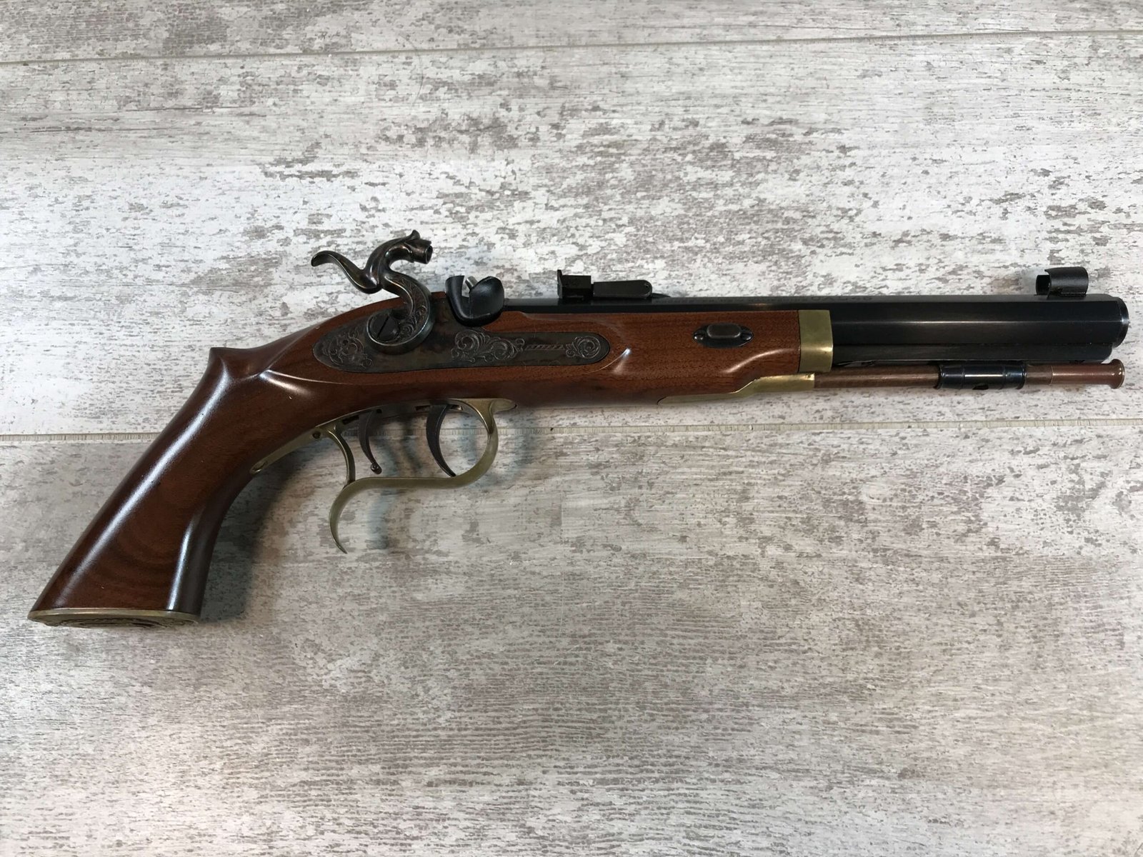 SKU#132 THOMPSON CENTER ARMS PATRIOT SINGLE SHOT .45CAL PISTOL #31653, EXCELLENT AMERICAN TIGER GRAIN WALNUT STOCK WITH BRASS TRIM, FIBERGLASS RAM ROD, 10″ BLUED OCTAGON BARREL, SET TRIGGER AND ADJ REAR SIGHT, HOODED FRONT SIGHT, 95% CONDITION