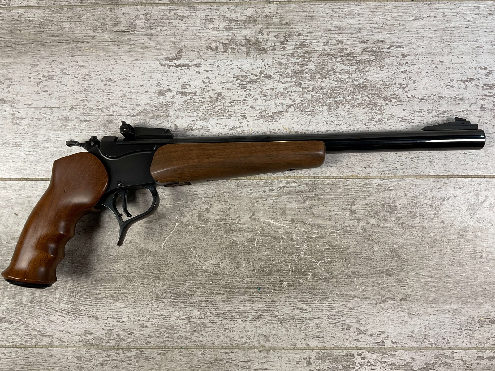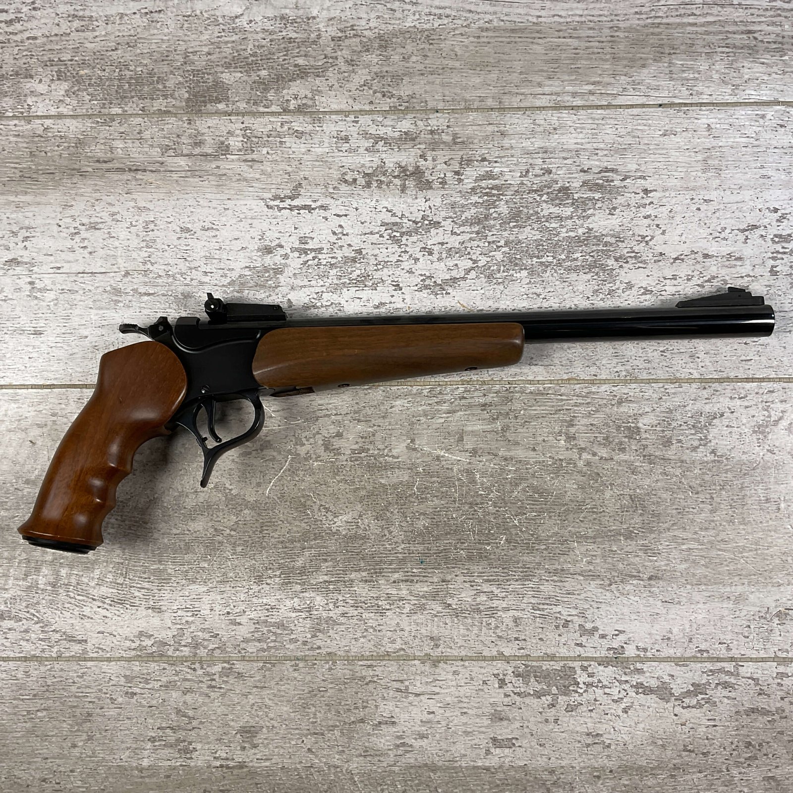THOMPSON CENTER ENCORE .219 ZIPPER SINGLE SHOT BREAK ACTION PISTOL #G5325, 14″ BARREL, TC SMOOTH WALNUT GRIP & FOREND STOCK, ADJ REAR SIGHT & BLADE FRONT, LIKE NEW, CONDITION SHOWN IN PICTURES, FROM THE JAMES EARL JONES “FAVORITES” COLLECTION W/ CERTIFICATE OF AUTHENTICITY.