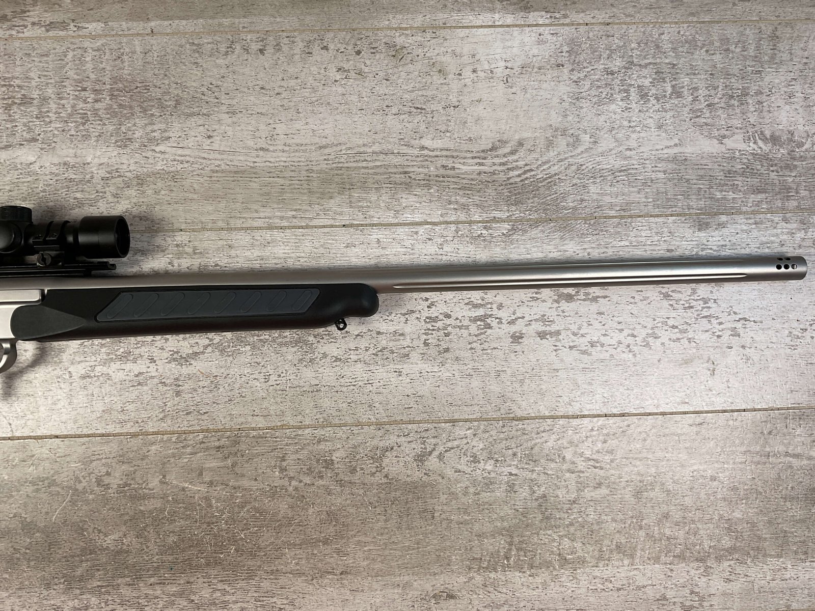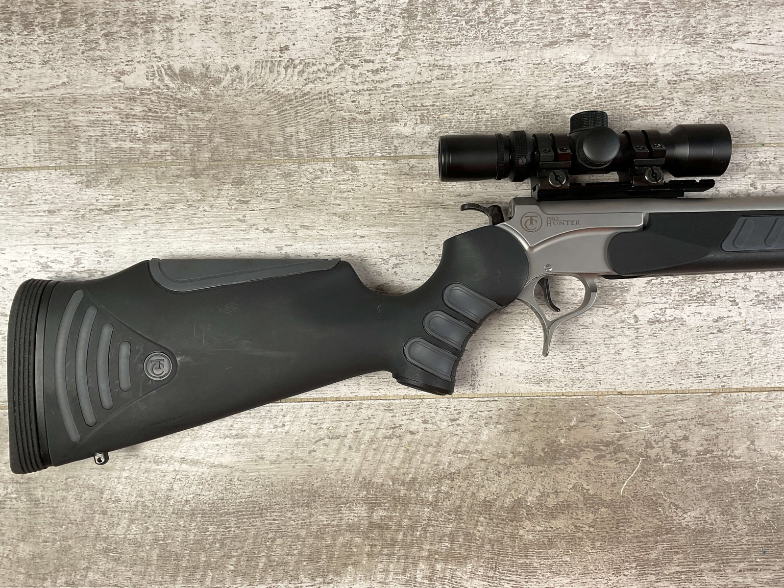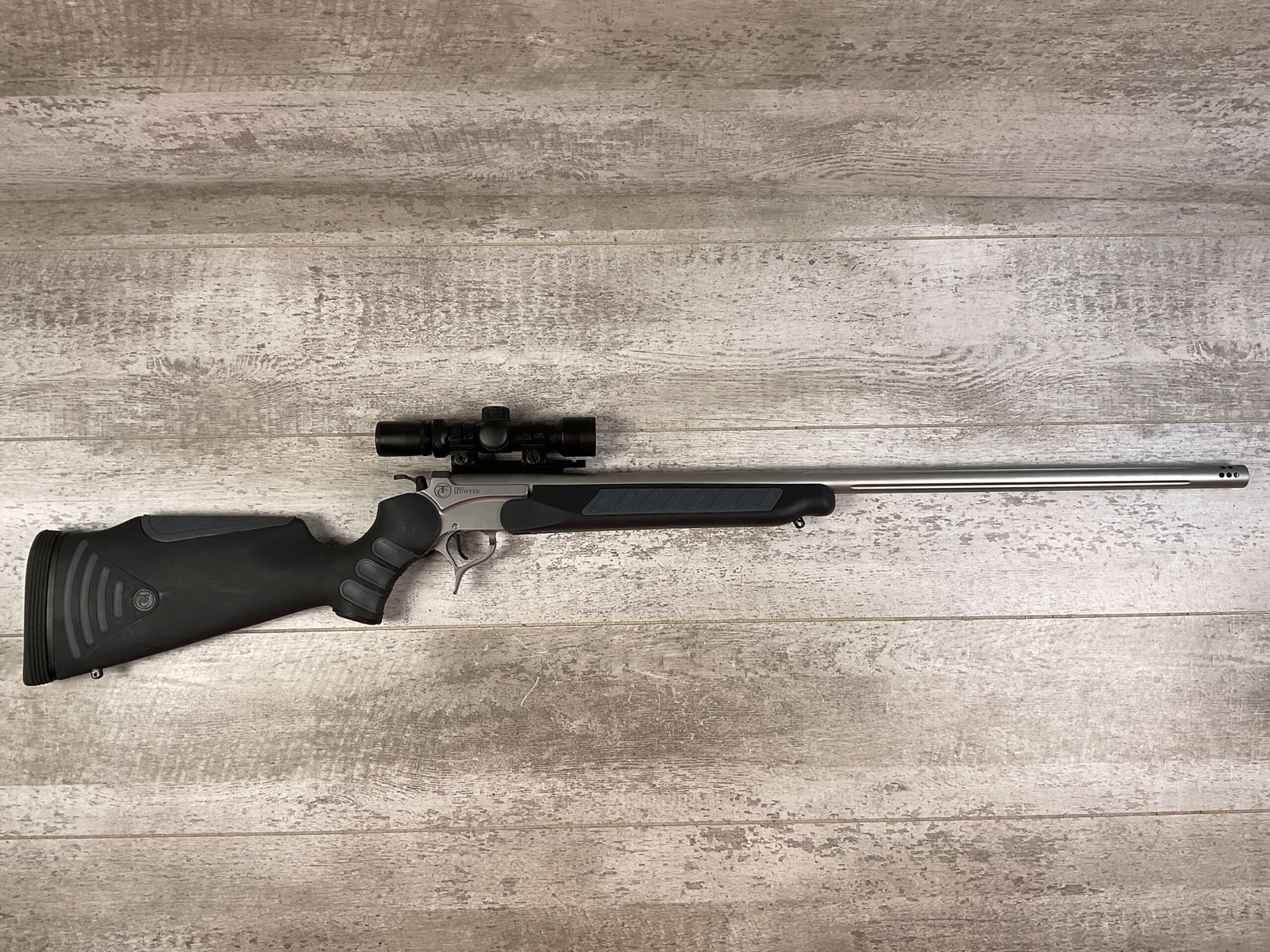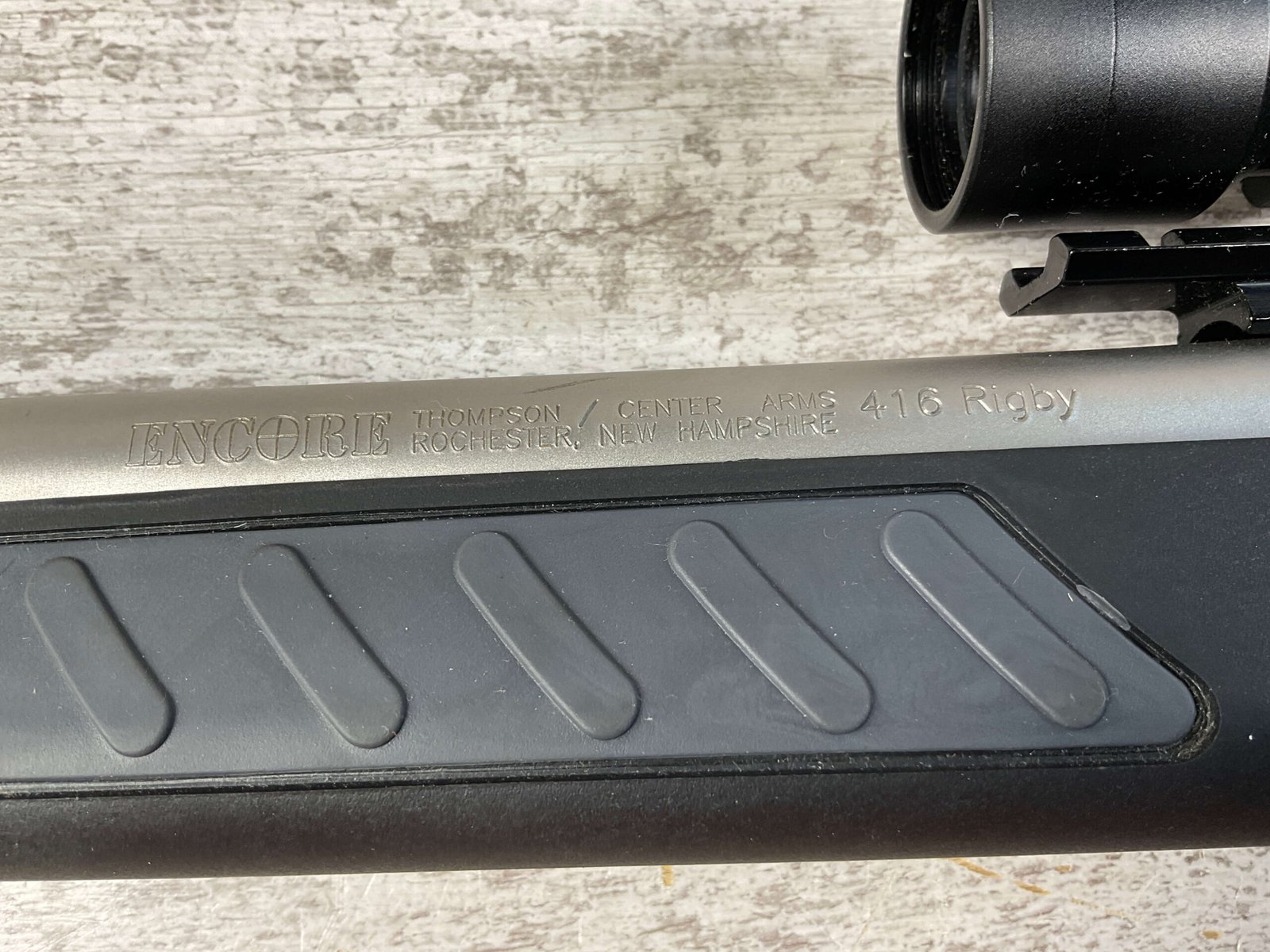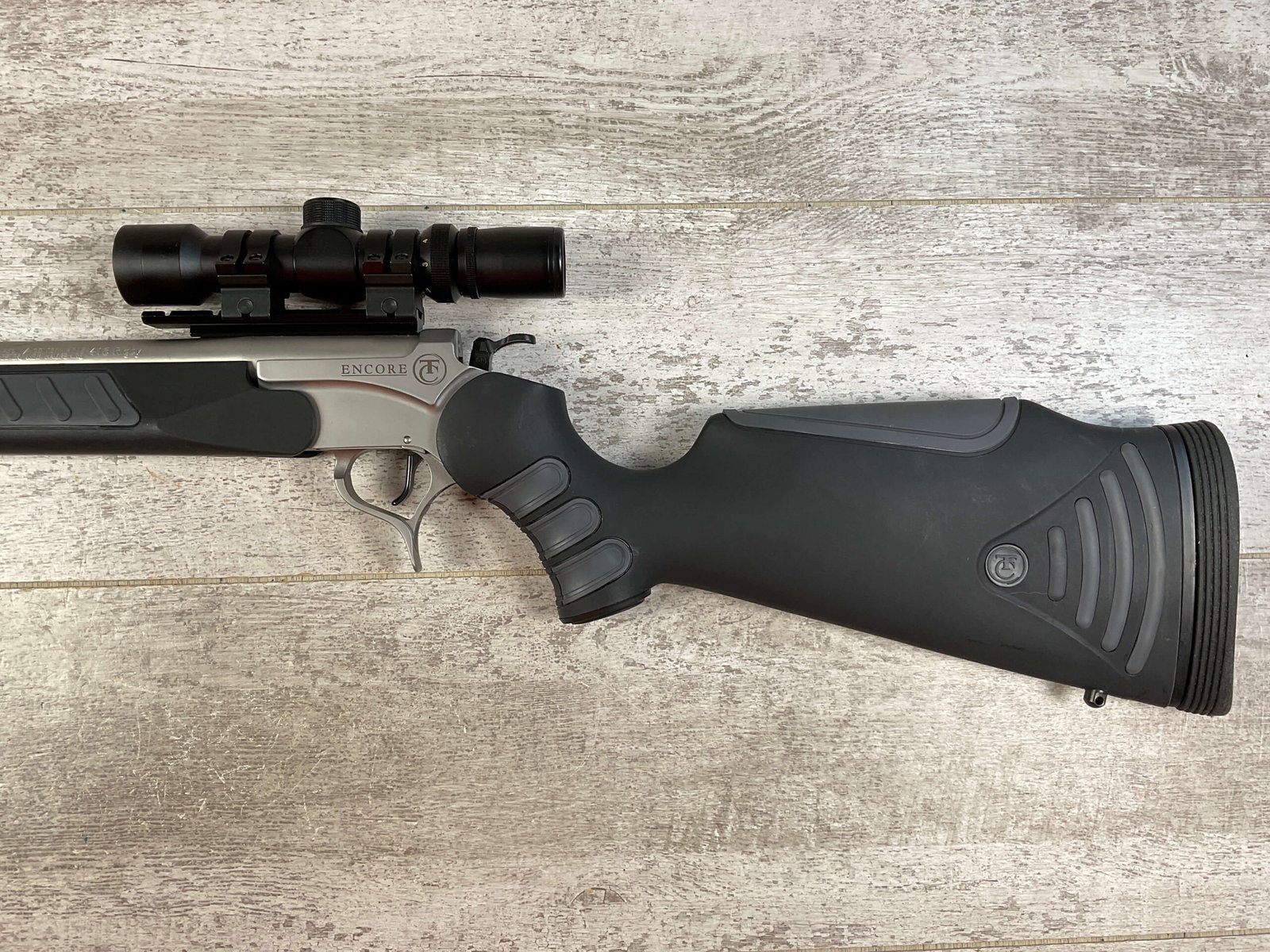 THOMPSON CENTER ENCORE 416 RIGBY SINGLE SHOT BREAK ACTION RIFLE #MAK7166, 28″ BARREL W/MUZZLE BREAK, NcSTAR 2-6X28 SCOPE, FLUTTED BARREL, ALL WEATHER STOCK W/ RUBBER BUTT PAD, LIKE NEW CONDITION SHOWN IN PICTURES FROM THE JAMES EARL JONES “FAVORITES” COLLECTION W/ CERTIFICATE OF AUTHENTICITY.