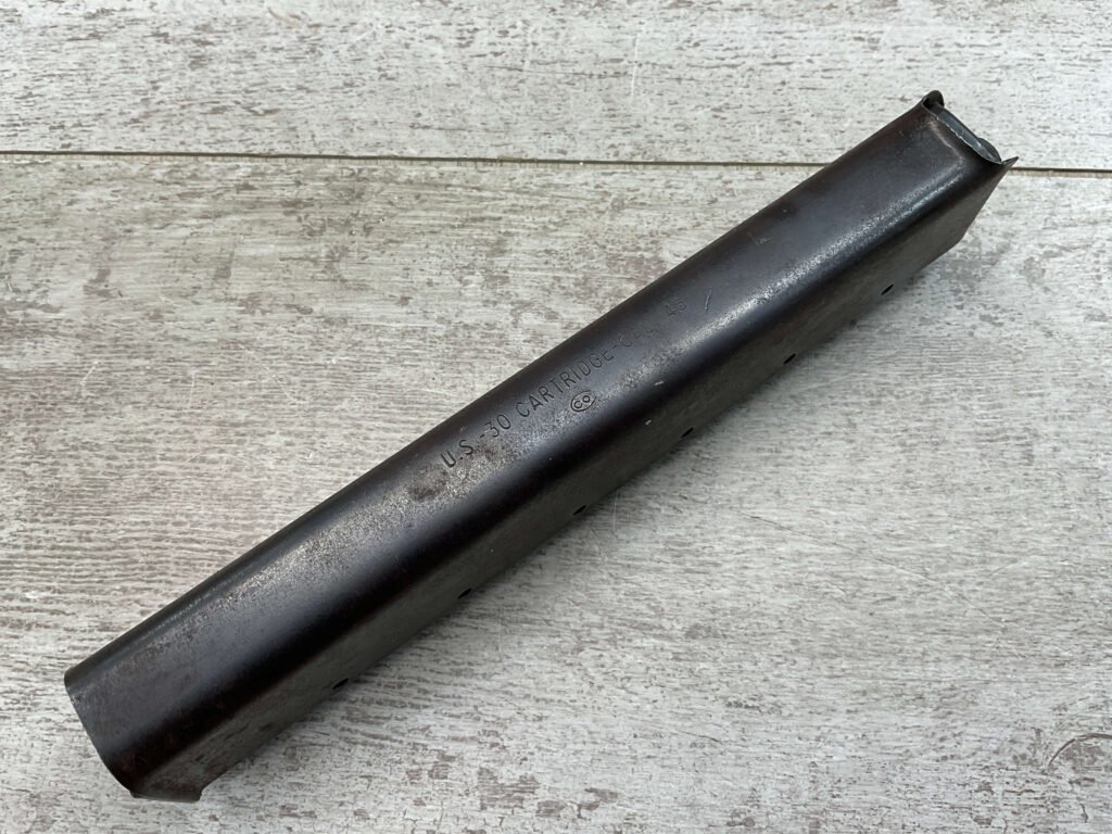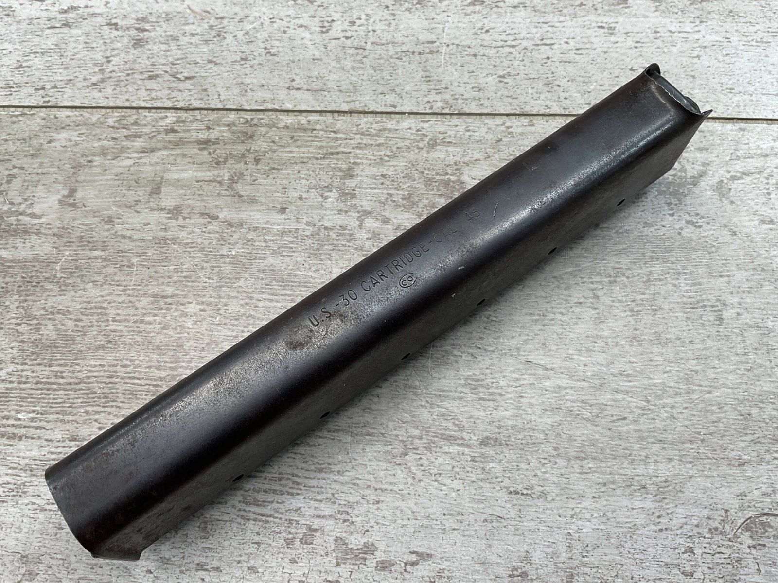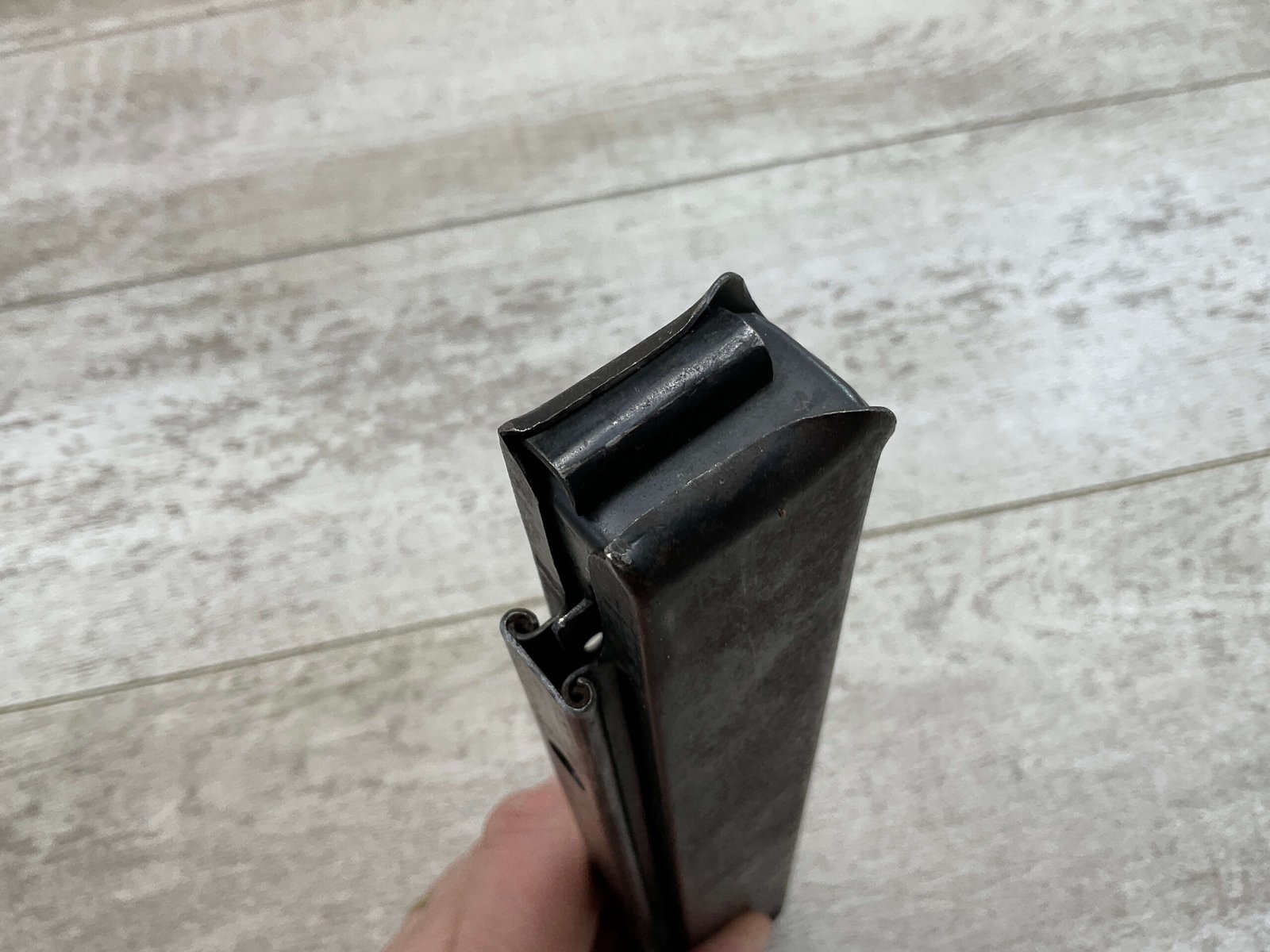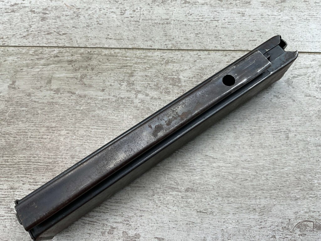 THOMPSON SMG 30 ROUND MAGAZINE .45ACP, COLT,  FAIR CONDITION, PITTING AND RUST PRESENT,  LIGHT SCRATCHES, BLUE FINISH  CAN BE MODIFIED TO WORK WITH MODERN SEMI-AUTO THOMPSONS