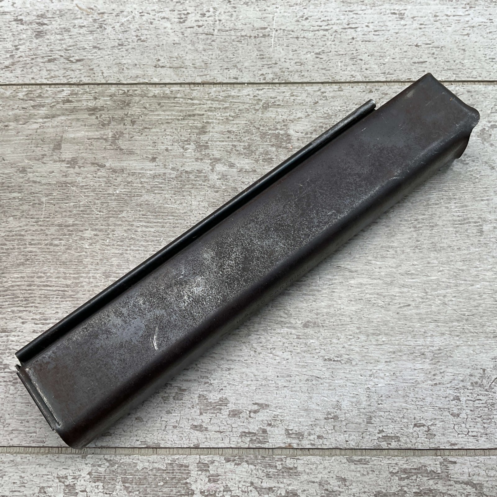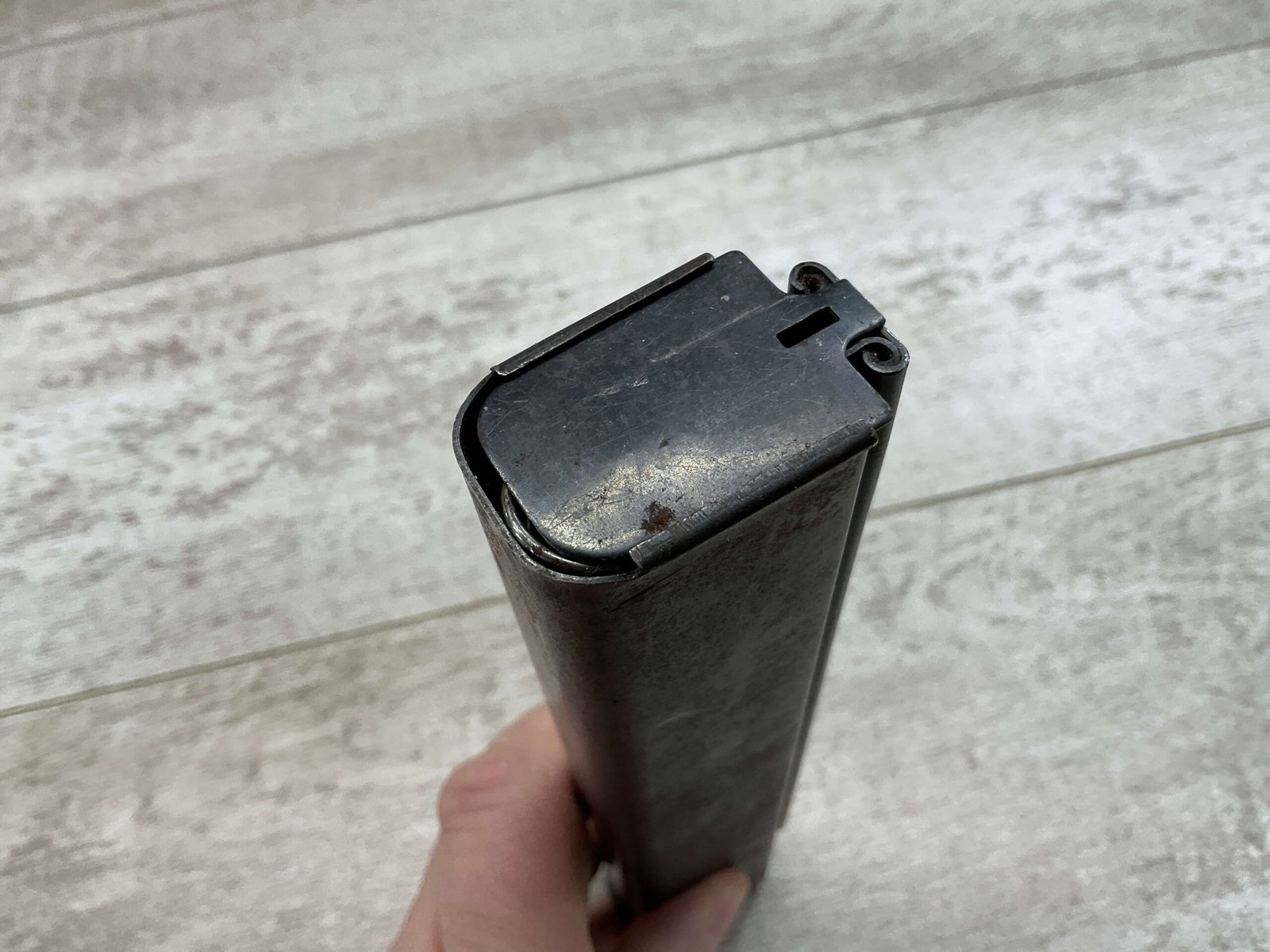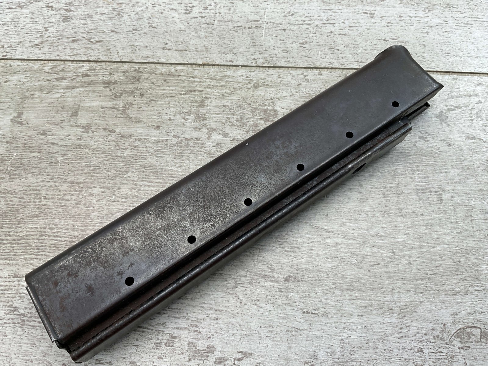 THOMPSON SMG 30 ROUND MAGAZINE .45ACP, COLT,  FAIR CONDITION, PITTING AND RUST PRESENT,  LIGHT SCRATCHES, BLUE FINISH  CAN BE MODIFIED TO WORK WITH MODERN SEMI-AUTO THOMPSONS
