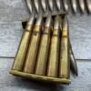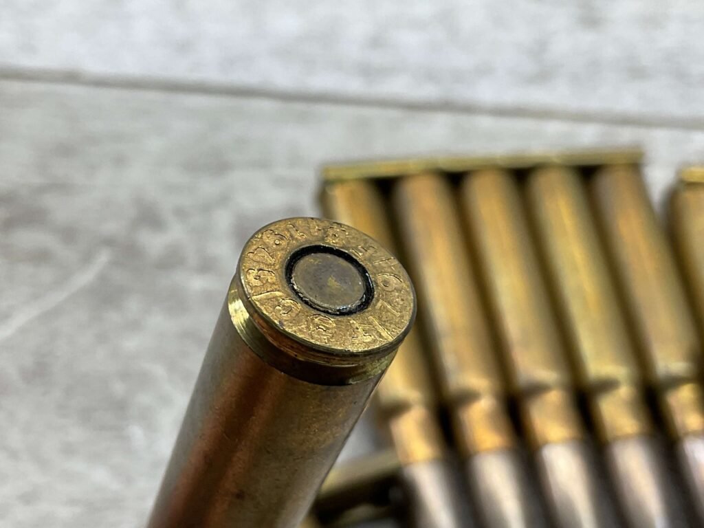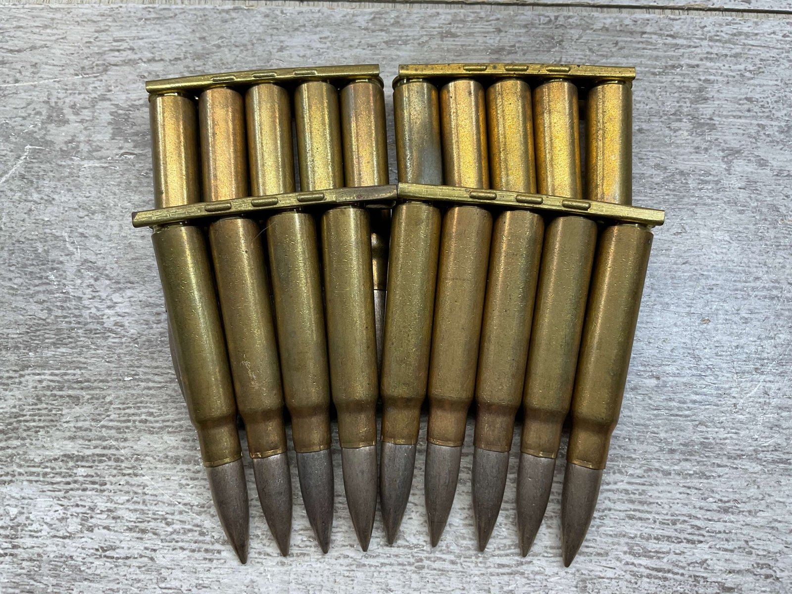 TURKISH 1945 8MM MAUSER (7.92X57) AMMO, QTY 19, VINTAGE, ON STRIPPER CLIP, HEADSTAMP “T (ISLAMIC CRESCENT MOON W/ STAR SYMBOL) C | 1945 | FS | 7.9”.