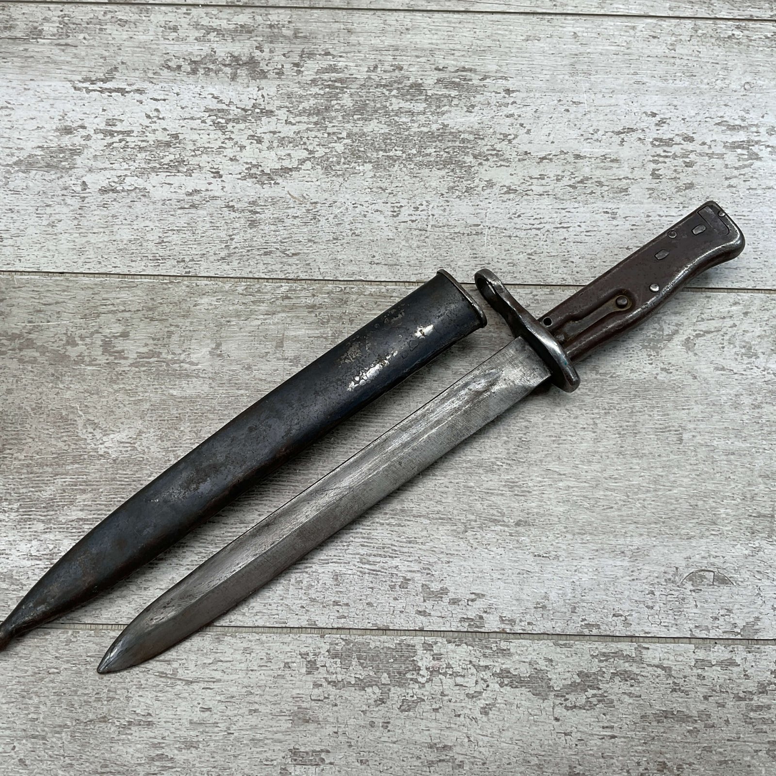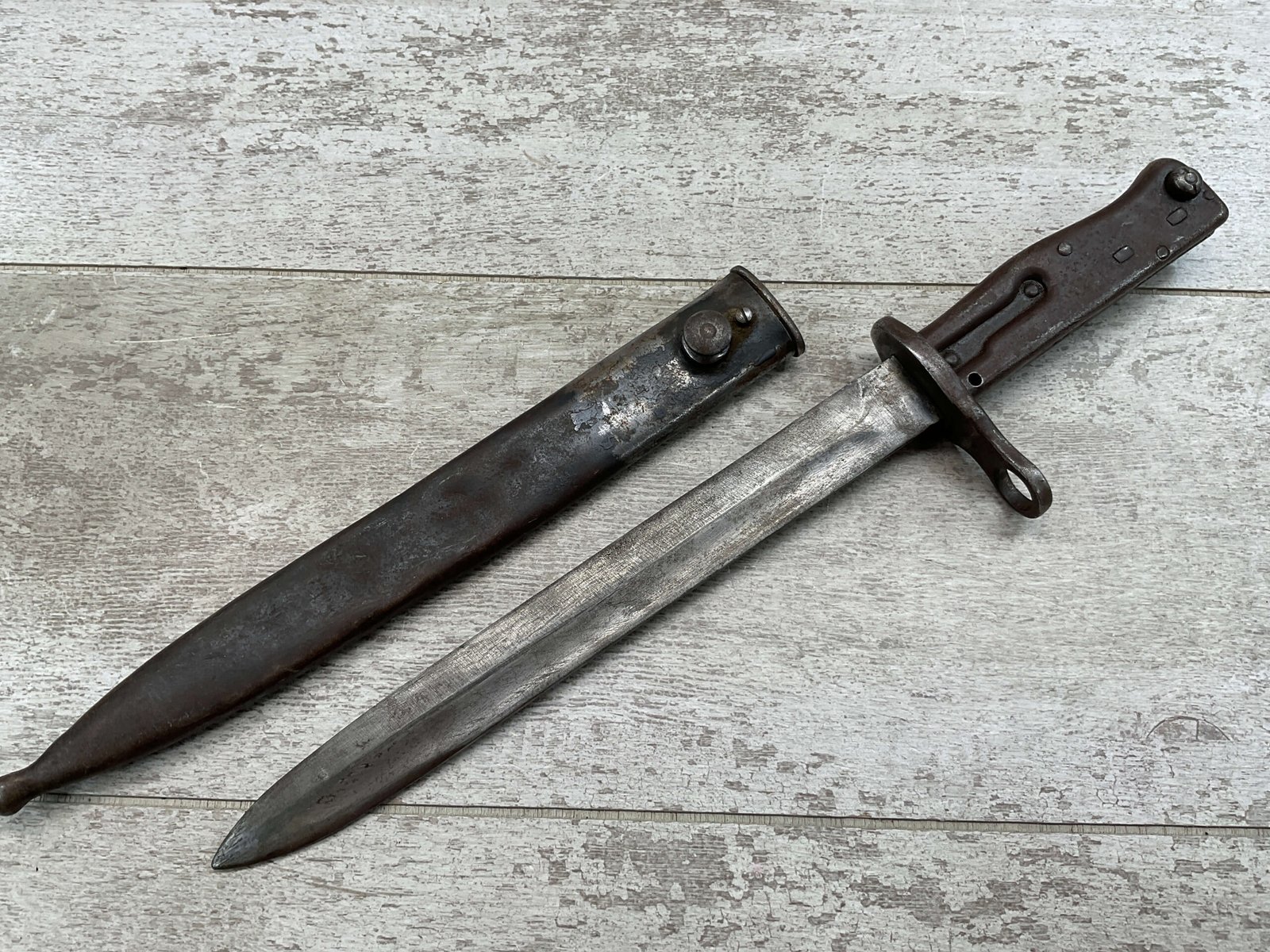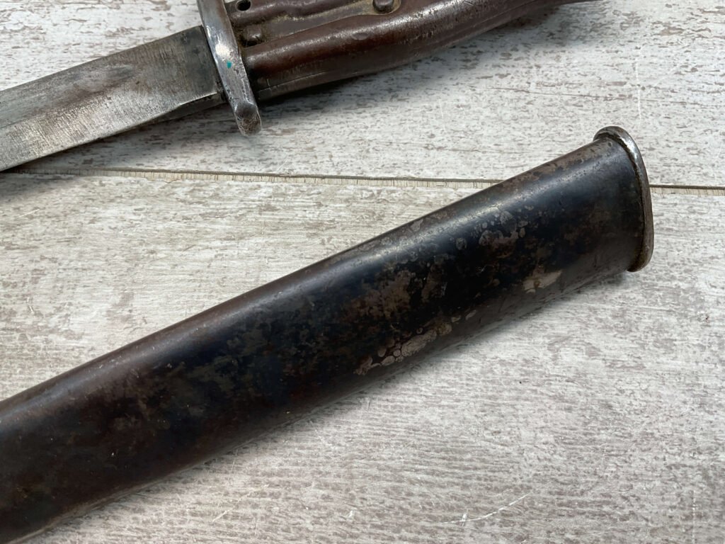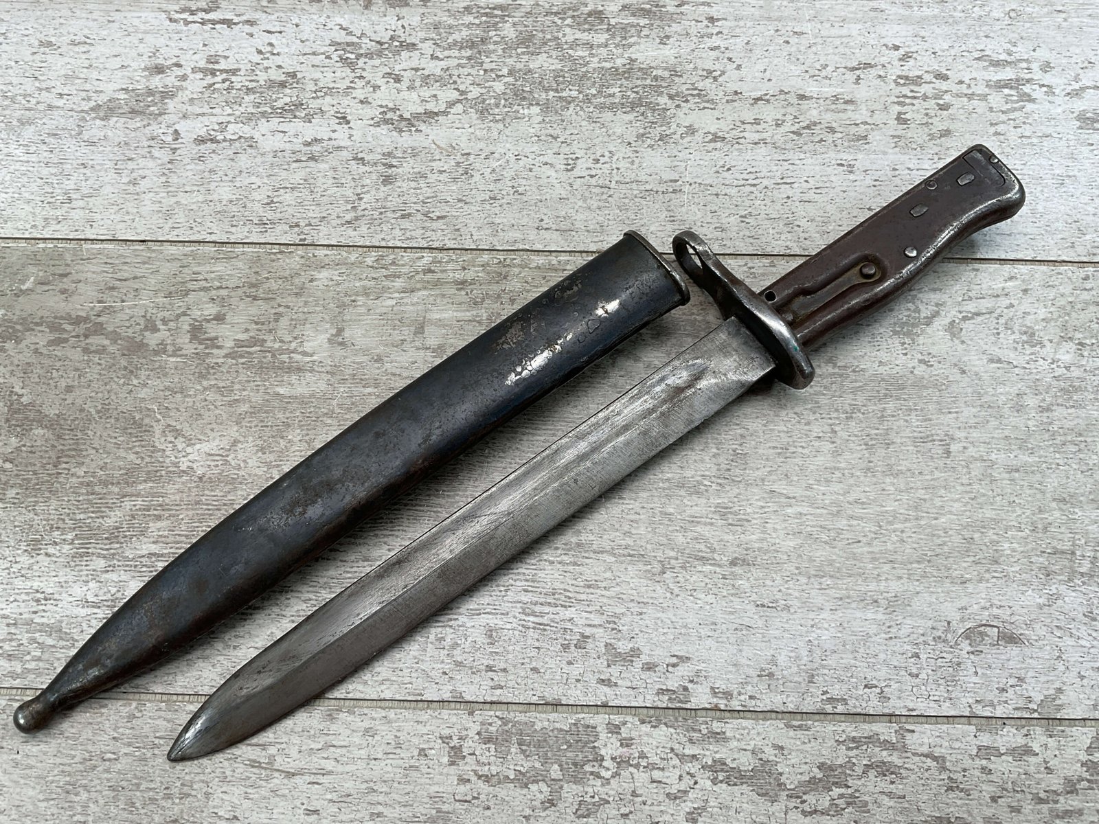 WWI GERMAN MADE ERSATZ OR SUBSTITUTE BAYONET WITH SCABBARD. BLADE LENGTH IS 10 INCHES, OVERALL LENGTH 15 INCHES, STAMPED 69751 ON THE GRIP. OVER TIME THESE INTERIM BAYONETS WERE REPLACED BY REGULATION PIECES AND MANY WERE GIVEN TO THE TURKISH ARMY. MANY BLADES SHORTENED TO 10-INCHES BY THE TURKS AND 10-INCH BLADES CAN BE PRESUMED TO HAVE BEEN IN TURKISH HANDS.