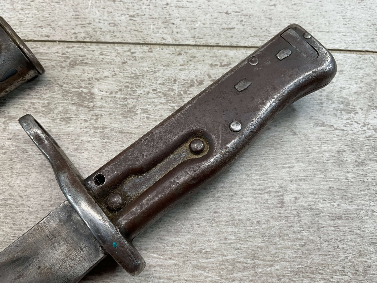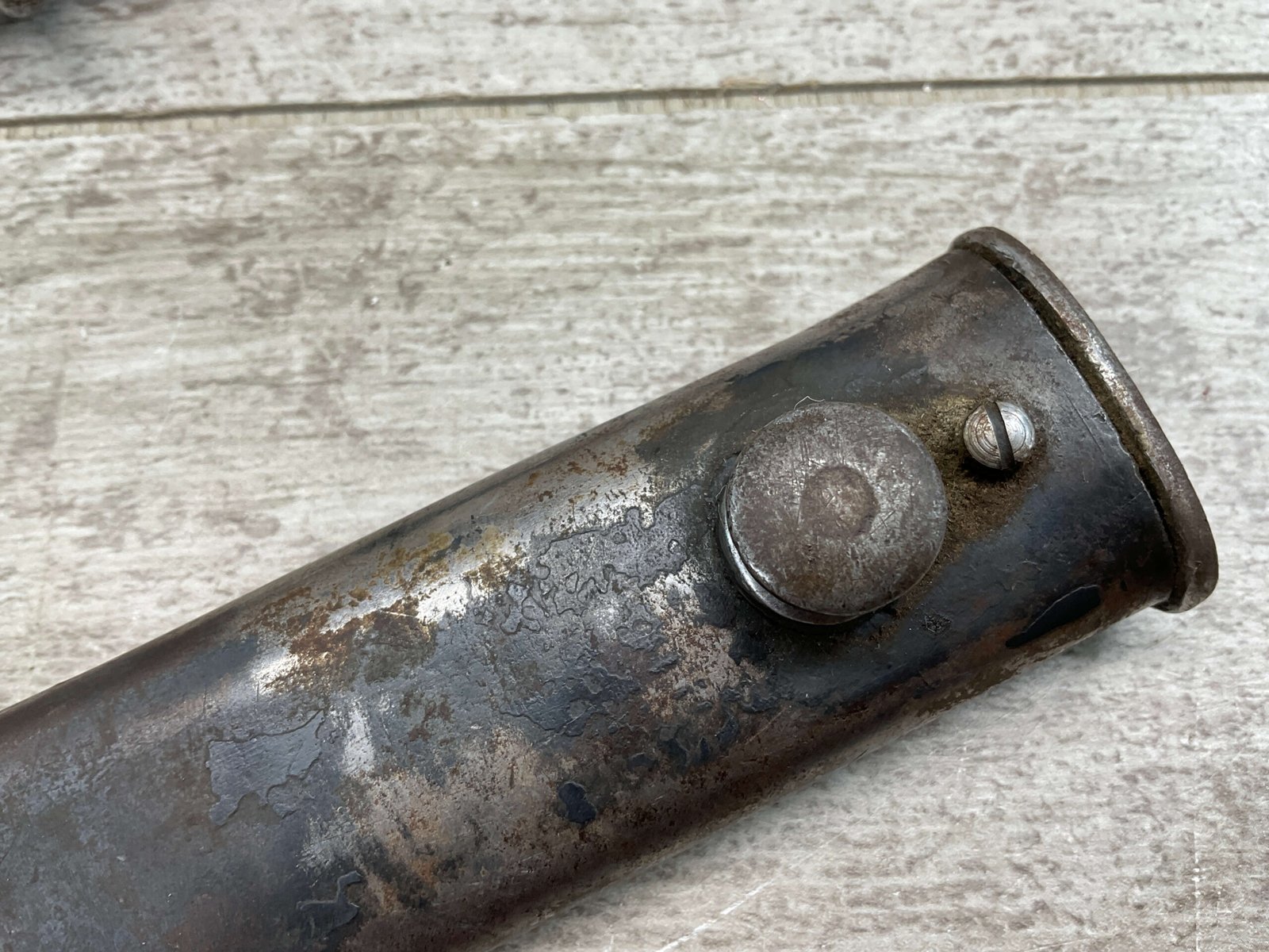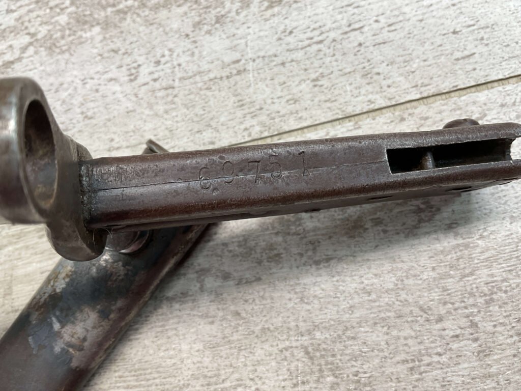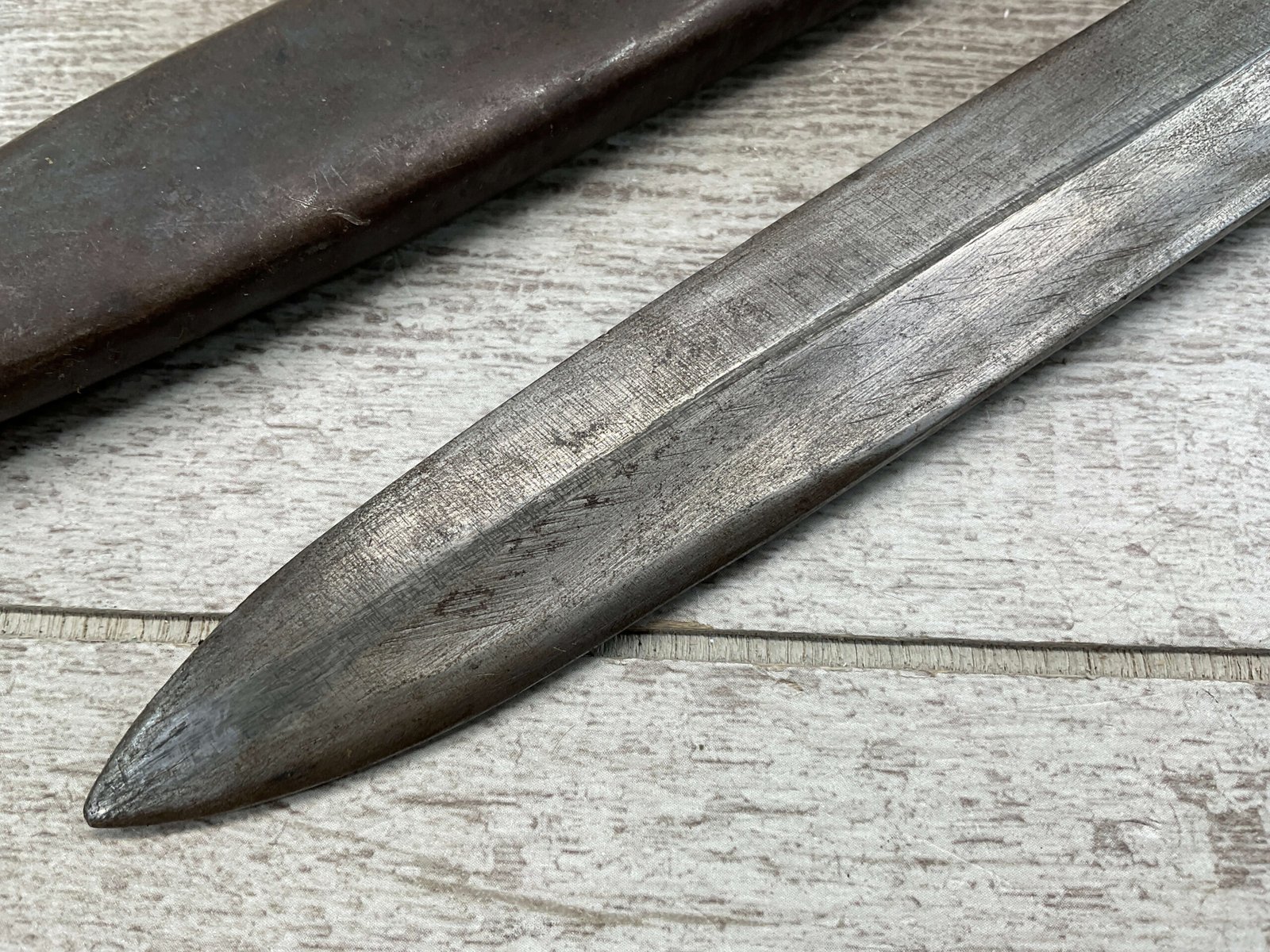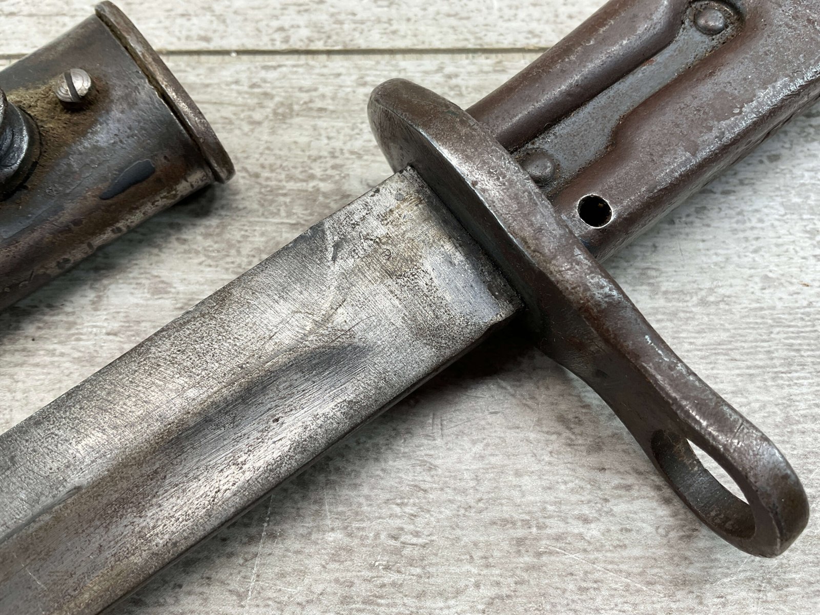 WWI GERMAN MADE ERSATZ OR SUBSTITUTE BAYONET WITH SCABBARD. BLADE LENGTH IS 10 INCHES, OVERALL LENGTH 15 INCHES, STAMPED 69751 ON THE GRIP. OVER TIME THESE INTERIM BAYONETS WERE REPLACED BY REGULATION PIECES AND MANY WERE GIVEN TO THE TURKISH ARMY. MANY BLADES SHORTENED TO 10-INCHES BY THE TURKS AND 10-INCH BLADES CAN BE PRESUMED TO HAVE BEEN IN TURKISH HANDS.