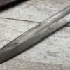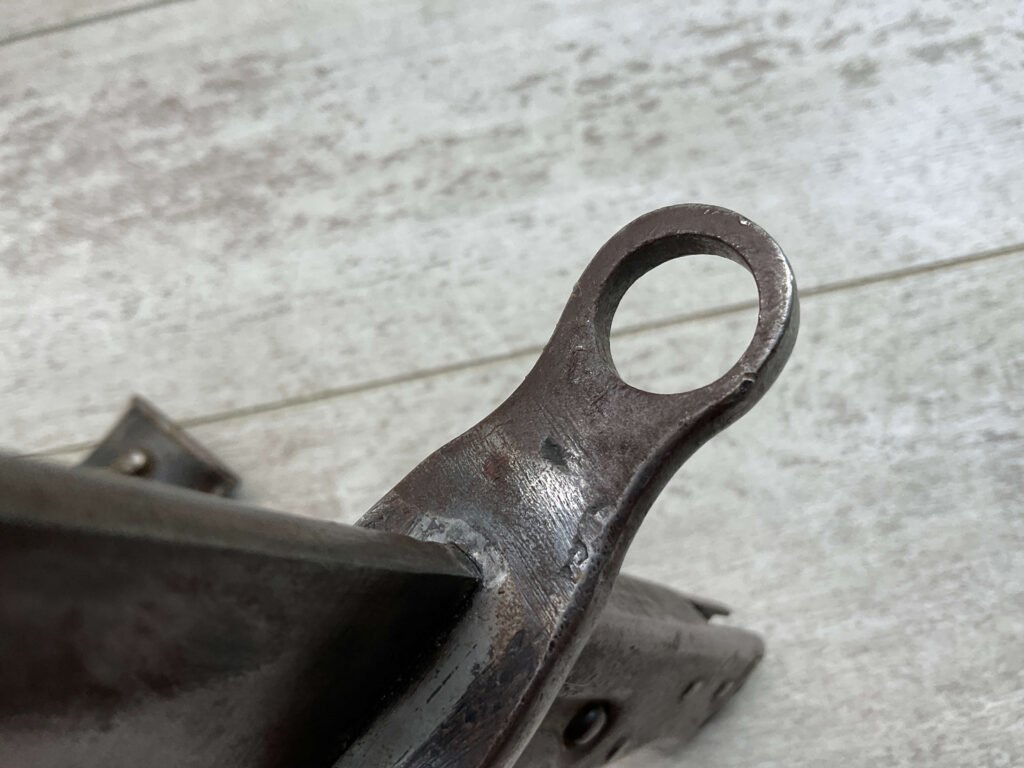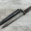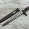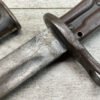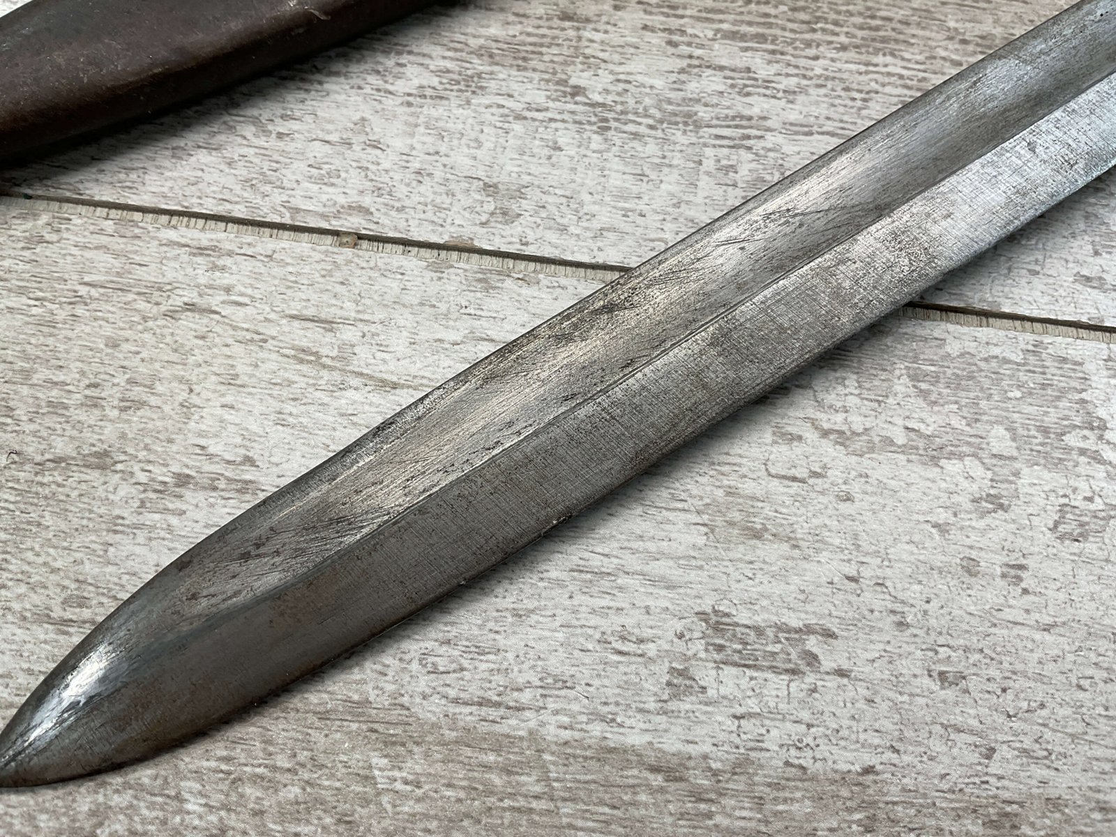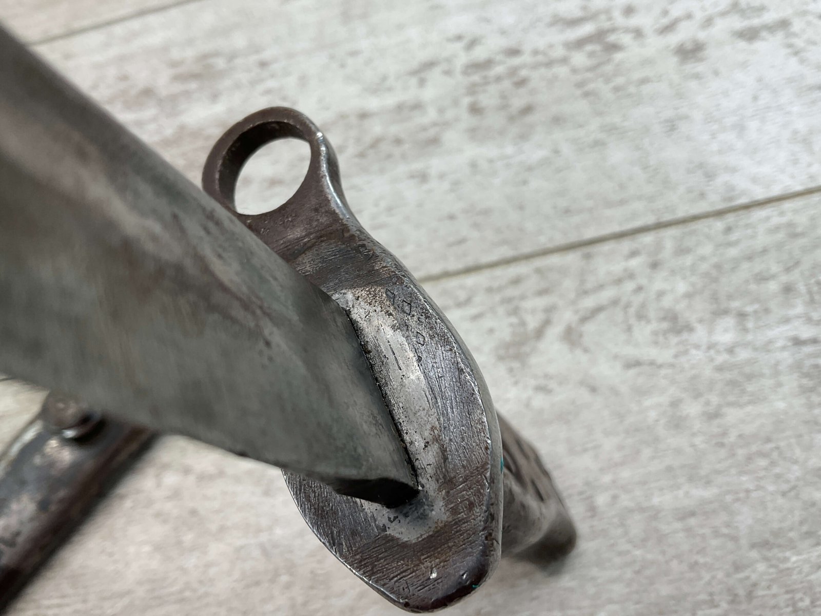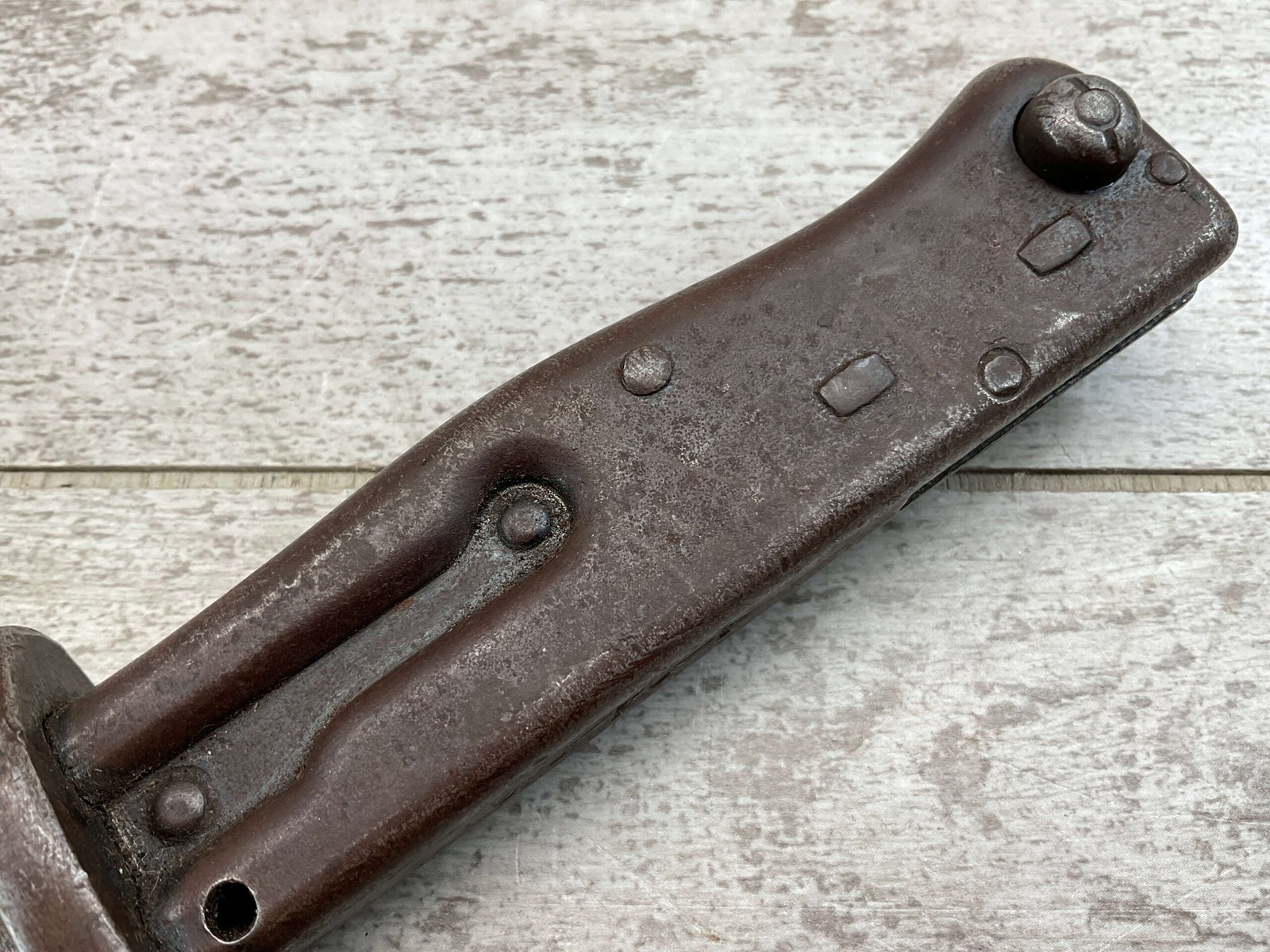 WWI GERMAN MADE ERSATZ OR SUBSTITUTE BAYONET WITH SCABBARD. BLADE LENGTH IS 10 INCHES, OVERALL LENGTH 15 INCHES, STAMPED 69751 ON THE GRIP. OVER TIME THESE INTERIM BAYONETS WERE REPLACED BY REGULATION PIECES AND MANY WERE GIVEN TO THE TURKISH ARMY. MANY BLADES SHORTENED TO 10-INCHES BY THE TURKS AND 10-INCH BLADES CAN BE PRESUMED TO HAVE BEEN IN TURKISH HANDS.