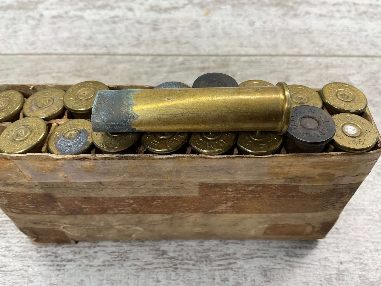 U.M.C. 45-70, 18 EMPTY, 2 FULL, VINTAGE AMMO, BOX IN POOR CONDITION, NO COVERING