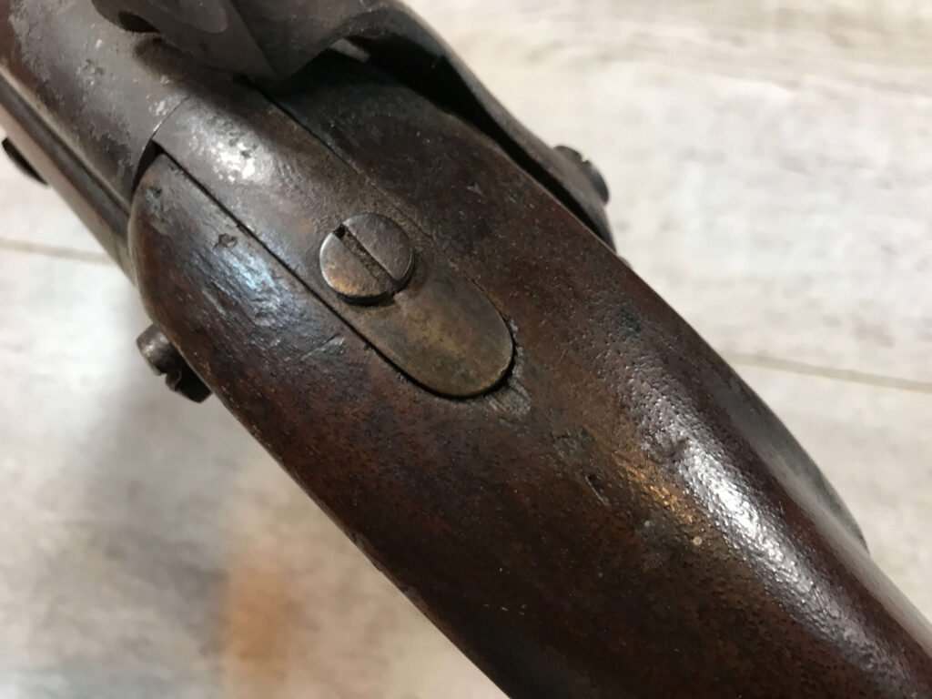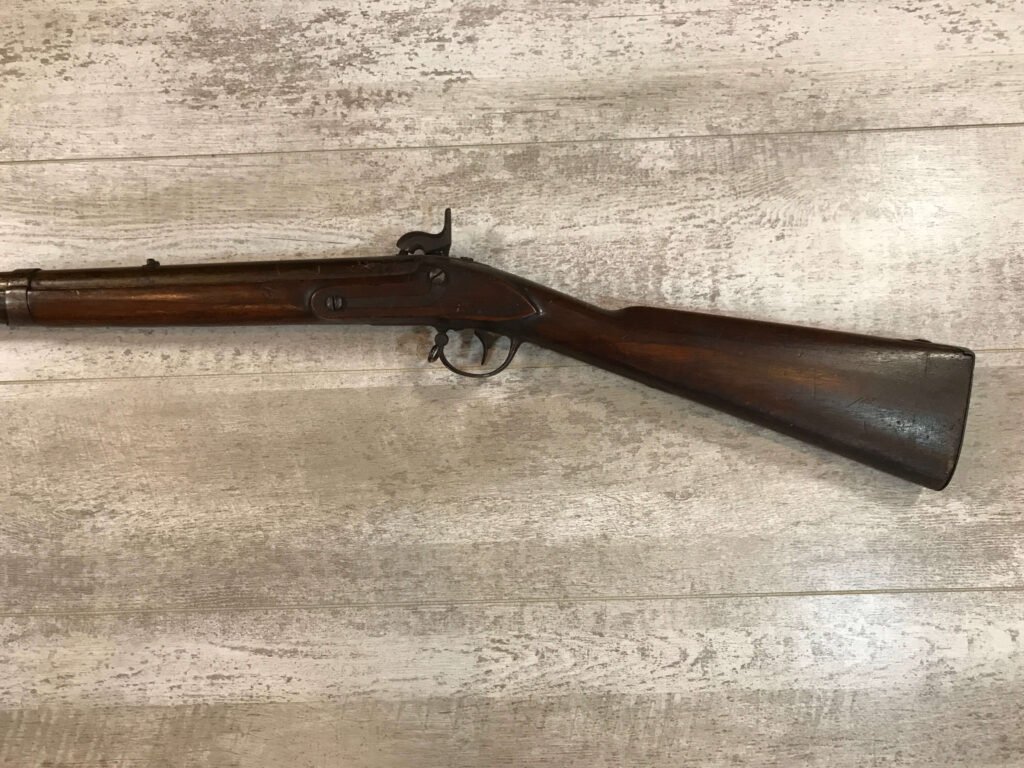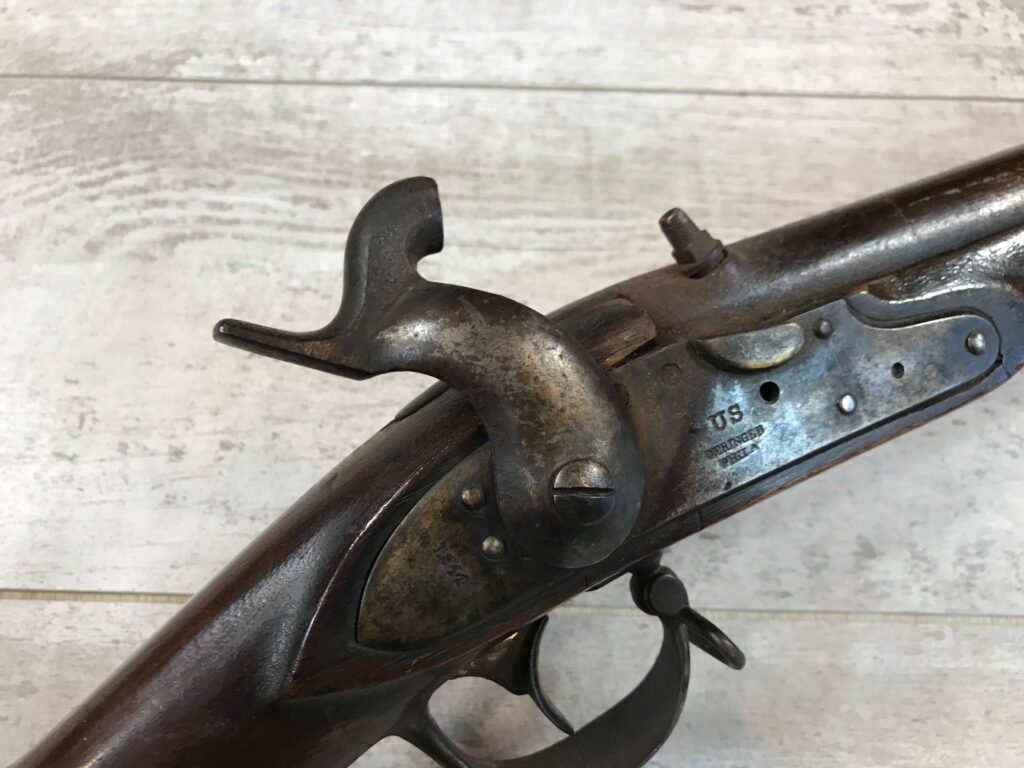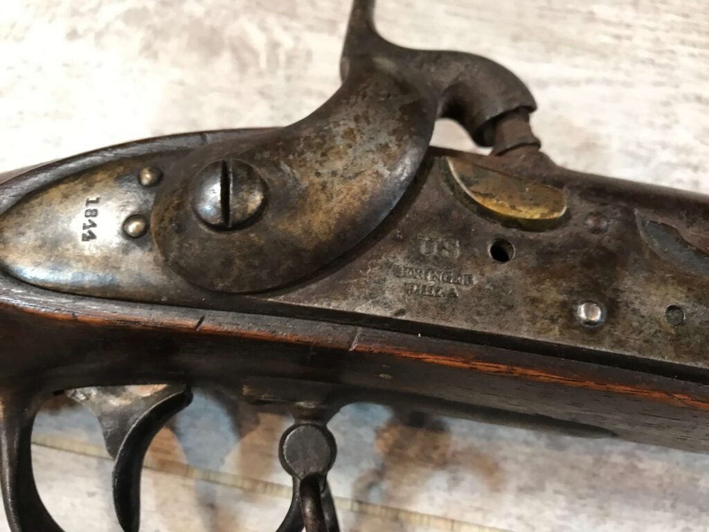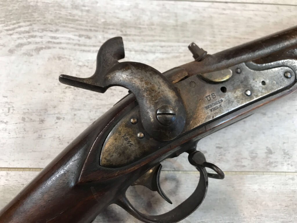 SKU#396 U.S. DERINGER 1817 MUSKET MFR 1844, LOCK AND TANG DATE 1844, KNOWN AS THE “COMMON RIFLE”, HINGED PATCHBOX COVER, 53 CAL, 36″ BBL, PERCUSSION, WALNUT STOCK, NICK/DIGNS AND BRUISING, ORIG. RAMROD, MEXICAN AMERICAN WAR AND EARLY CIVIL WAR RELIC!