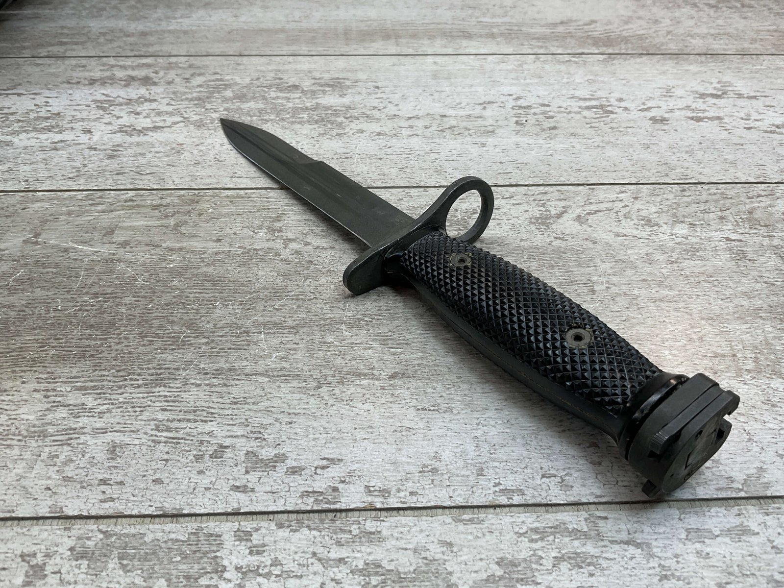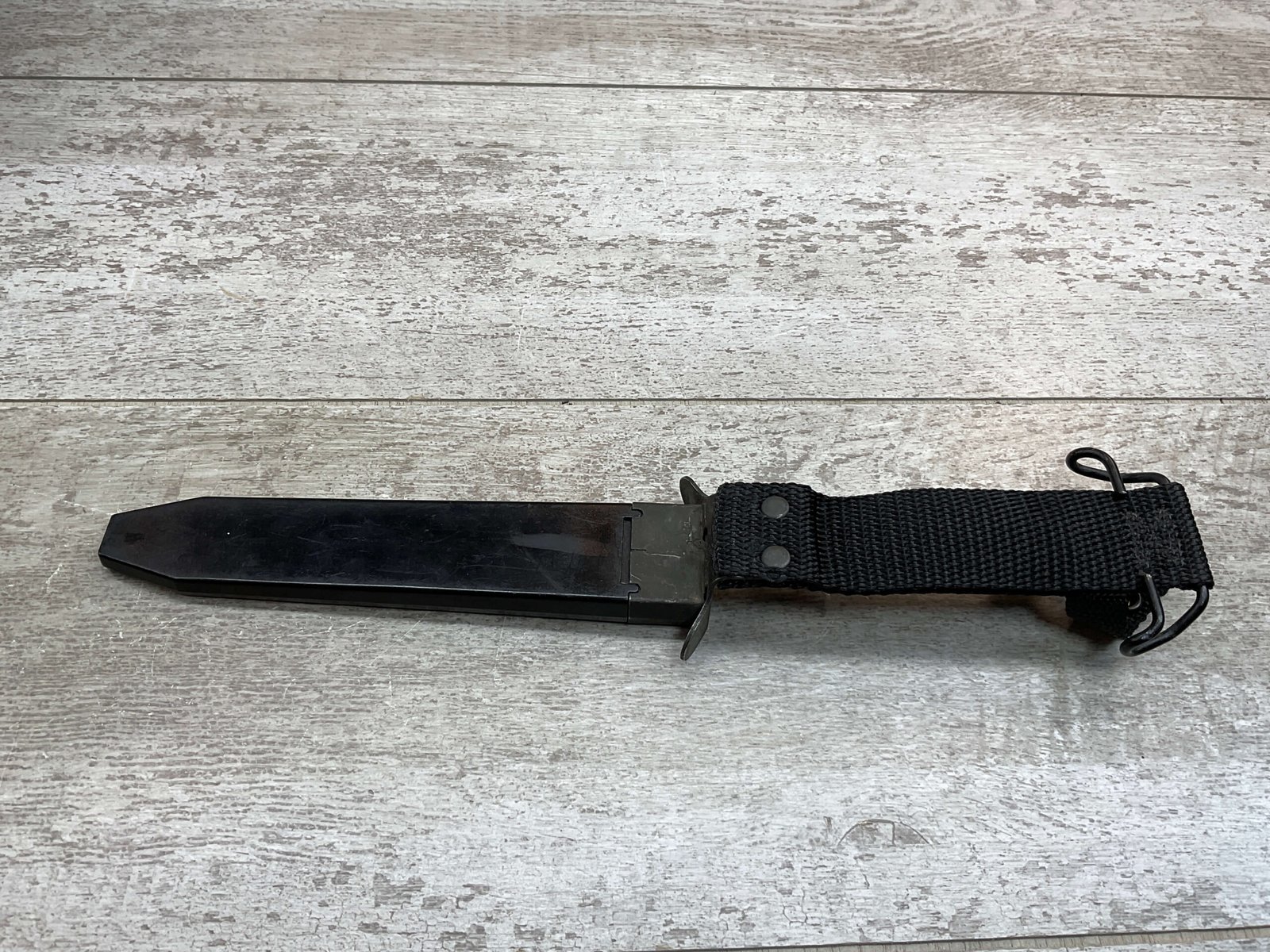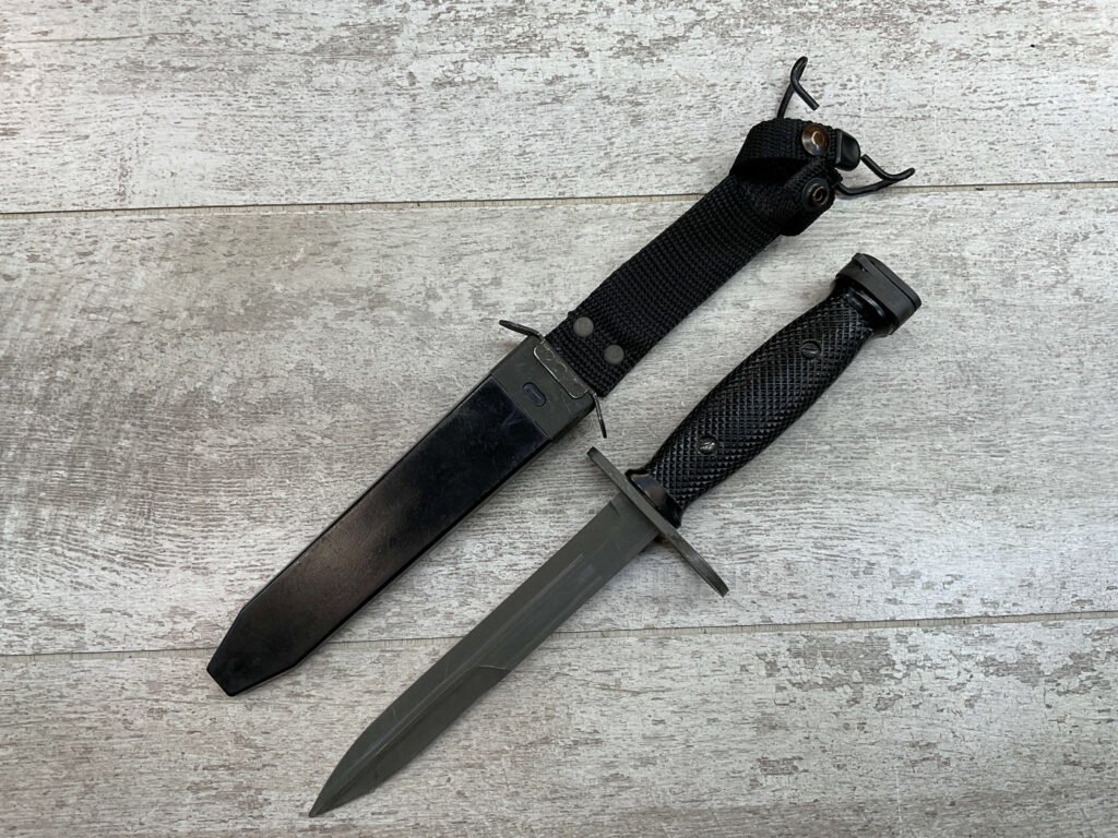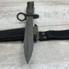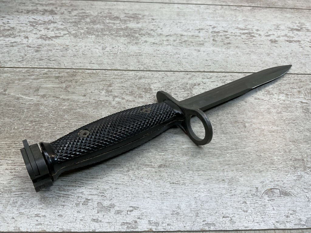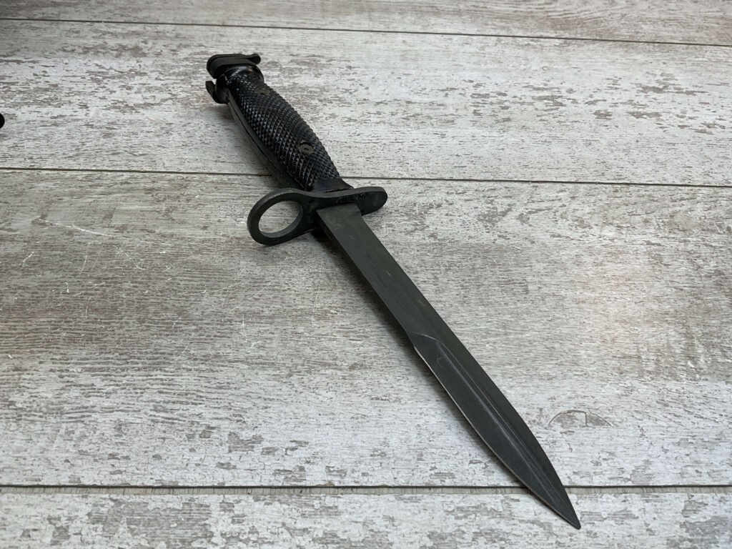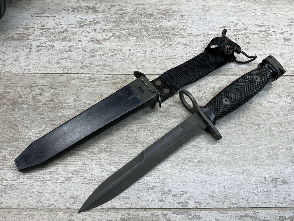U.S. M7 BAYONET VIETNAM ERA BAYONET W/ SCABBARD, BAYONET MARKED “M7 ONTARIO”, BLACK CHECKERED HANDLE, BLACK PLASTIC SCABBARD W/ NO MARKINGS, BLADE IS SHARP W/ NO EVIDENCE OF USE, EXC OVERALL CONDITION