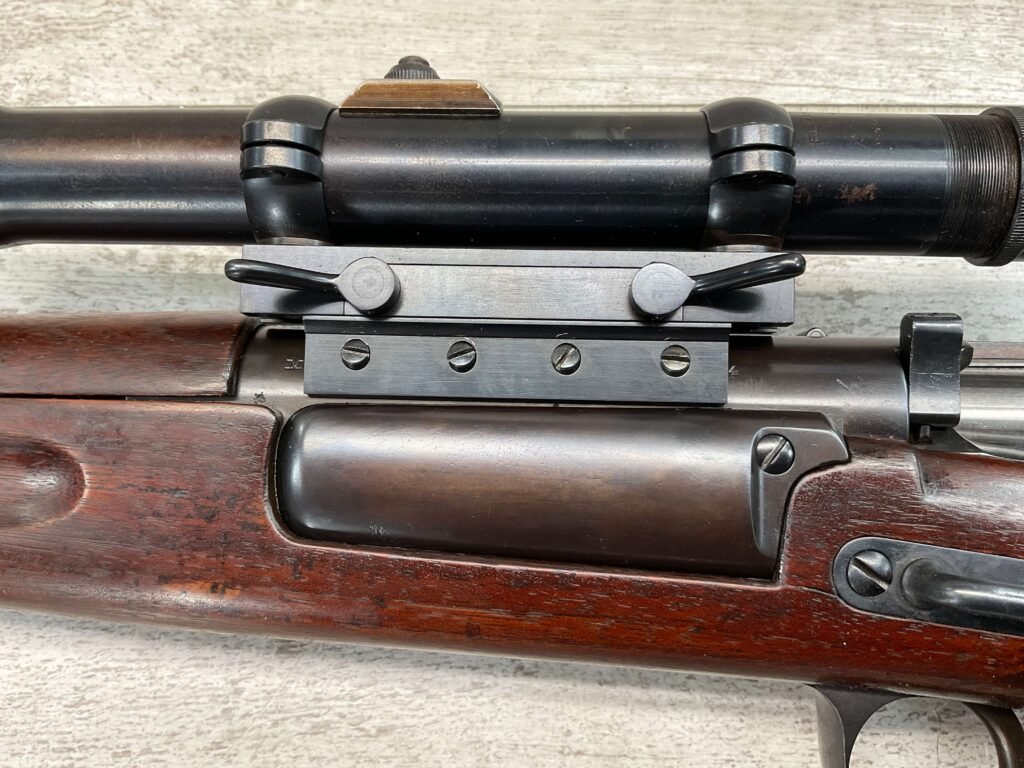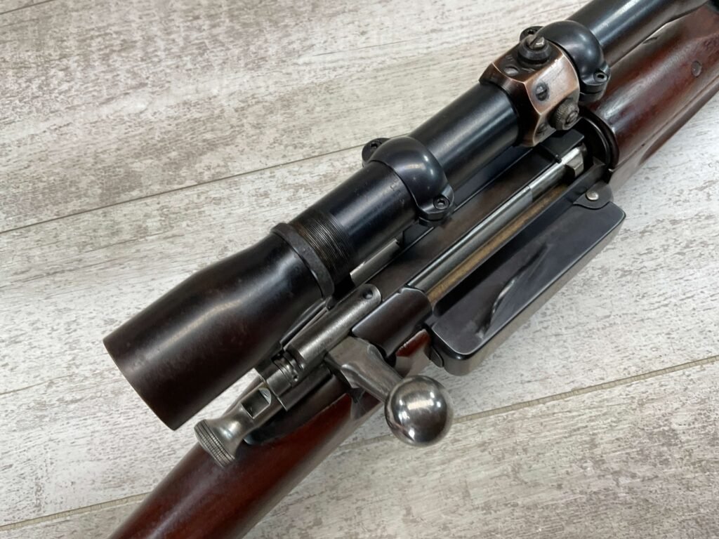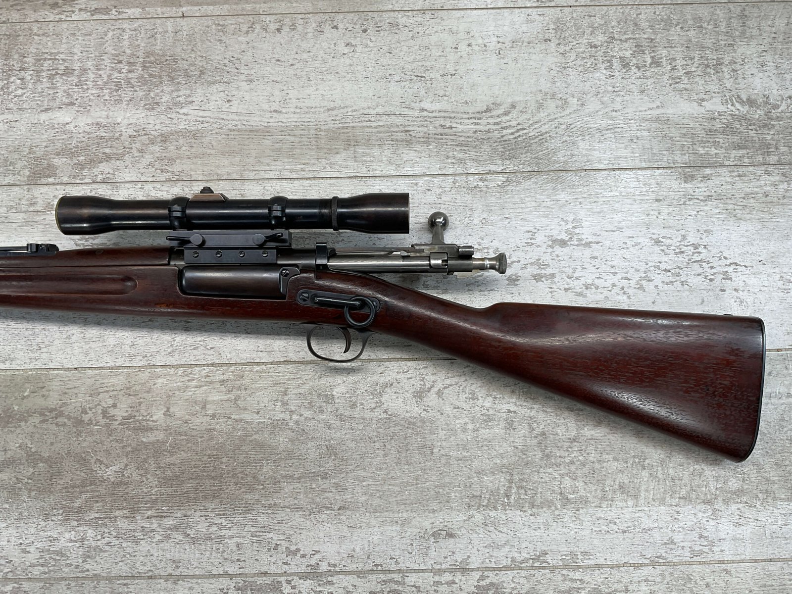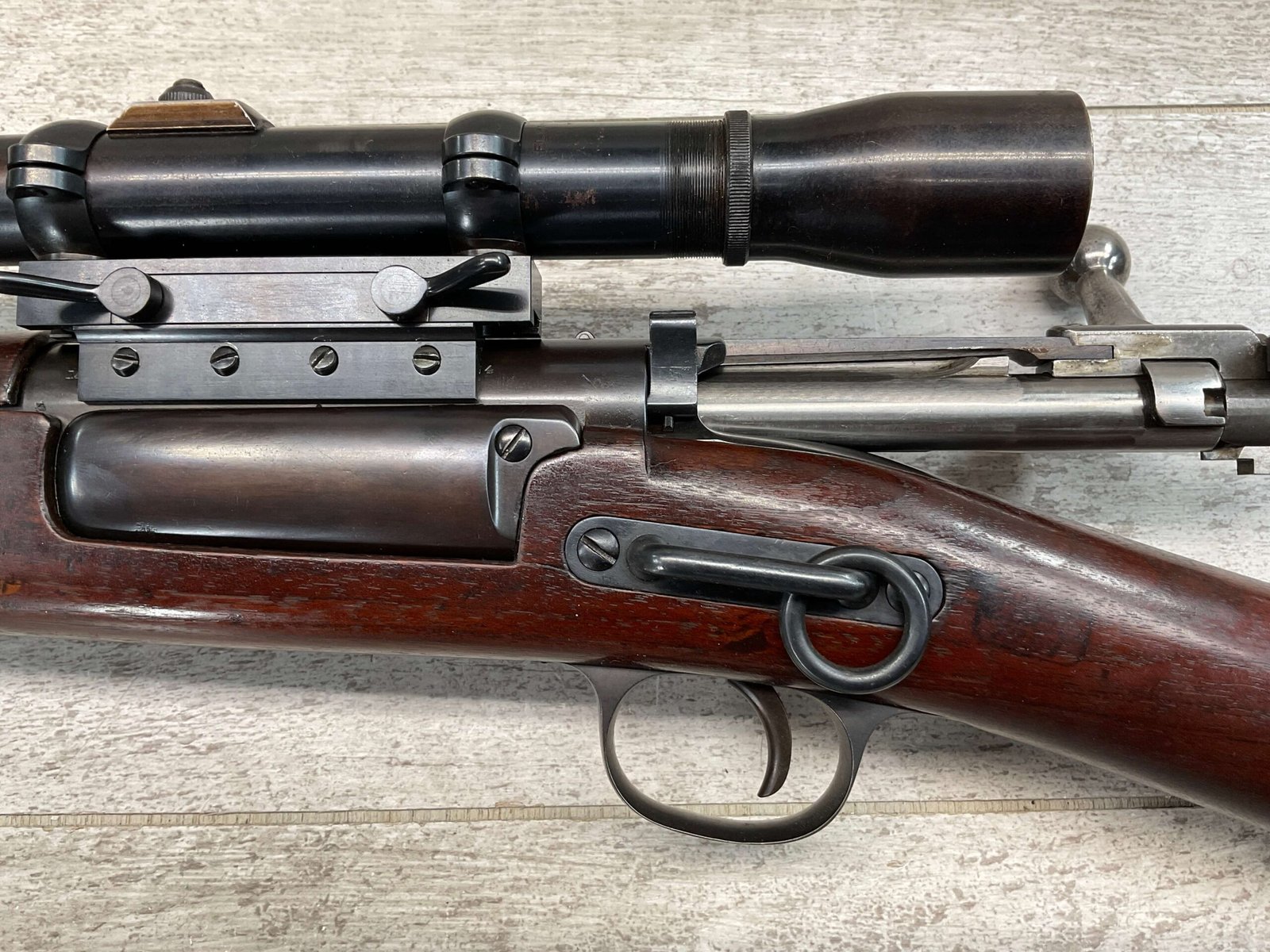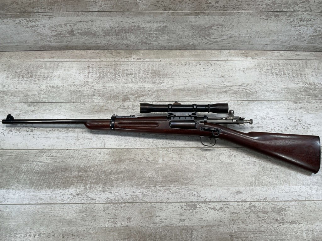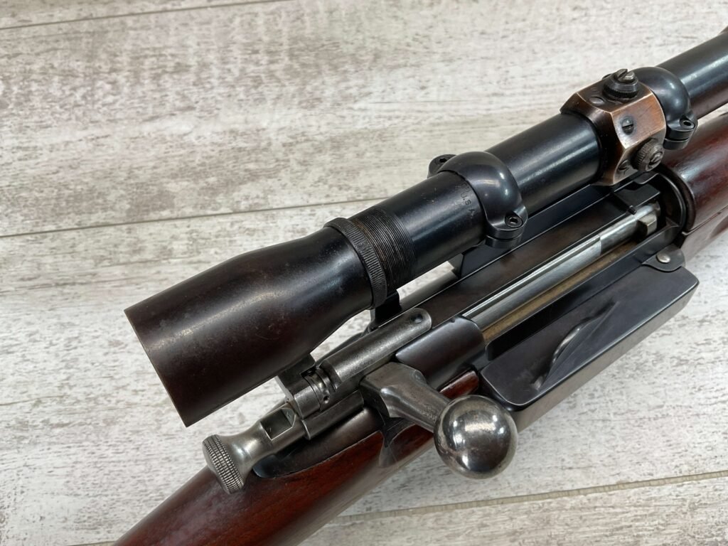 U.S. SPRINGFIELD 30-40 KRAG JORGENSEN MODEL 1898 BOLT ACTION CARBINE RIFLE #218897, BRIGHT BORE W/VG RIFLING, 90+% REFINISHED BLUE, EXC WOOD W/NORMAL DINGS/NICKS, 22″ BBL, REAR SIGHT GRADUATED FROM 7-18, “FLA/1897” CARTOUCHE ON LEFT SIDE, ALL MATCHING, SADDLE RING ON LEFT SIDE OF STOCK, PROFESSIONALLY CONVERTED TO CARBINE INCLUDING CONVERTED BORE TO .33-40,  SIDE MOUNT/QUICK DETACH MOUNT W/WEAVER  SCOPE, NICELY REFINISHED 30-40 KRAG BOLT ACTION RIFLE!!
