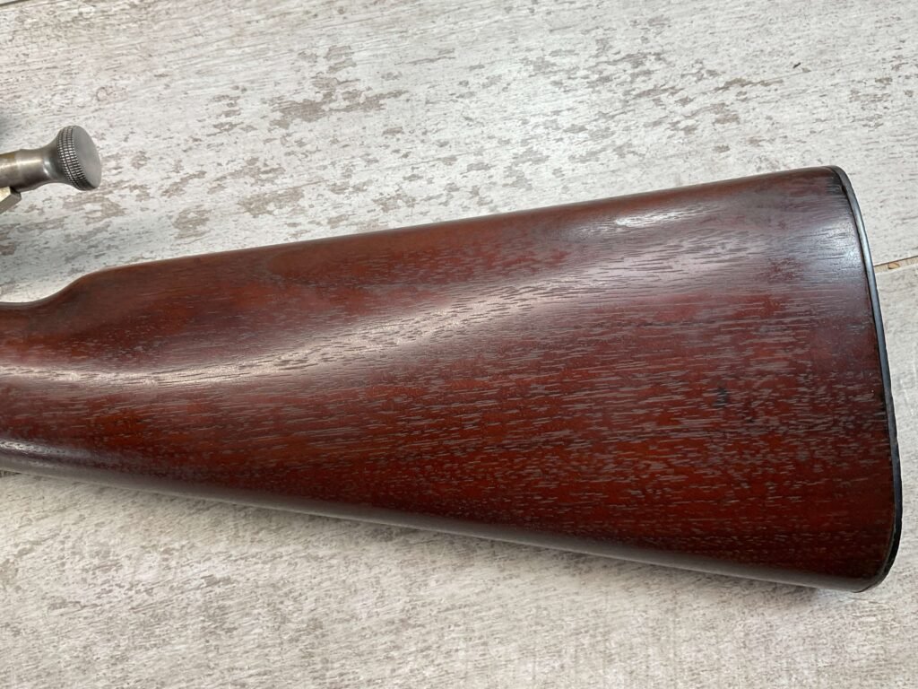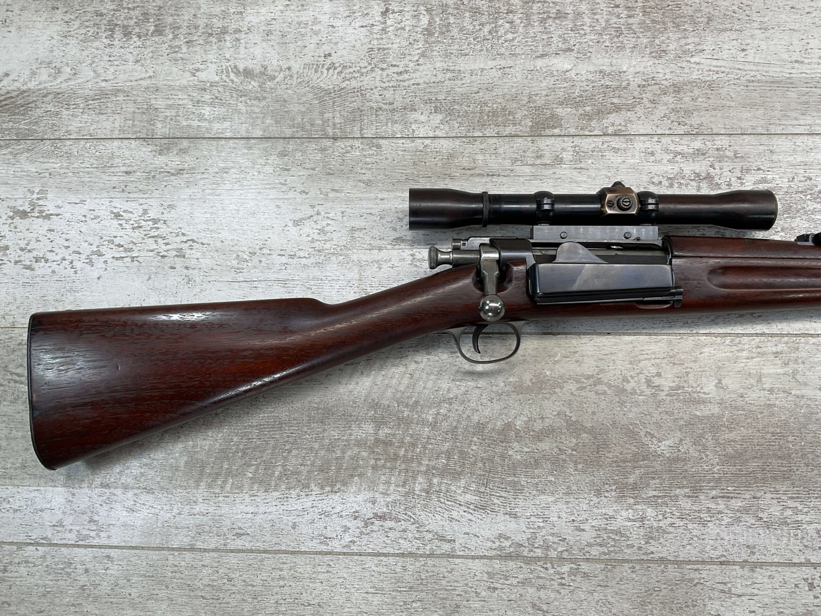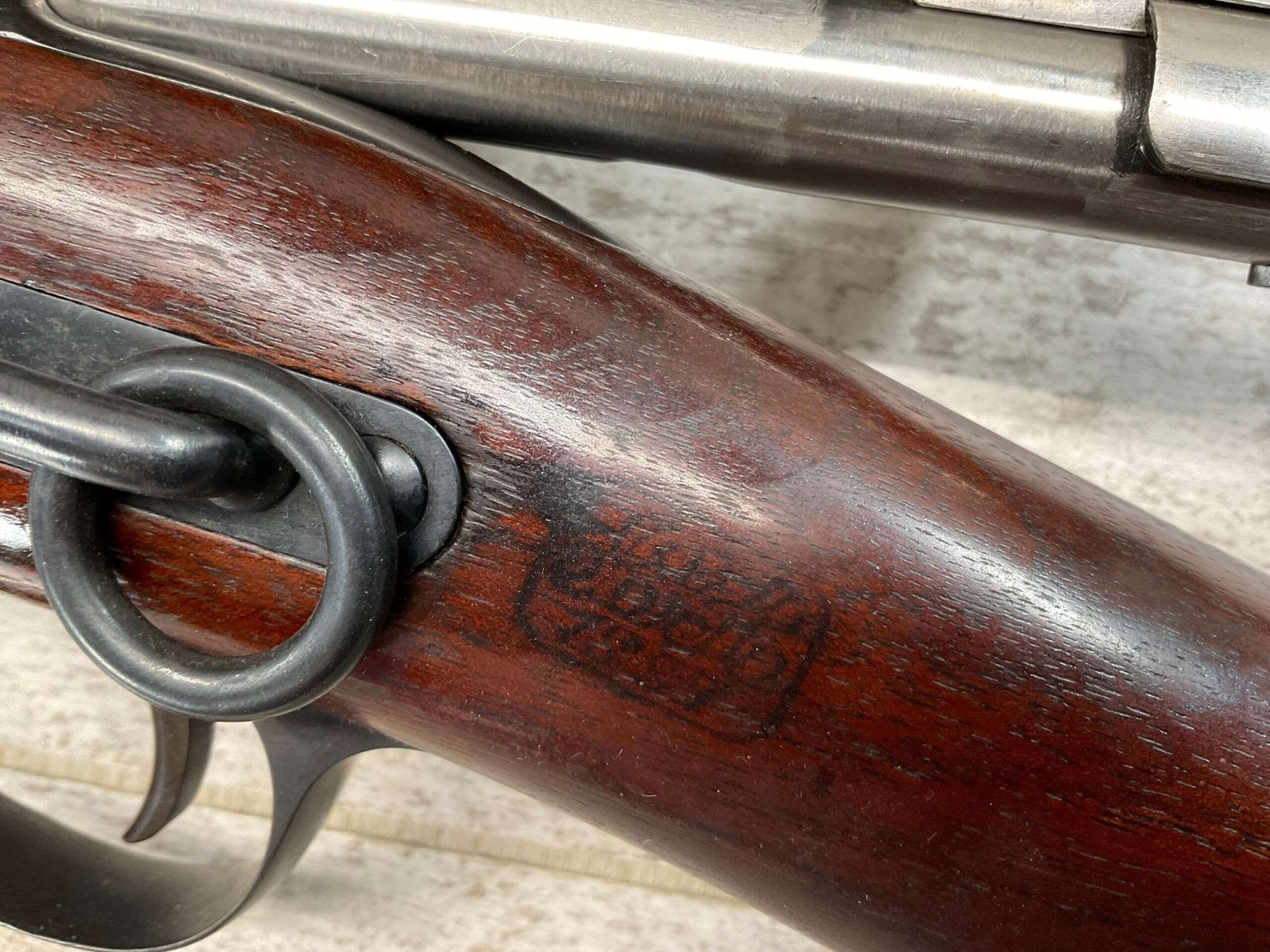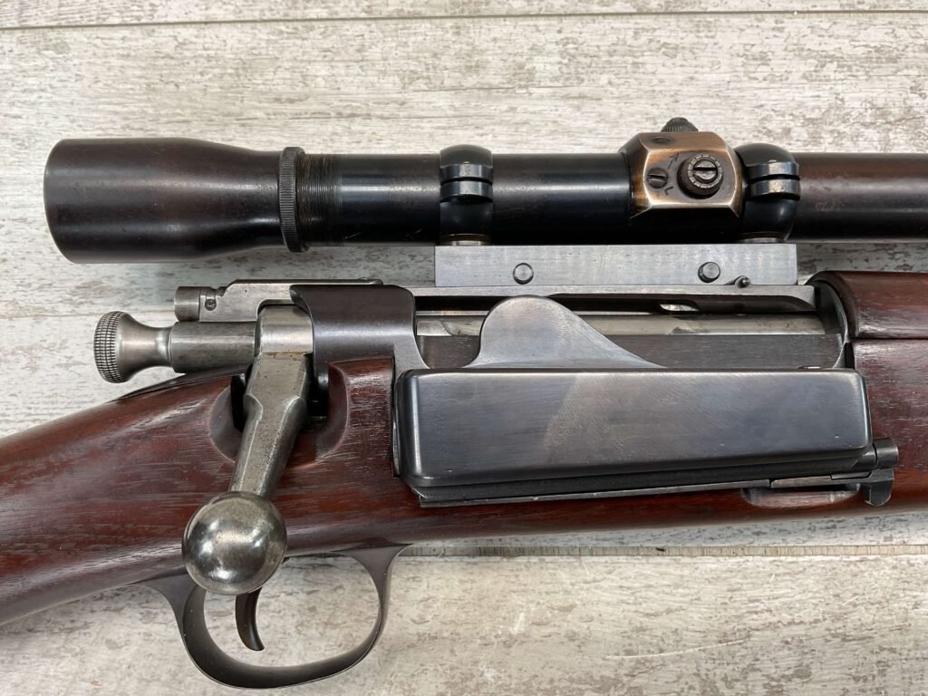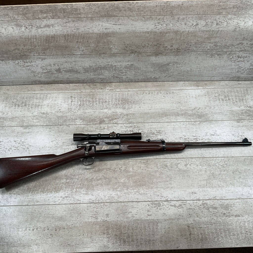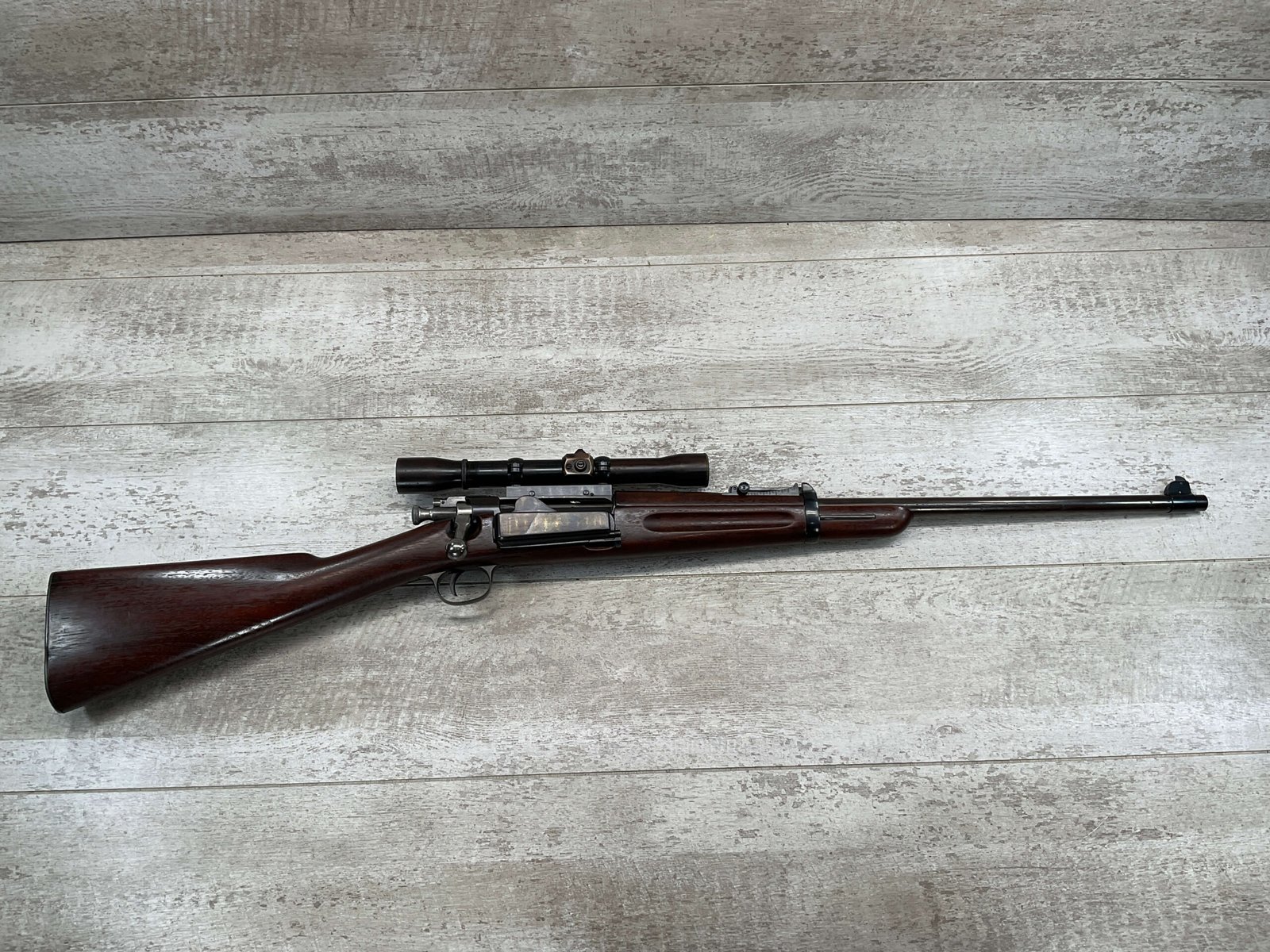 U.S. SPRINGFIELD 30-40 KRAG JORGENSEN MODEL 1898 BOLT ACTION CARBINE RIFLE #218897, BRIGHT BORE W/VG RIFLING, 90+% REFINISHED BLUE, EXC WOOD W/NORMAL DINGS/NICKS, 22″ BBL, REAR SIGHT GRADUATED FROM 7-18, “FLA/1897” CARTOUCHE ON LEFT SIDE, ALL MATCHING, SADDLE RING ON LEFT SIDE OF STOCK, PROFESSIONALLY CONVERTED TO CARBINE INCLUDING CONVERTED BORE TO .33-40,  SIDE MOUNT/QUICK DETACH MOUNT W/WEAVER  SCOPE, NICELY REFINISHED 30-40 KRAG BOLT ACTION RIFLE!!